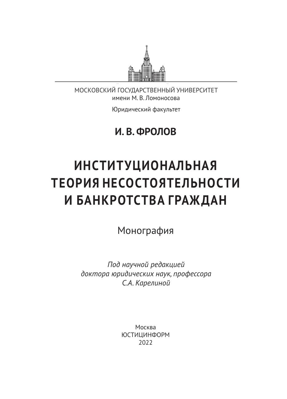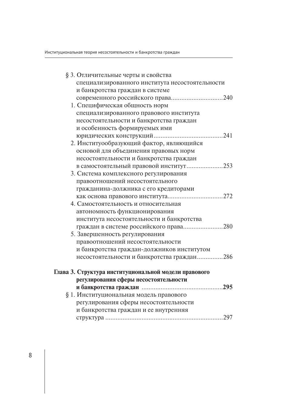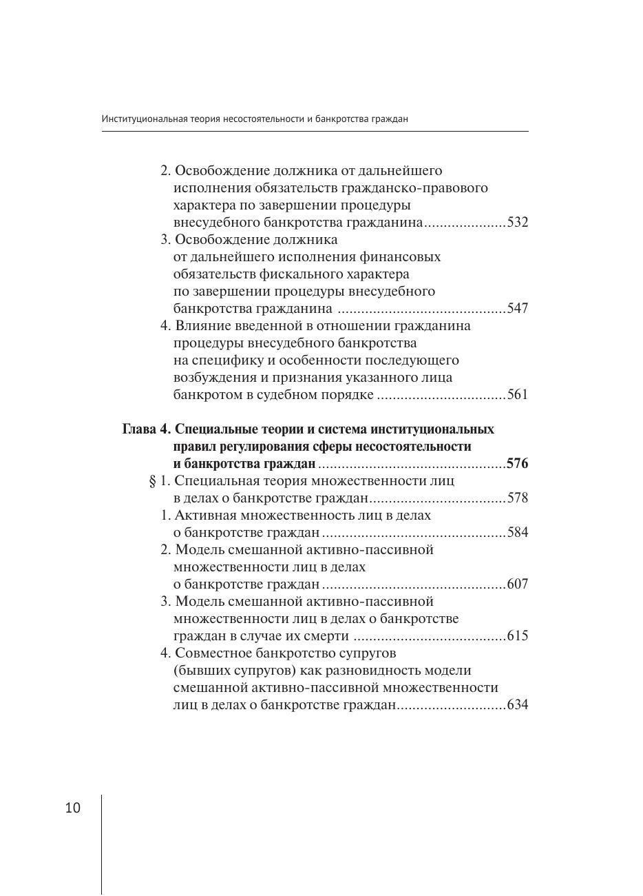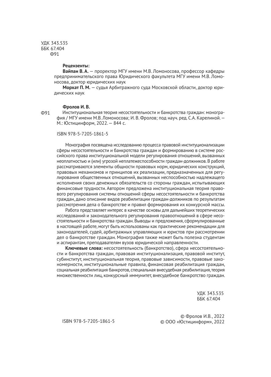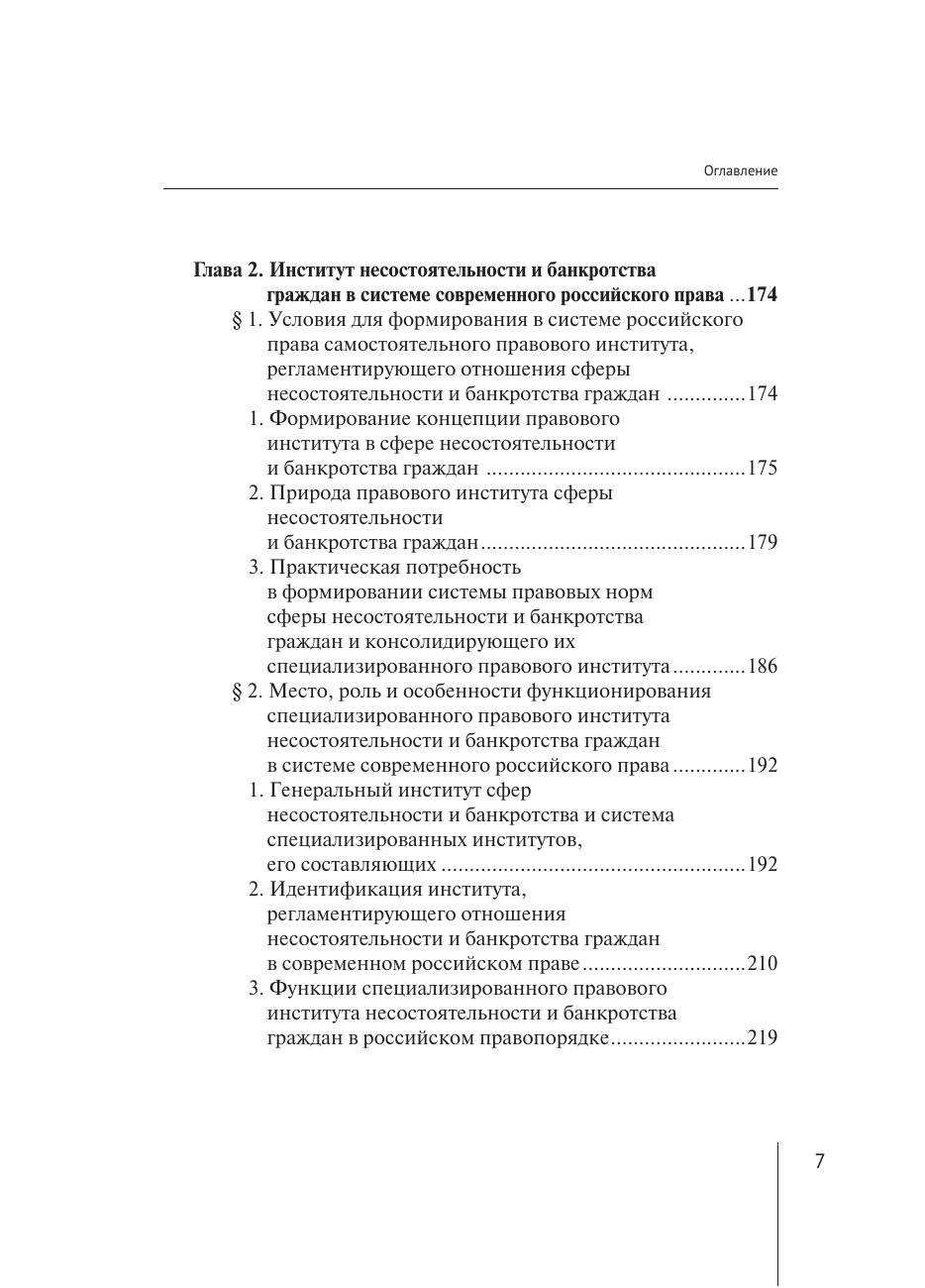 неоплатностью и (или) угрозой неплатежеспособности граждан-должников. В работе рассматриваются элементы общности правовых норм, юридических конструкций, правовых механизмов и принципов их реализации, предназначенных для регулирования общественных отношений, вызванных неспособностью надлежащего исполнения своих денежных обязательств со стороны граждан, испытывающих финансовые трудности. Автором предложена институциональная теория правового регулирования системы отношений сферы несостоятельности и банкротства граждан, дано описание видов реабилитации граждан-должников по результатам рассмотрения дела о банкротстве и правил формирования их конкурсной массы. Работа представляет интерес в качестве основы для дальнейших теоретических исследований и законодательного регулирования правоотношений в сфере несостоятельности и банкротства граждан. Выводы и предложения, сформулированные в настоящей работе, могут быть использованы как практические рекомендации для законодателей, судей, арбитражных управляющих и юристов при рассмотрении дел о банкротстве граждан. Монография также может быть полезна студентам и аспирантам, преподавателям вузов юридической направленности.