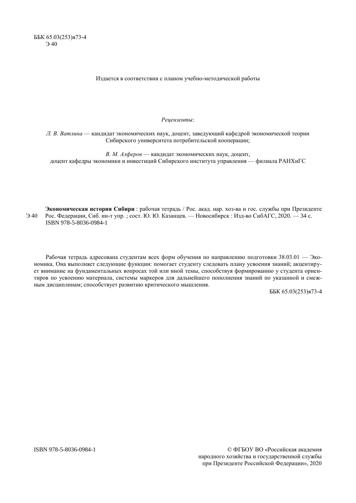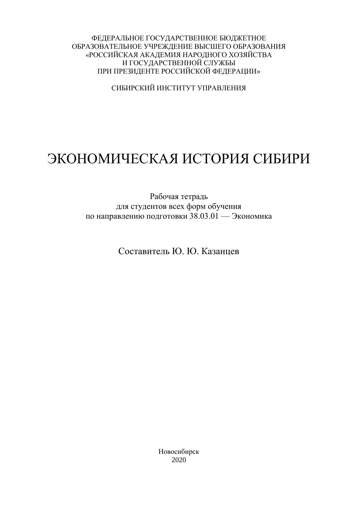 Экономическая история Сибири: рабочая тетрадь