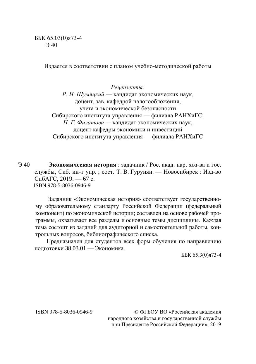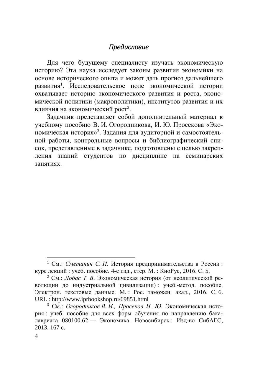 Задачник «Экономическая история» соответствует государственно-му образовательному стандарту Российской Федерации (федеральный компонент) по экономической истории; составлен на основе рабочей про-граммы, охватывает все разделы и основные темы дисциплины. Каждая тема состоит из заданий для аудиторной и самостоятельной работы, кон-трольных вопросов, библиографического списка. Предназначен для студентов всех форм обучения по направлению подготовки 38.03.01 — Экономика.