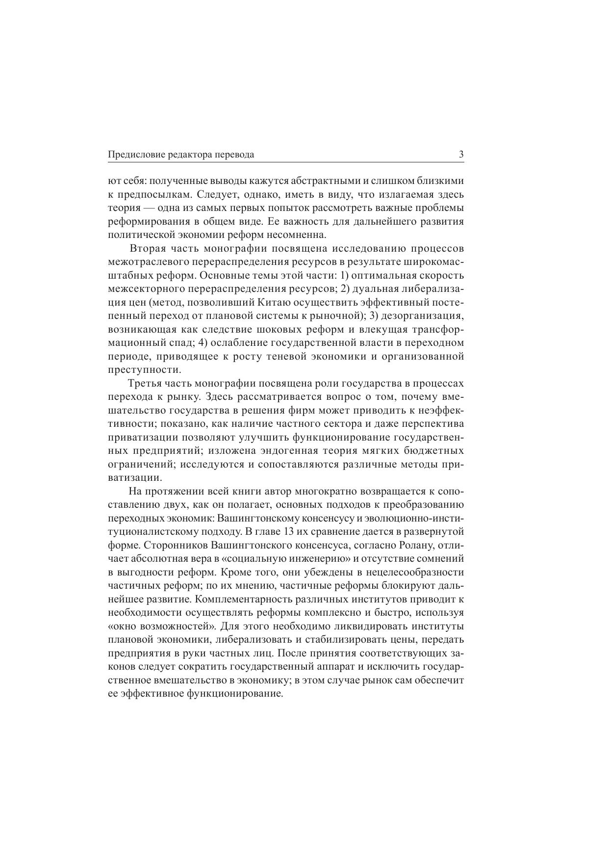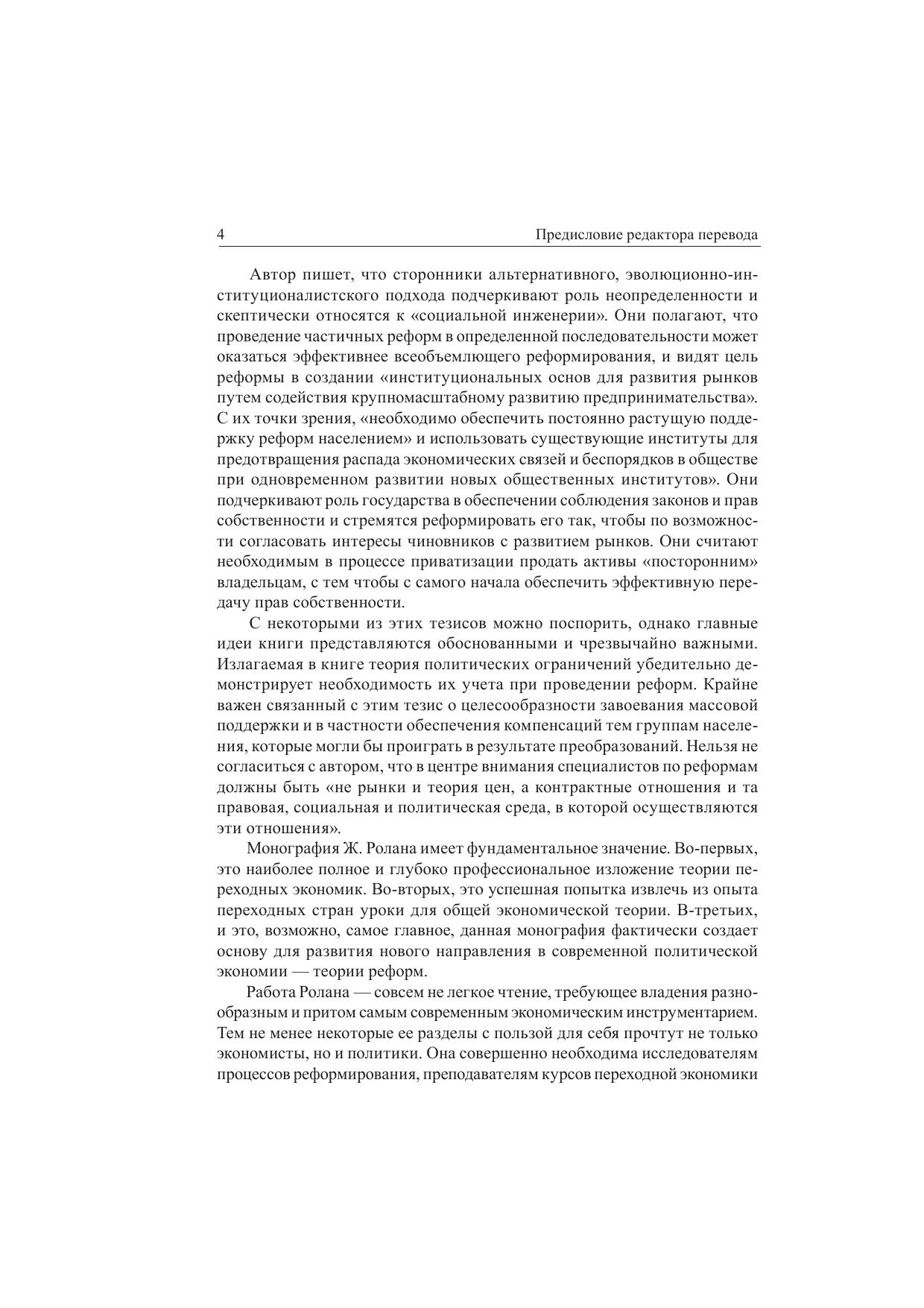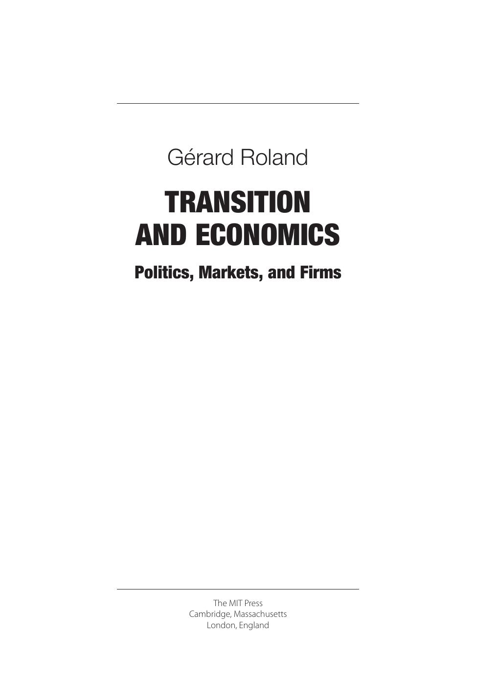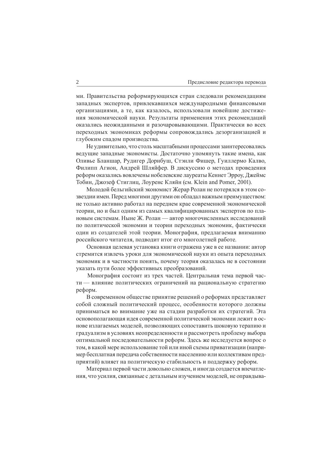 Жерар Ролан — автор многочисленных исследований по политической экономии и теории переходных экономик, фактически один из создателей этой теории. Книга, предлагаемая вниманию российского читателя, подводит итог его многолетней работе. Монография Ж. Ролана имеет фундаментальное значение. Во-первых, это наиболее полное и глубоко профессиональное изложение теории переходных экономик. Во-вторых, это успешная попытка извлечь из опыта переходных стран уроки для общей экономической теории. В-третьих, — и это, возможно, самое главное — данная монография фактически создает основу для развития нового направления в современной политической экономии — теории реформ. Работа Ролана — совсем не легкое чтение, требующее владения разнообразным и при этом самым современным экономическим инструментарием. Тем не менее некоторые ее разделы с пользой для себя прочтут не только экономисты, но и политики. Для исследователей процессов реформирования, преподавателей курсов переходной экономики и институционального анализа, а также для студентов старших курсов, магистрантов и аспирантов экономических специальностей.