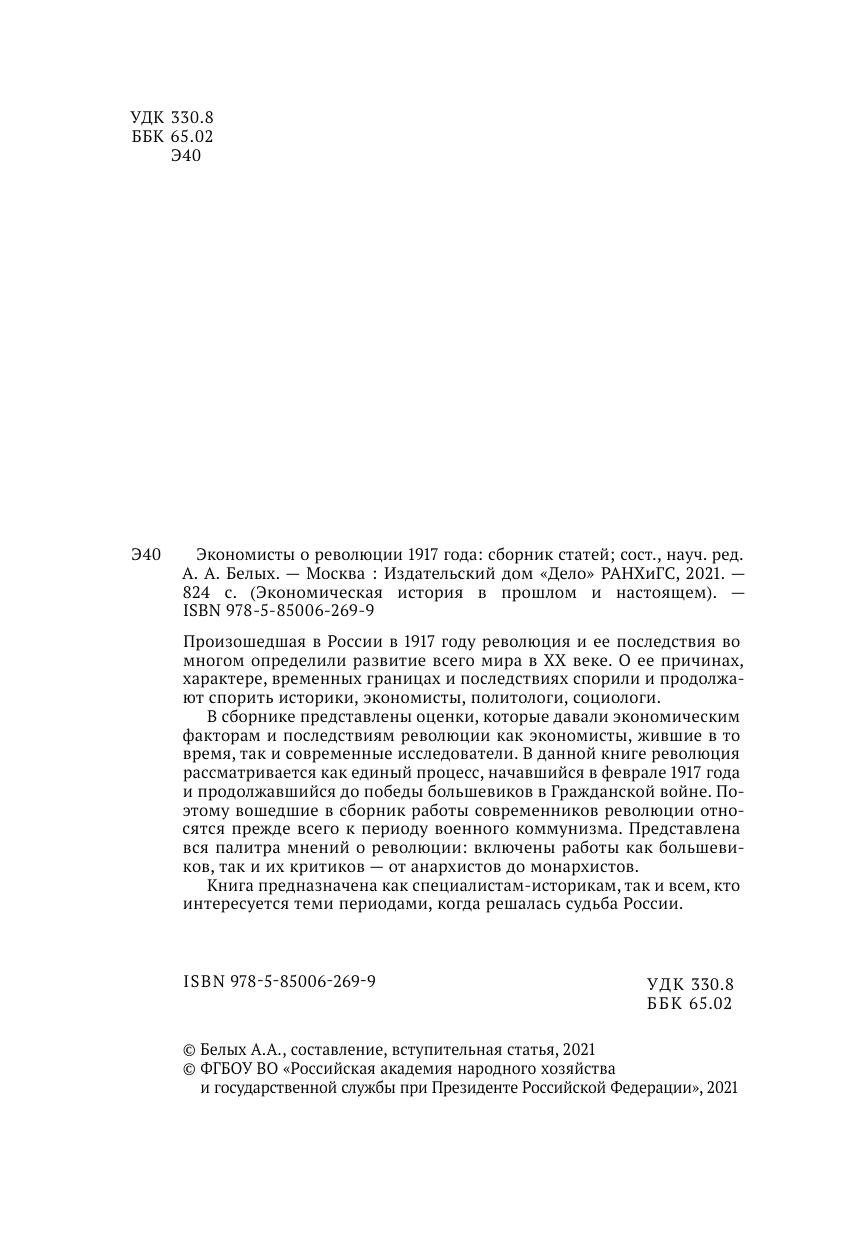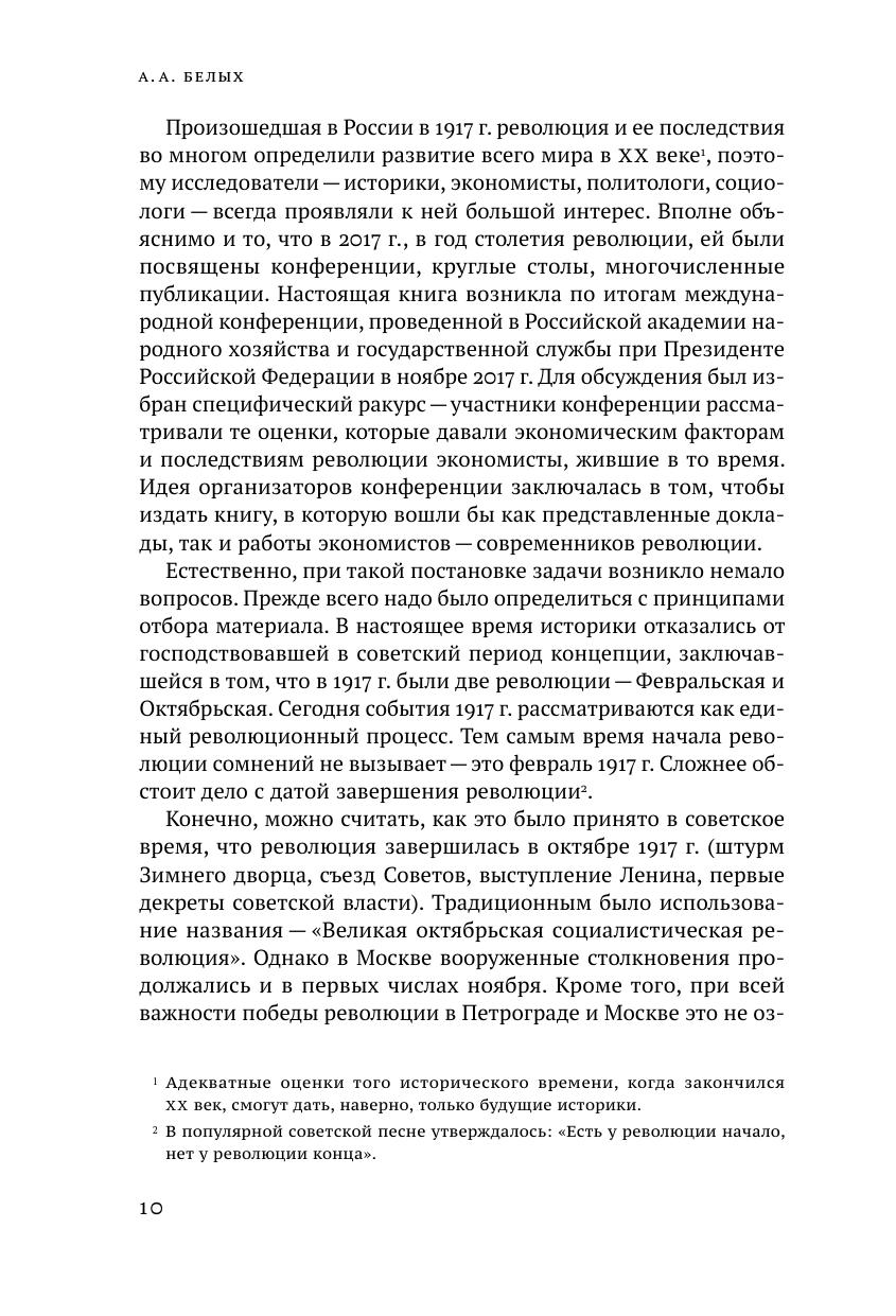 В сборнике представлены оценки, которые давали экономическим факторам и последствиям революции как экономисты, жившие в то время, так и современные исследователи. В данной книге революция рассматривается как единый процесс, начавшийся в феврале 1917 года и продолжавшийся до победы большевиков в Гражданской войне. Поэтому вошедшие в сборник работы современников революции отно-сятся прежде всего к периоду военного коммунизма. Представлена вся палитра мнений о революции: включены работы как большевиков, так и их критиков — от анархистов до монархистов.