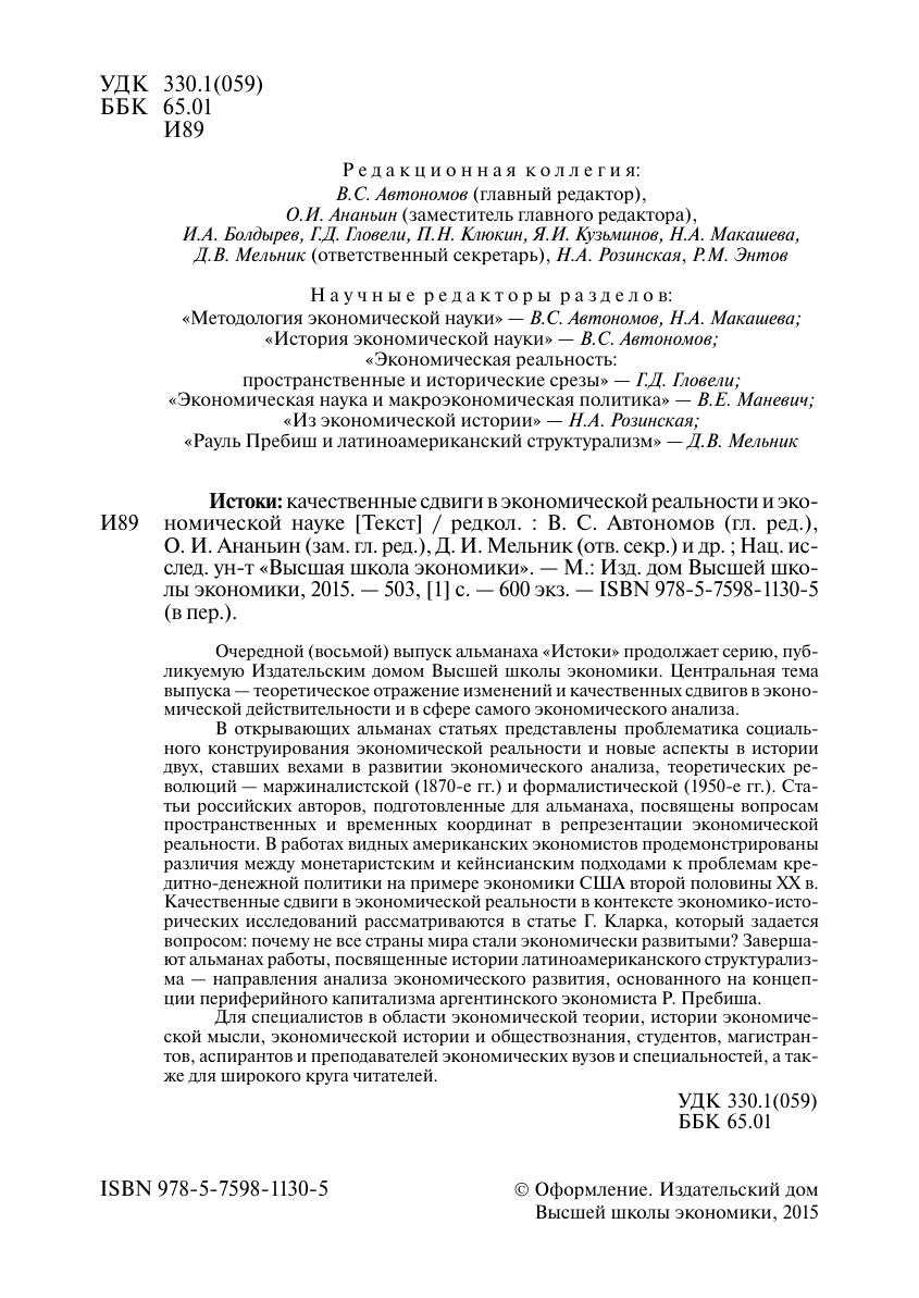 Очередной (восьмой) выпуск альманаха «Истоки» продолжает серию, публикуемую Издательским домом Высшей школы экономики. Центральная тема выпуска — теоретическое отражение изменений и качественных сдвигов в экономической действительности и в сфере самого экономического анализа. В открывающих альманах статьях представлены проблематика социального конструирования экономической реальности и новые аспекты в истории двух, ставших вехами в развитии экономического анализа, теоретических революций — маржиналистской (1870-е гг.) и формалистической (1950-е гг.). Статьи российских авторов, подготовленные для альманаха, посвящены вопросам пространственных и временных координат в репрезентации экономической реальности. В работах видных американских экономистов продемонстрированы различия между монетаристским и кейнсианским подходами к проблемам кредитно-денежной политики на примере экономики США второй половины ХХ в. Качественные сдвиги в экономической реальности в контексте экономико-исторических исследований рассматриваются в статье Г. Кларка, который задается вопросом: почему не все страны мира стали экономически развитыми? Завершают альманах работы, посвященные истории латиноамериканского структурализма — направления анализа экономического развития, основанного на концепции периферийного капитализма аргентинского экономиста Р. Пребиша. Для специалистов в области экономической теории, истории экономической мысли, экономической истории и обществознания, студентов, магистрантов, аспирантов и преподавателей экономических вузов и специальностей, а также для широкого круга читателей.