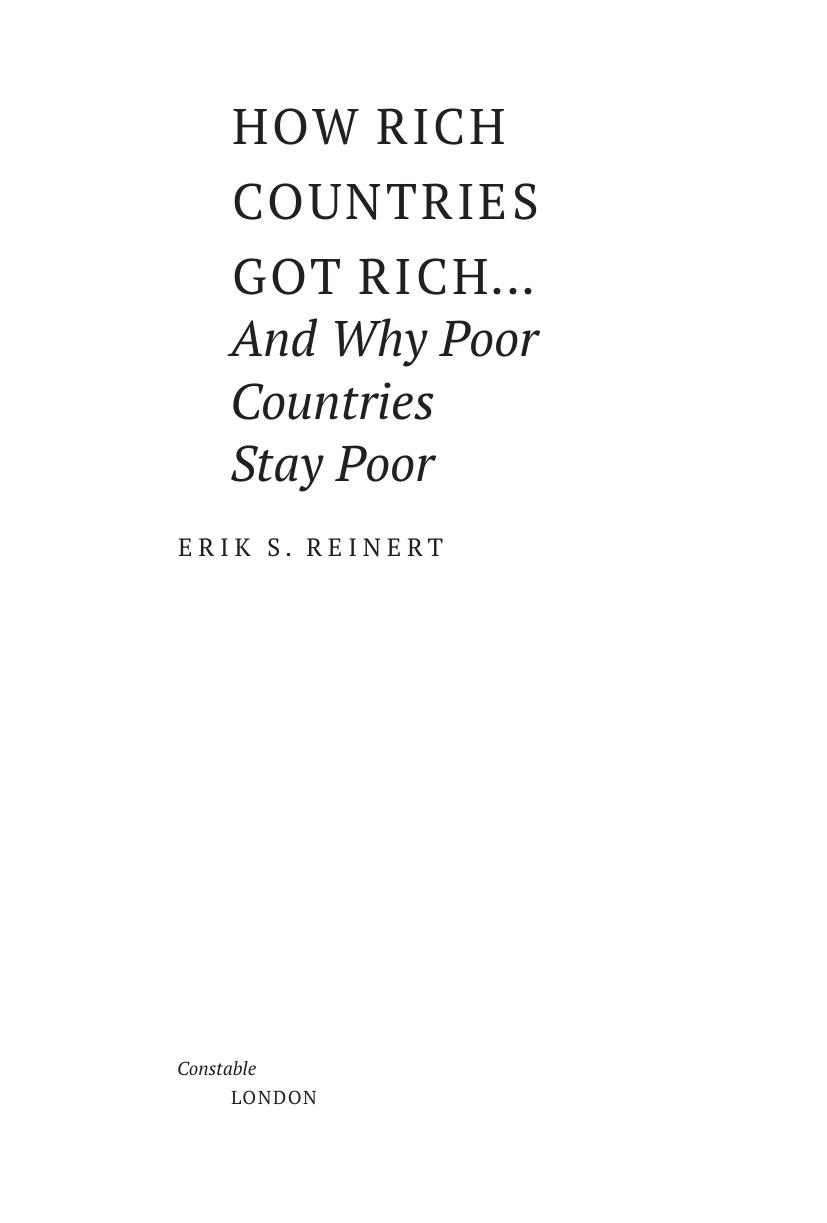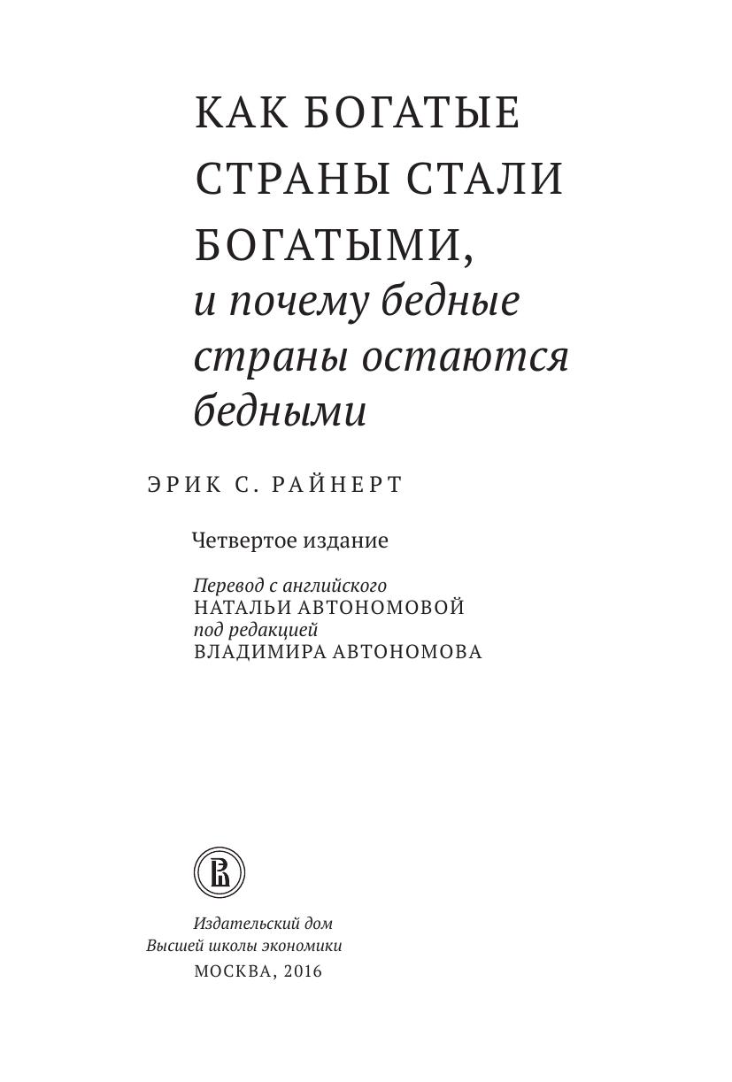 В настоящей книге известный норвежский экономист Эрик Райнерт показывает, что богатые страны стали богатыми благодаря сочетанию государственного вмешательства, протекционизма и стратегических инвестиций, а не благодаря свободной торговле. По утверждению автора, именно такая политика была залогом успешного экономического развития, начиная с Италии эпохи Возрождения и заканчивая сегодняшними странами Юго-Восточной Азии. Показывая, что современные экономисты игнорируют этот подход, настаивая и на важности свободной торговли, Райнерт объясняет это давним расколом в экономической науке между континентально-европейской традицией, ориентированной на комплексную государственную политику, с одной стороны, и англо-американской, ориентированной на свободную торговлю, — с другой. Написанная доступным языком, книга представляет интерес не только для специалистов по экономической истории и теории, но и для широкого круга читателей.