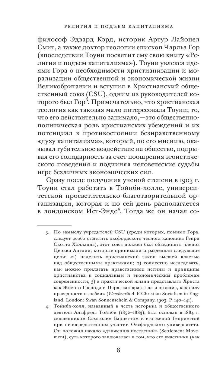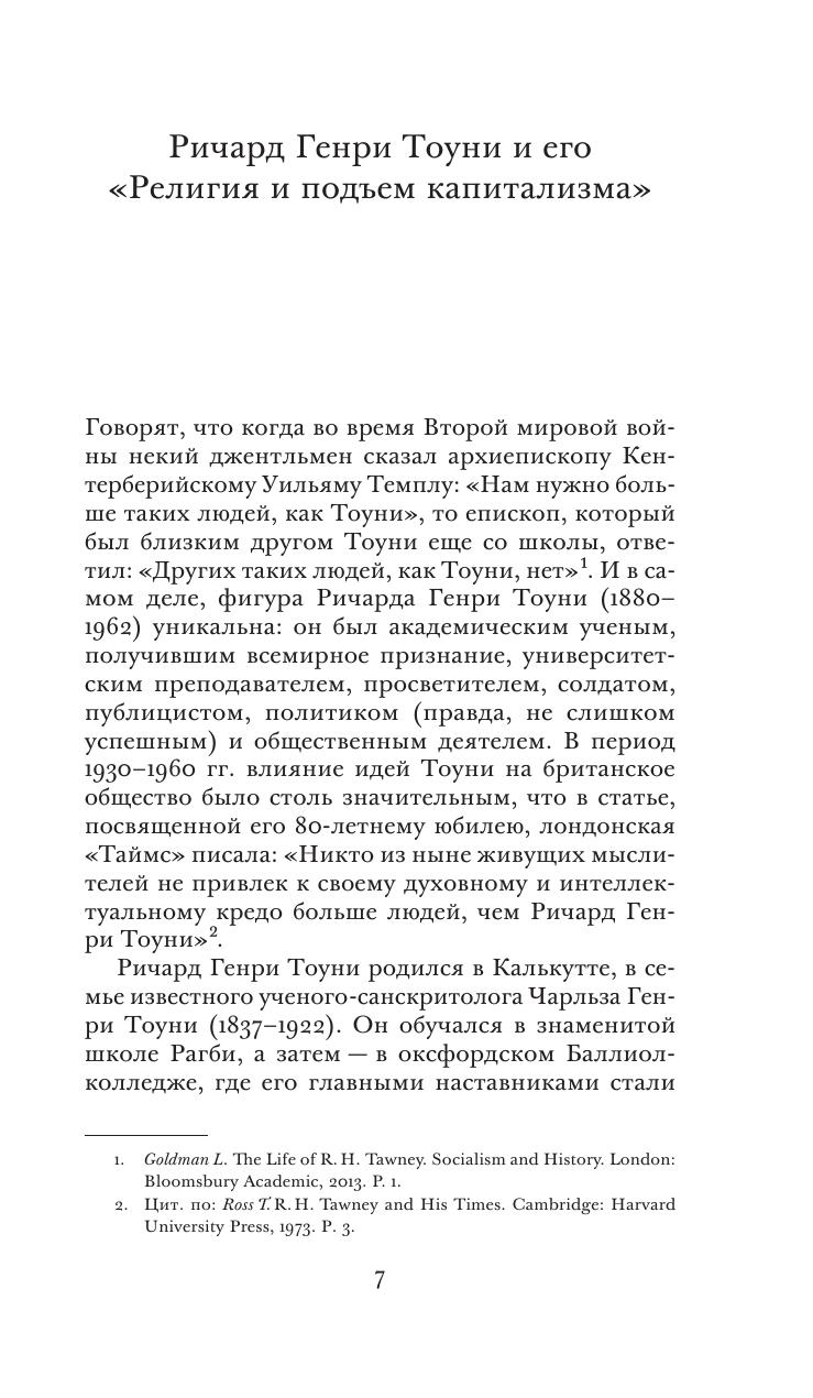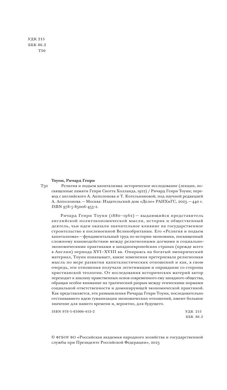 Ричард Генри Тоуни (1880–1962) — выдающийся представитель английской политэкономической мысли, историк и общественный деятель, чьи идеи оказали значительное влияние на государственное строительство в послевоенной Великобритании. Его «Религия и подъем капитализма» — фундаментальный труд по истории экономики, посвященный сложному взаимодействию между религиозными догмами и социально- экономическими практиками в западноевропейских странах (прежде всего в Англии) периода XVI–XVIII вв. Опираясь на богатый эмпирический материал, Тоуни показывает, какие изменения претерпевала религиозная мысль по мере развития капиталистических отношений и как, в свою очередь, эти отношения получали легитимацию и оправдание со стороны христианской теологии. От исследования исторических материй автор переходит к анализу нравственных основ современного ему западного общества, обращая особое внимание на трагический разрыв между этическими нормами социальной ответственности и доминирующей экономической практикой. Как представляется, эти размышления Ричарда Генри Тоуни, последовательно отстаивавшего идею гуманизации экономических отношений, имеют большое значение для нашего времени и, вероятно, для будущего.