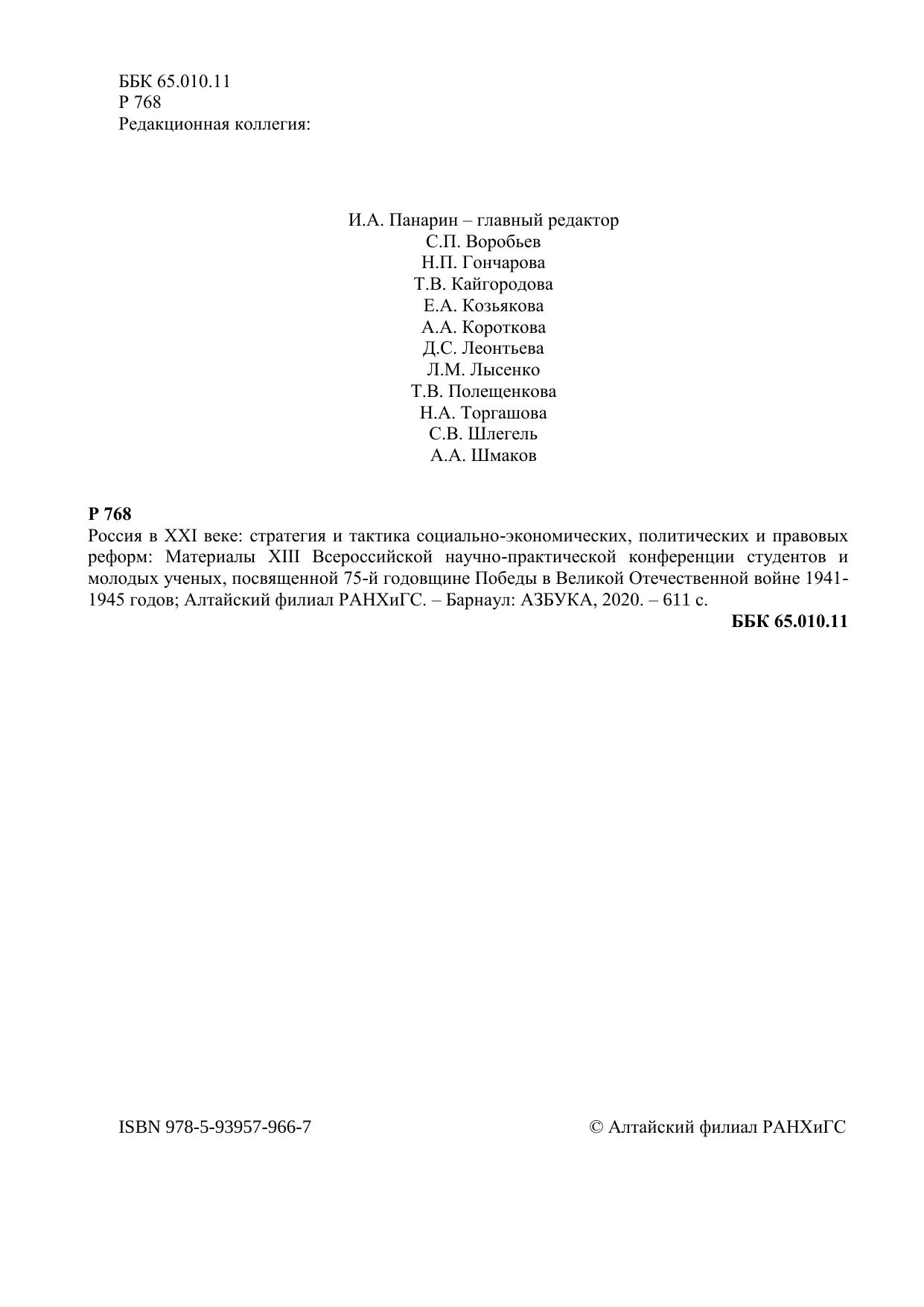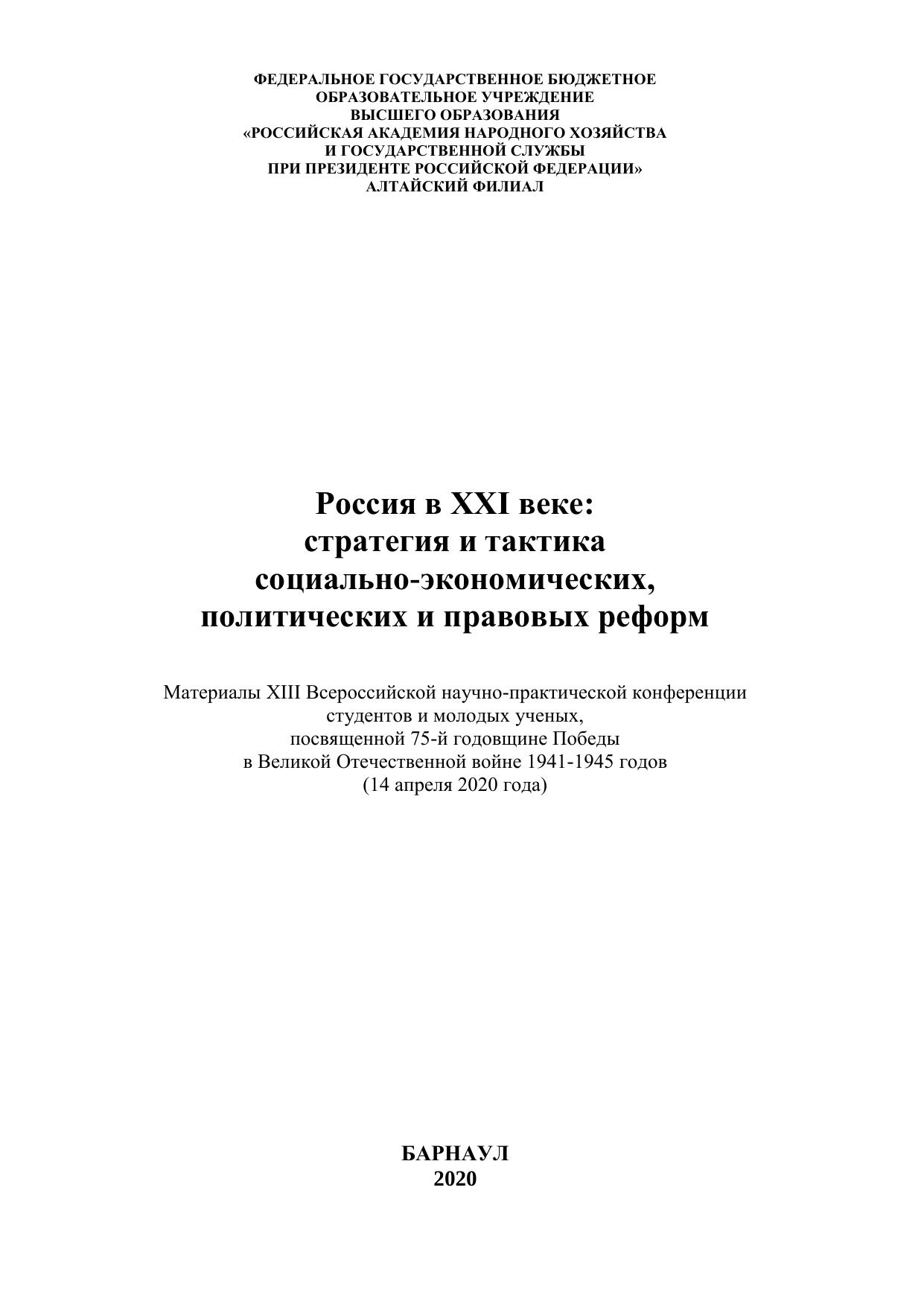 Россия в XXI веке: стратегия и тактика социально-экономических, политических и правовых реформ: Материалы XIII Всероссийской научно-практической конференции студентов и молодых ученых, посвященной 75-й годовщине Победы в Великой Отечественной войне 1941- 1945 годов