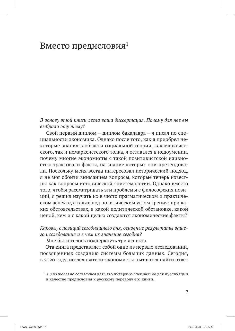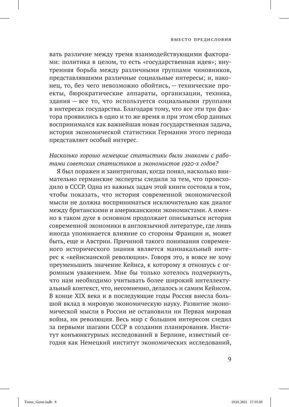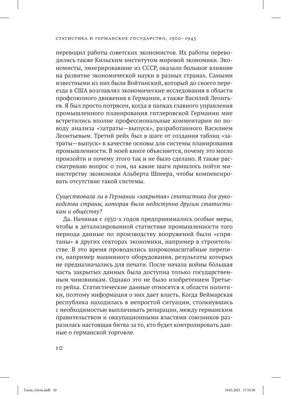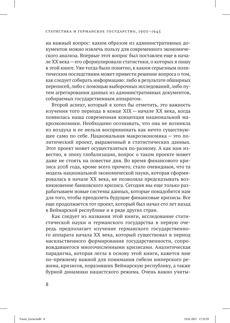 В книге Адама Туза анализируется драматичный период, с 1900 года и до конца Второй мировой войны, в течение которого в статистические исследования внедрялись инновационные подходы. На рубеже веков практически нигде еще не существовало экономической статистики в том виде, в котором она знакома нам сегодня. К 1944 году для управления экономикой военного периода на вооружение был принят весь арсенал современной экономической статистики. Как продемонстрировано в этой книге, в период между Первой и Второй мировыми войнами как Веймарская республика, так и Третий рейх находились на переднем крае инновационных статистических разработок. Новые способы измерения экономических параметров появились, с одной стороны, благодаря современному развитию макроэкономической теории, а с другой — в связи с тем, что они были чрезвычайно нужны правительству. Во времена Веймарской республики самым активным образом осуществлялись макроэкономические исследования. При нацистском режиме этому статистическому инструментарию было суждено создать основу для самых смелых экспериментов в экономическом планировании.