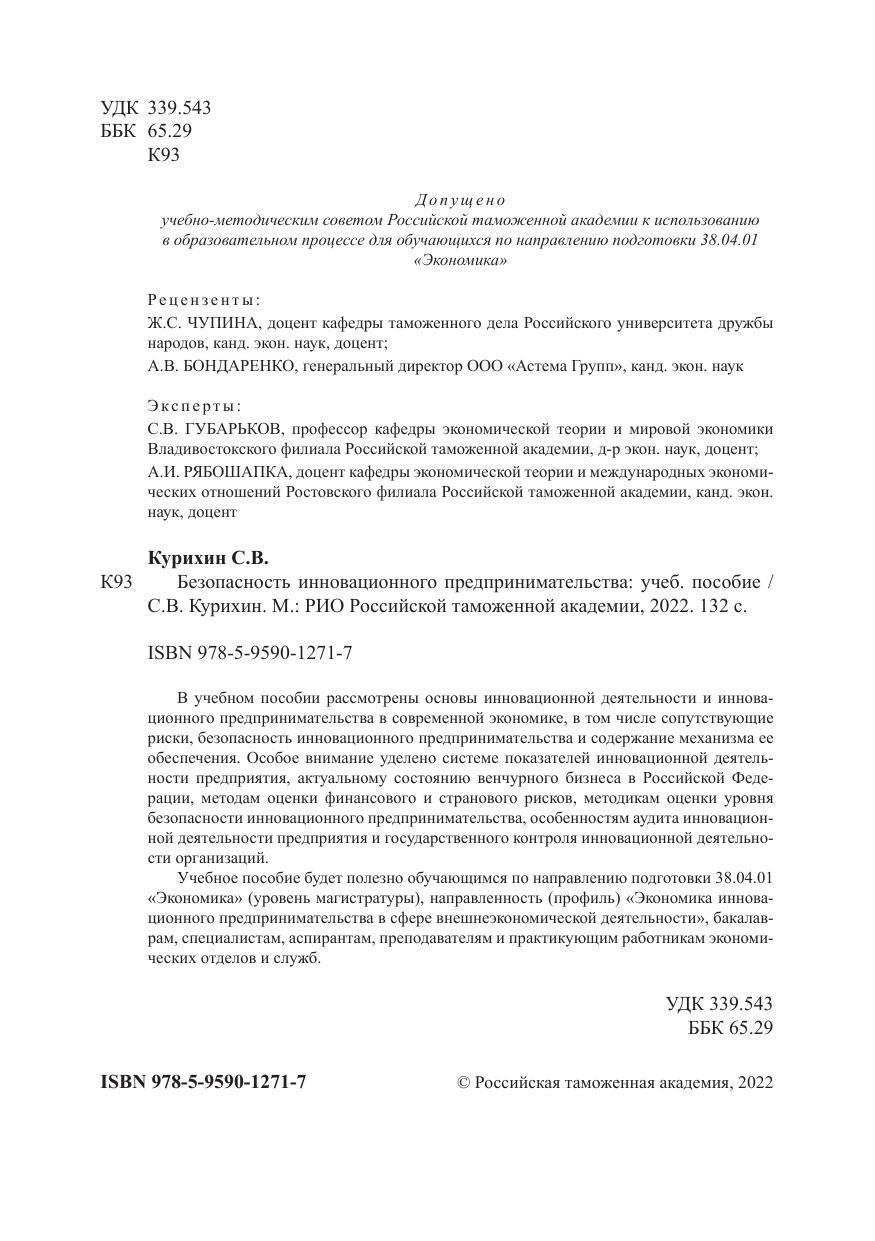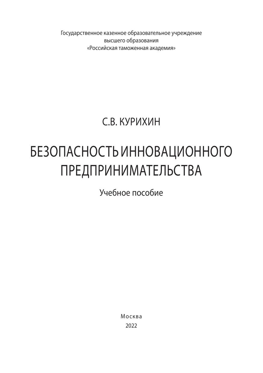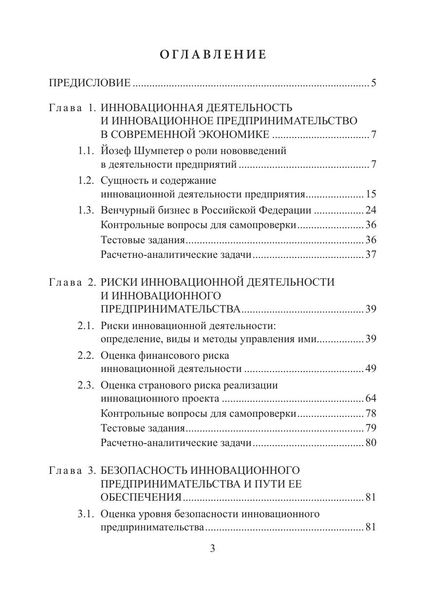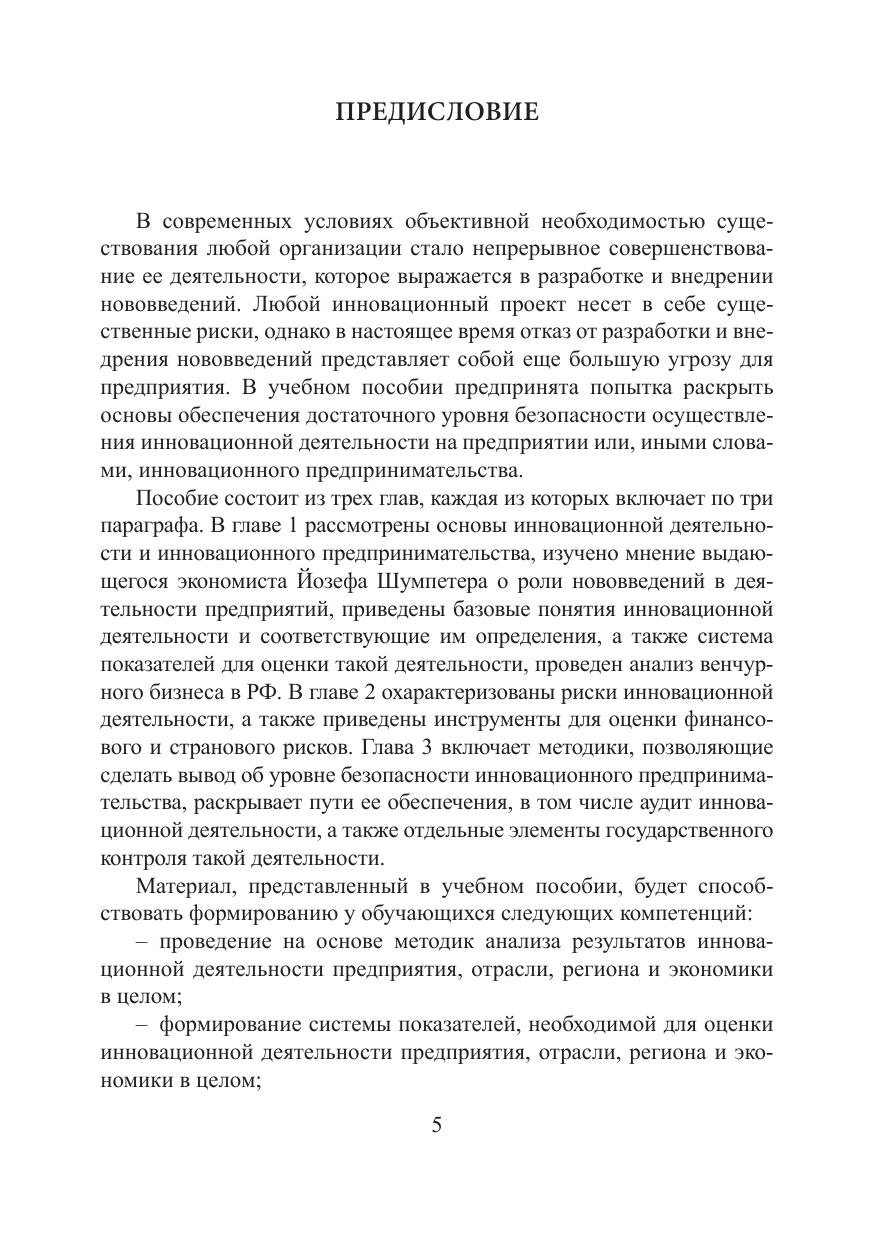 риски, безопасность инновационного предпринимательства и содержание механизма ее обеспечения. О собое внимание уделено системе показателей инновационной деятельности предприятия, актуальному состоянию венчурного бизнеса в Российской Федерации, методам оценки финансового и странового рисков, методикам оценки уровня безопасности инновационного предпринимательства, особенностям аудита инновационной деятельности предприятия и государственного контроля инновационной деятельности организаций.