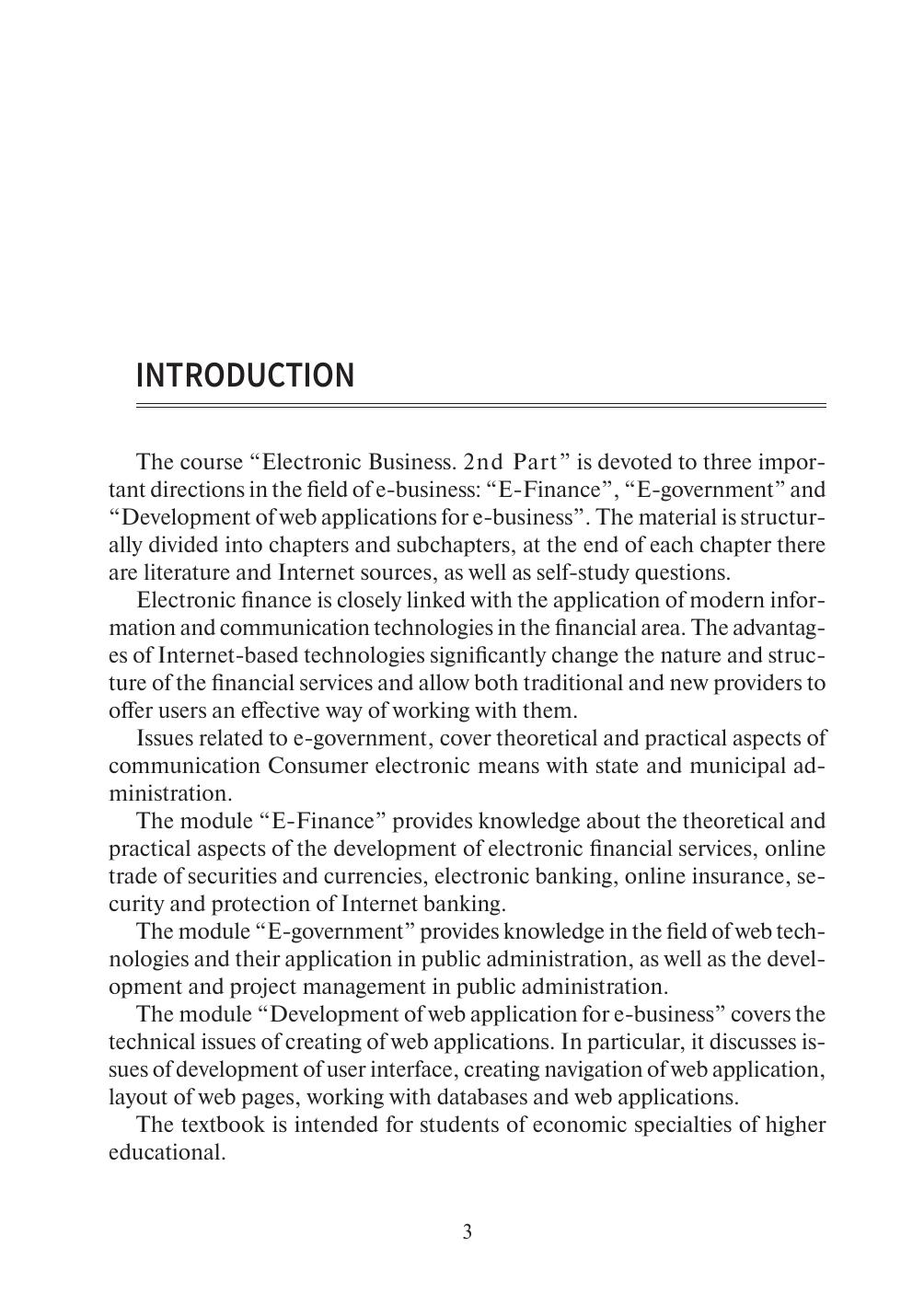 Учебное пособие посвящено трем основным аспектам электронного бизнеса: «Электронные финансы», «Электронное правительство» и «Разработка веб-приложения для электронного бизнеса». Модуль «Электронные финансы» дает знания о теоретических и практических аспектах развития электронных финансовых услуг, онлайн-торговли ценными бумагами и валютой, об электронном банкинге, интернет-страховании, безопасности и защите интернет-банкинга. Модуль «Электронное правительство» освещает области веб-технологий, их применения в государственном управлении, а также разработки и управления проектами. Модуль «Разработка веб-приложений для электронного бизнеса» посвящен техническим вопросам создания веб-приложений. В частности, обсуждаются вопросы разработки пользовательского интерфейса, создания навигации веб-приложений, верстки веб-страниц, работы с базами данных в веб-приложениях. Учебное пособие предназначено для студентов экономических специальностей.
