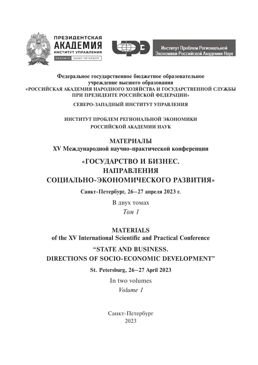 Государство и бизнес. Направления социально-экономического развития: материалы XV Международной научно-практической конференции. Санкт- Петербург, 26–27 апреля 2023 г. — В 2 т. — Т. 1