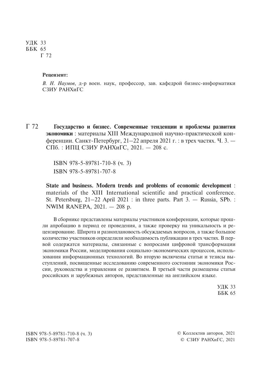 Государство и бизнес. Современные тенденции и проблемы развития экономики: материалы XIII Международной научно-практической конференции. Санкт-Петербург, 21–22 апреля 2021 г.: в трех частях. Ч. 3