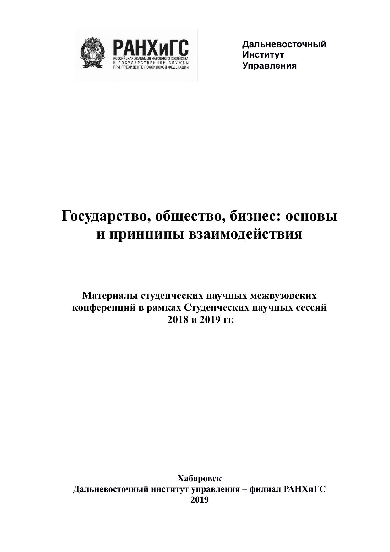 Сборник содержит работы студентов участников Х II и Х III студенческих научных межвузовских конференций «Государство, общество, бизнес: основы и принципы взаимодействия», проведенных в Д альневосточном институте управления филиале РАНХиГС в рамках Сту денческих научных сессий 2018 и 2019 гг. Содержание статей отражает отношение студентов к вопросам взаимодействия государства, коммерческих структур и населения в различных координатах.