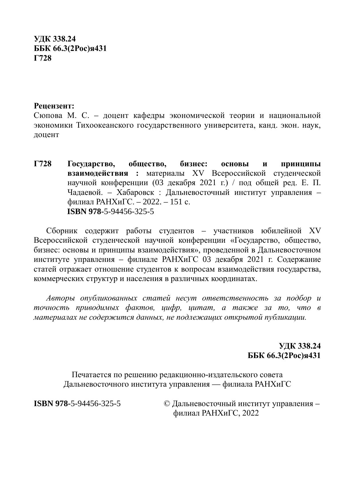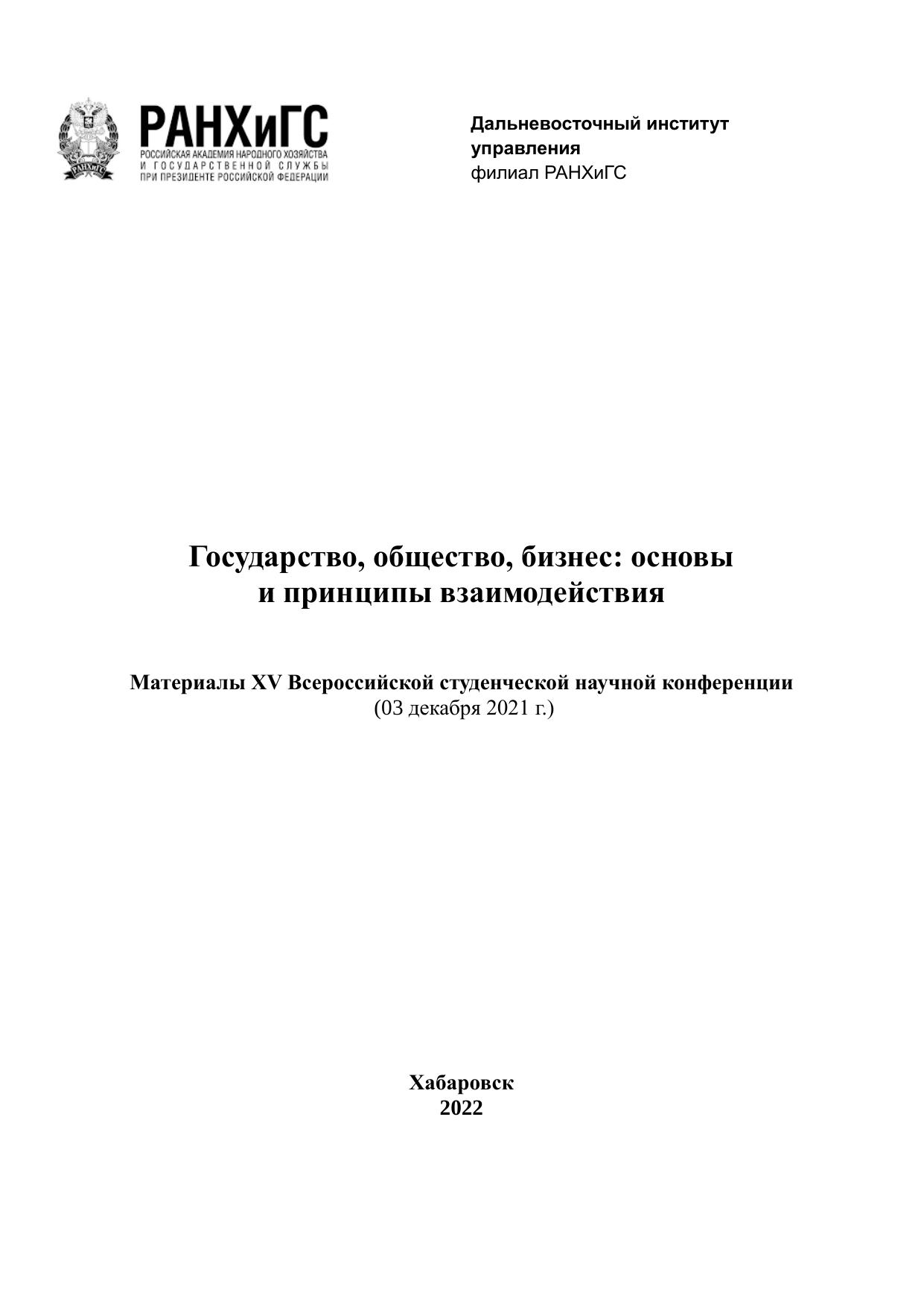 Государство, общество, бизнес: основы и принципывзаимодействия: материалы ХV Всероссийской студенческой научной конференции (03 декабря 2021 г.)