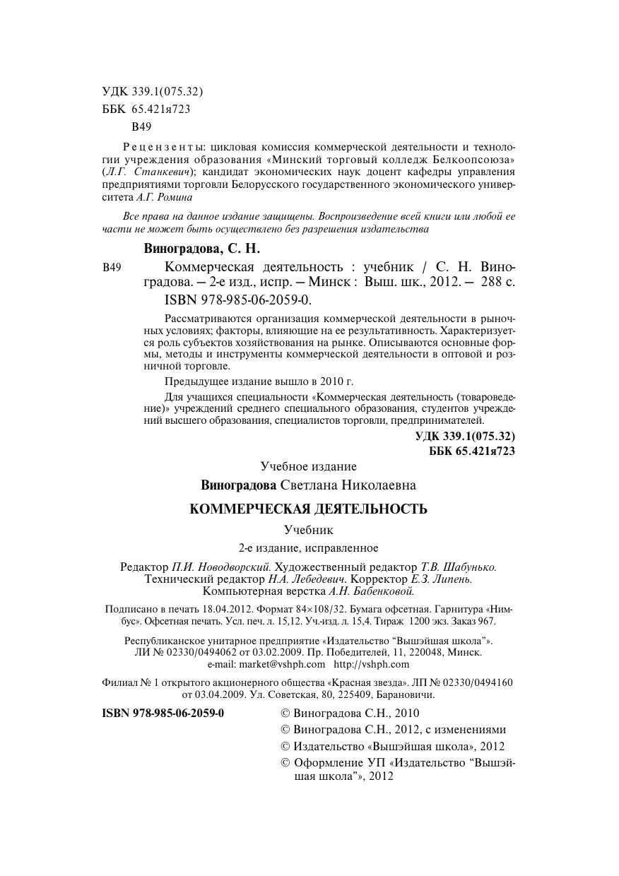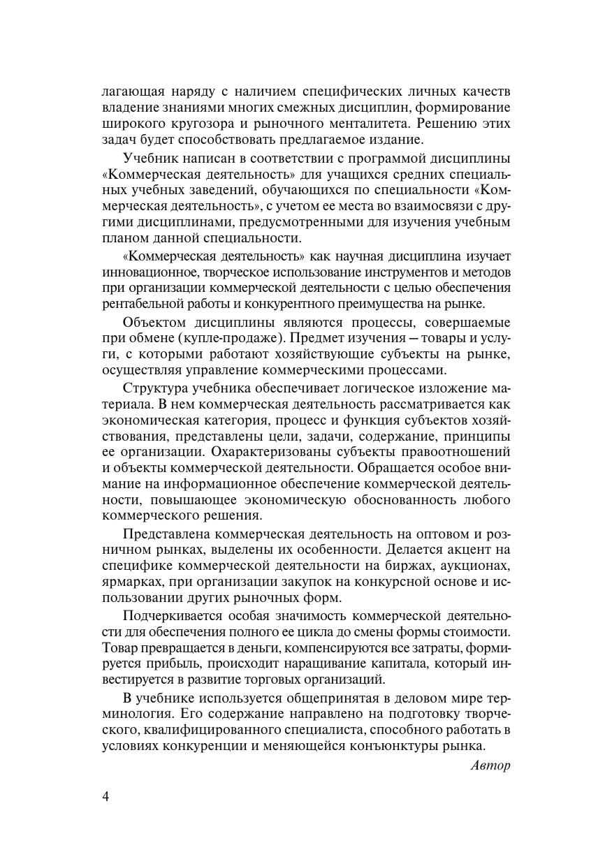 Рассматриваются организация коммерческой деятельности в рыночных условиях факторы, влияющие на ее результативность. Характеризуется роль субъектов хозяйствования на рынке. Описываются основные формы, методы и инструменты коммерческой деятельности в оптовой и розничной торговле. Для учащихся ССУЗов, обучающихся по специальности "Коммерческая деятельность (товароведение)", студентов вузов, специалистов торговли, предпринимателей.