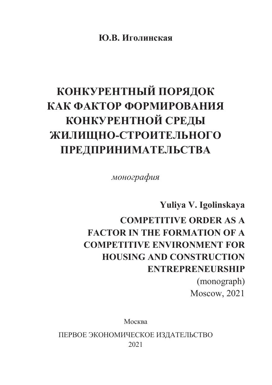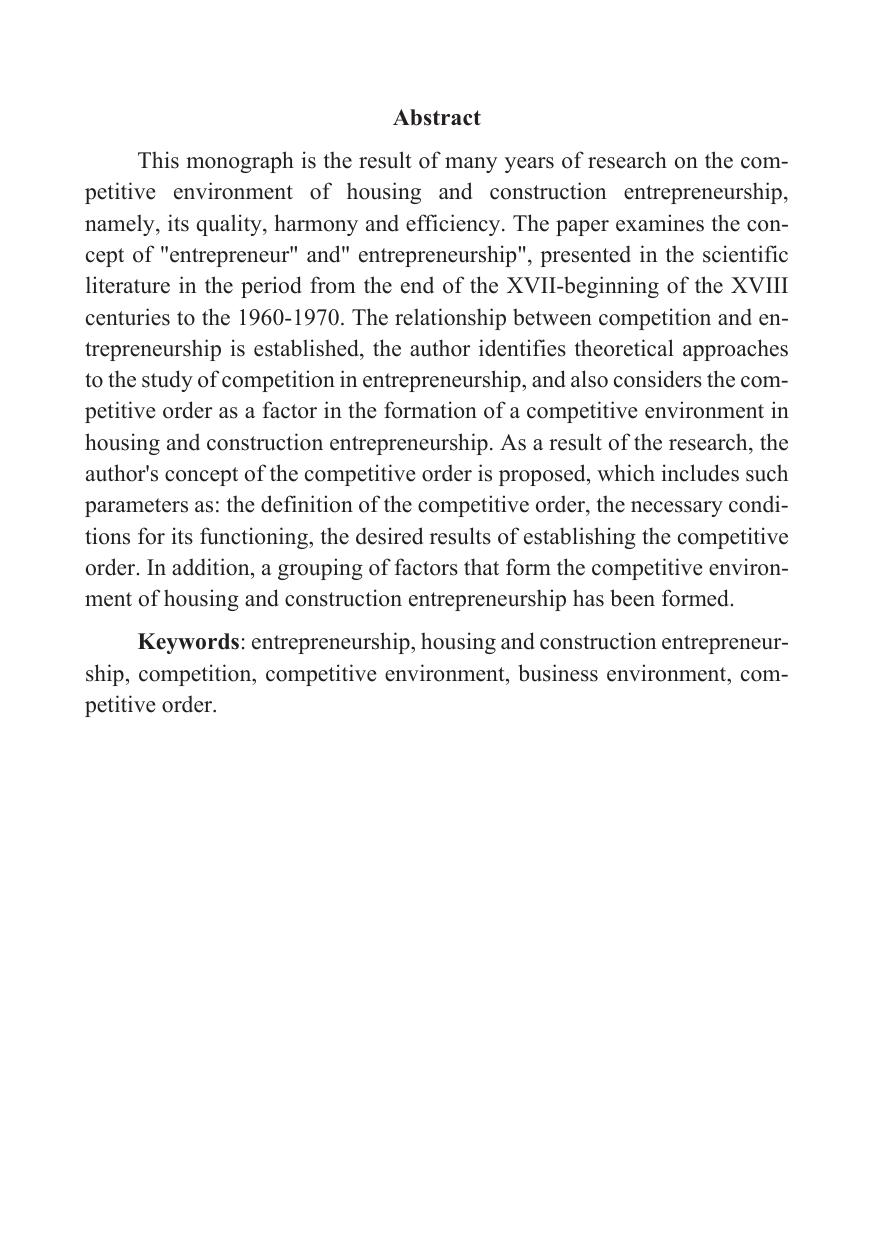 Настоящая работа является результатом многолетних исследований конкурентной среды жилищно-строительного предпринимательства, а именно: ее качества, гармоничности и эффективности. В работе исследованы понятия «предприниматель» и «предпринимательство», представленные в научной литературе в период с конца XVII – начала XVIII веков до 60–70-х годов XX века. Установлена взаимосвязь конкуренции и предпринимательства, автором выделены теоретические подходы к исследованию конкуренции в предпринимательстве, а также рассмотрен конкурентный порядок как фактор формирования конкурентной среды в жилищно-строительном предпринимательстве. В результате исследования предложена авторская концепция конкурентного порядка, включающая такие параметры, как: определение конкурентного порядка, необходимые условия его функционирования, желаемые результаты установления конкурентного порядка. Кроме того, сформирована группировка факторов, формирующих конкурентную среду жилищно-строительного предпринимательства.