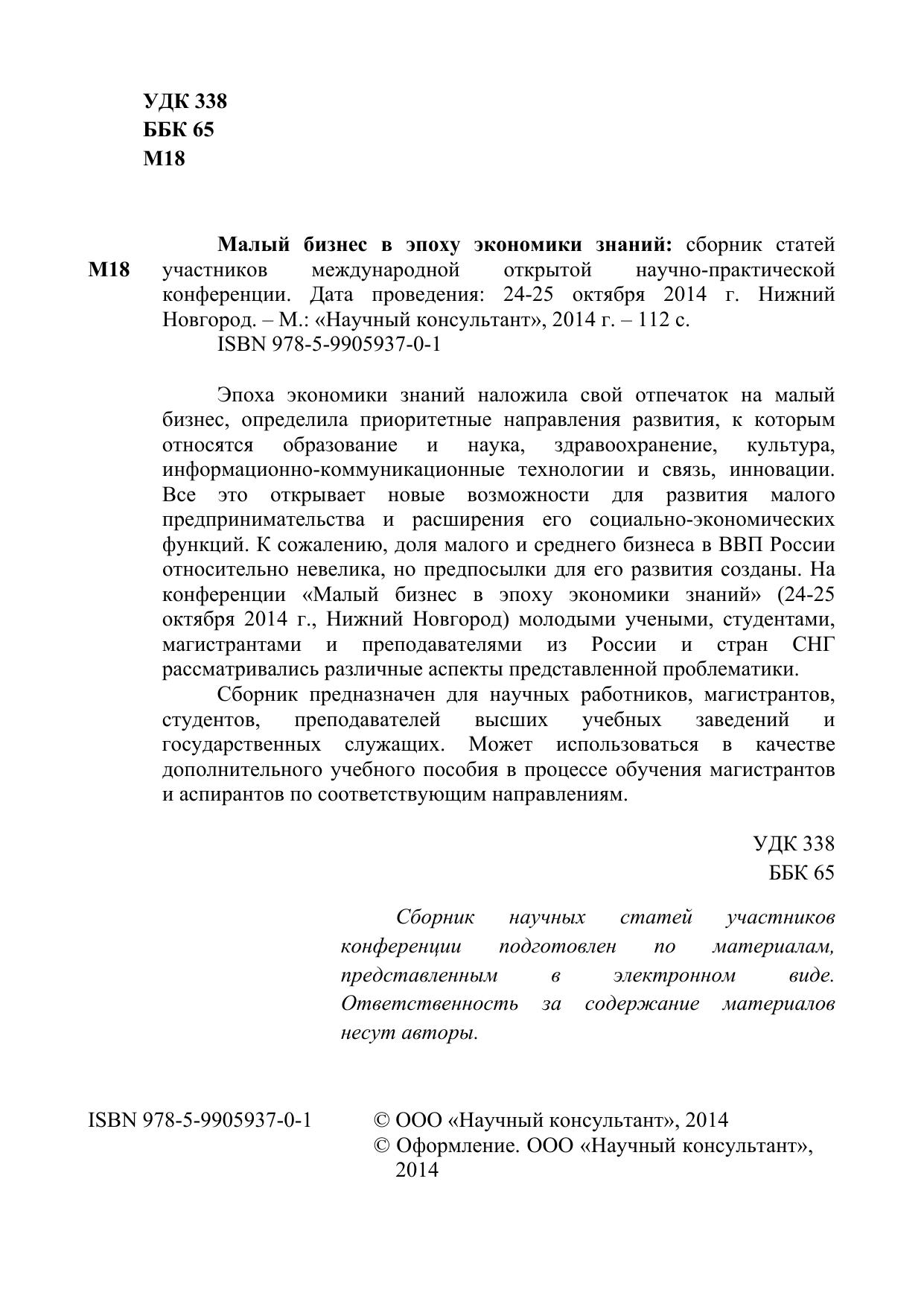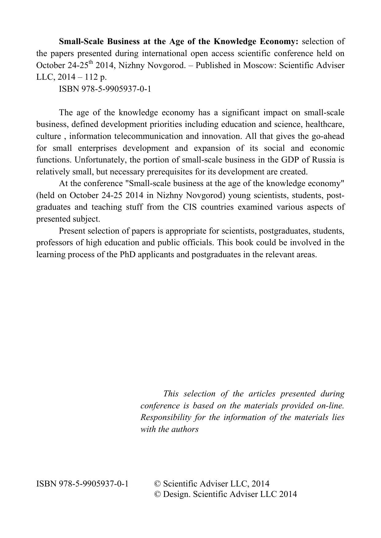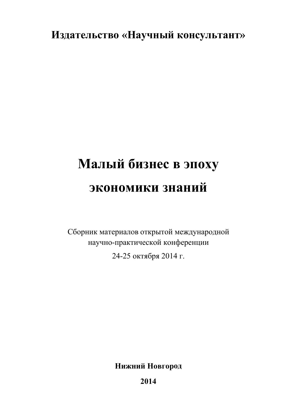 Эпоха экономики знаний наложила свой отпечаток на малый бизнес, определила приоритетные направления развития, к которым относятся образование и наука, здравоохранение, культура, информационно-коммуникационные технологии и связь, инновации. Все это открывает новые возможности для развития малого предпринимательства и расширения его социально-экономических функций. К сожалению, доля малого и среднего бизнеса в ВВП России относительно невелика, но предпосылки для его развития созданы. На конференции «Малый бизнес в эпоху экономики знаний» (24-25 октября 2014 г., Нижний Новгород) молодыми учеными, студентами, магистрантами и преподавателями из России и стран СНГ рассматривались различные аспекты представленной проблематики. Сборник предназначен для научных работников, магистрантов, студентов, преподавателей высших учебных заведений и государственных служащих. Может использоваться в качестве дополнительного учебного пособия в процессе обучения магистрантов и аспирантов по соответствующим направлениям.