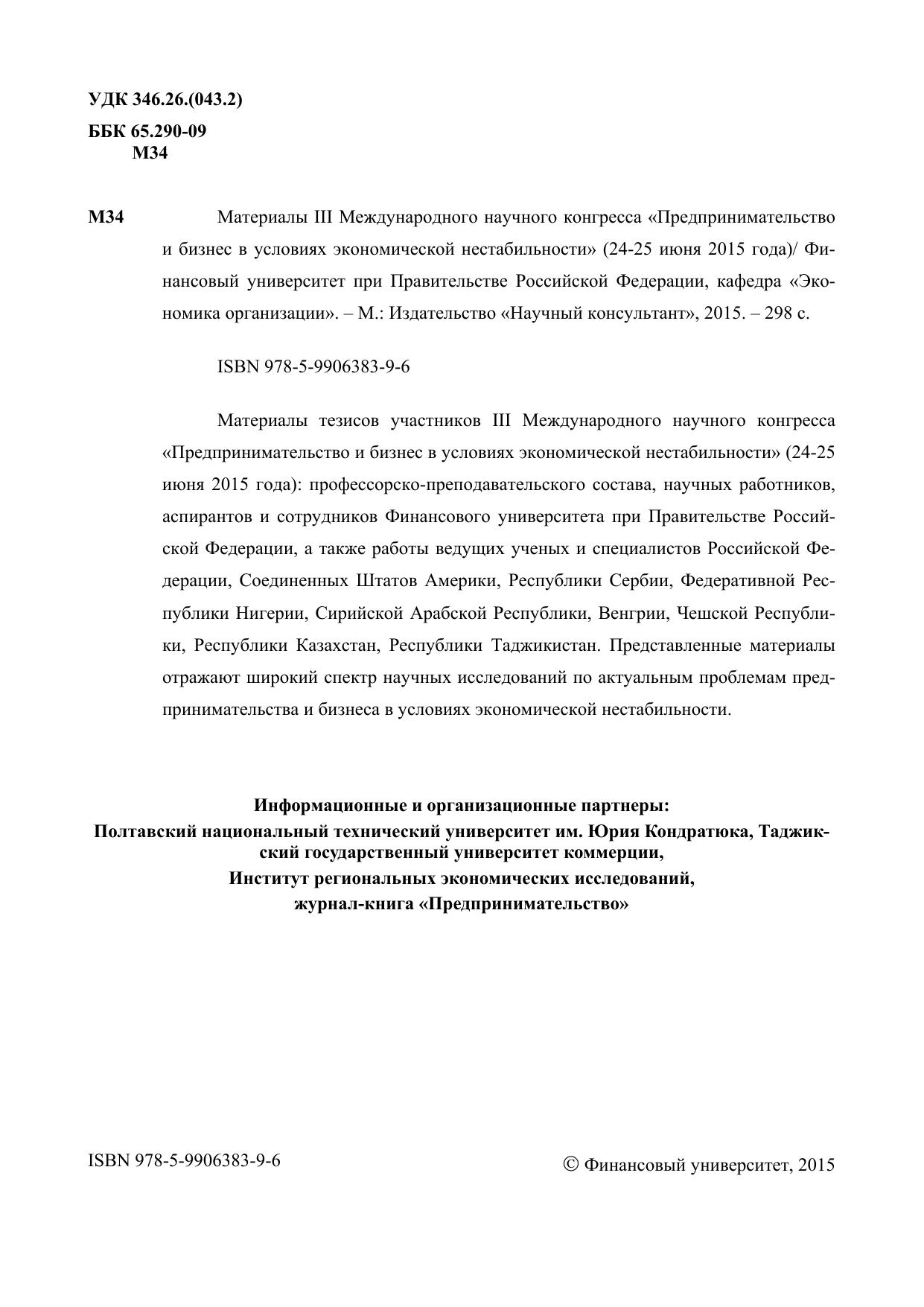 Материалы тезисов участников III Международного научного конгресса «Предпринимательство и бизнес в условиях экономической нестабильности» (24-25 июня 2015 года): профессорско-преподавательского состава, научных работников, аспирантов и сотрудников Финансового университета при Правительстве Российской Федерации, а также работы ведущих ученых и специалистов Российской Федерации, Соединенных Штатов Америки, Республики Сербии, Федеративной Республики Нигерии, Сирийской Арабской Республики, Венгрии, Чешской Республики, Республики Казахстан, Республики Таджикистан. Представленные материалы отражают широкий спектр научных исследований по актуальным проблемам предпринимательства и бизнеса в условиях экономической нестабильности.