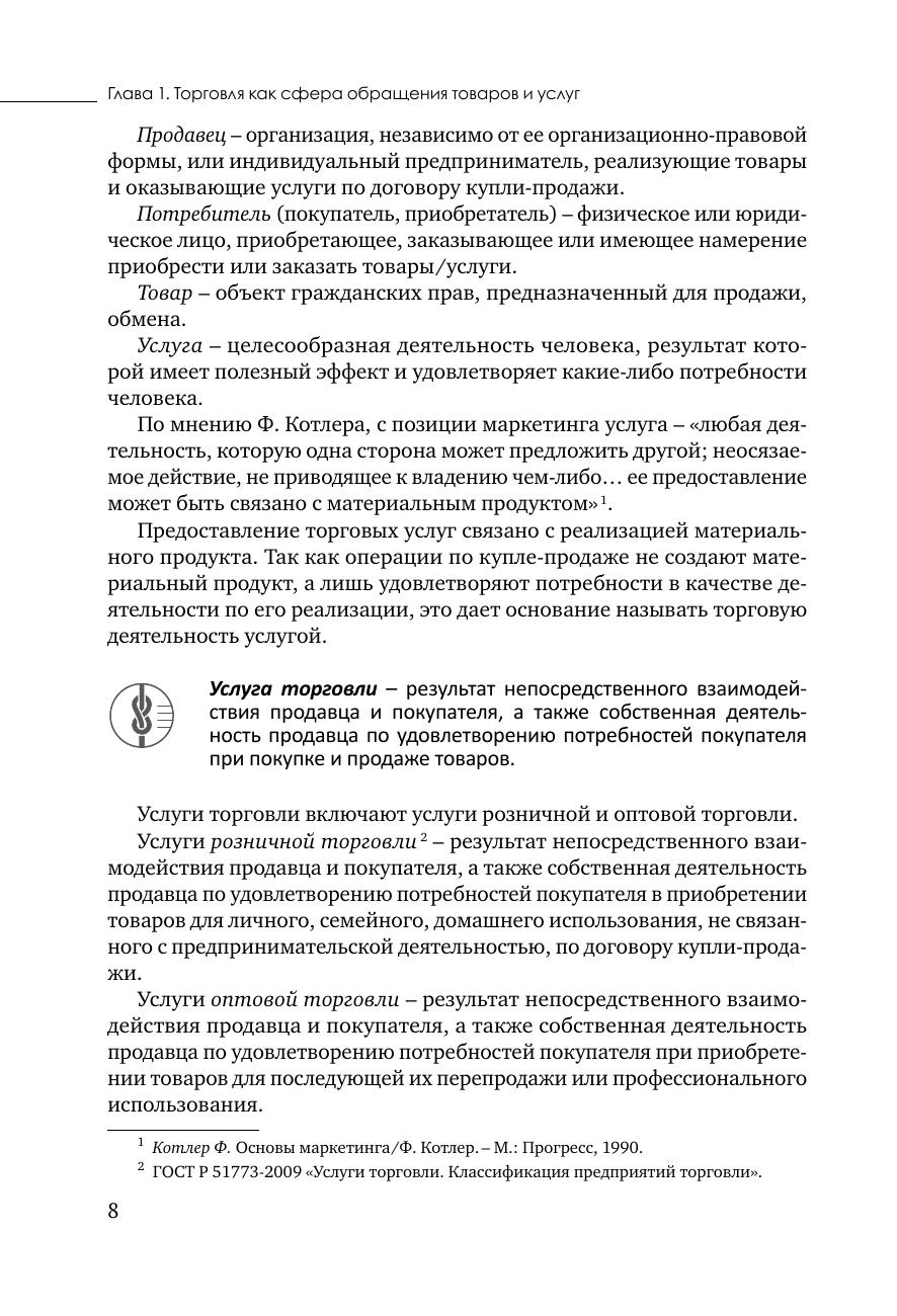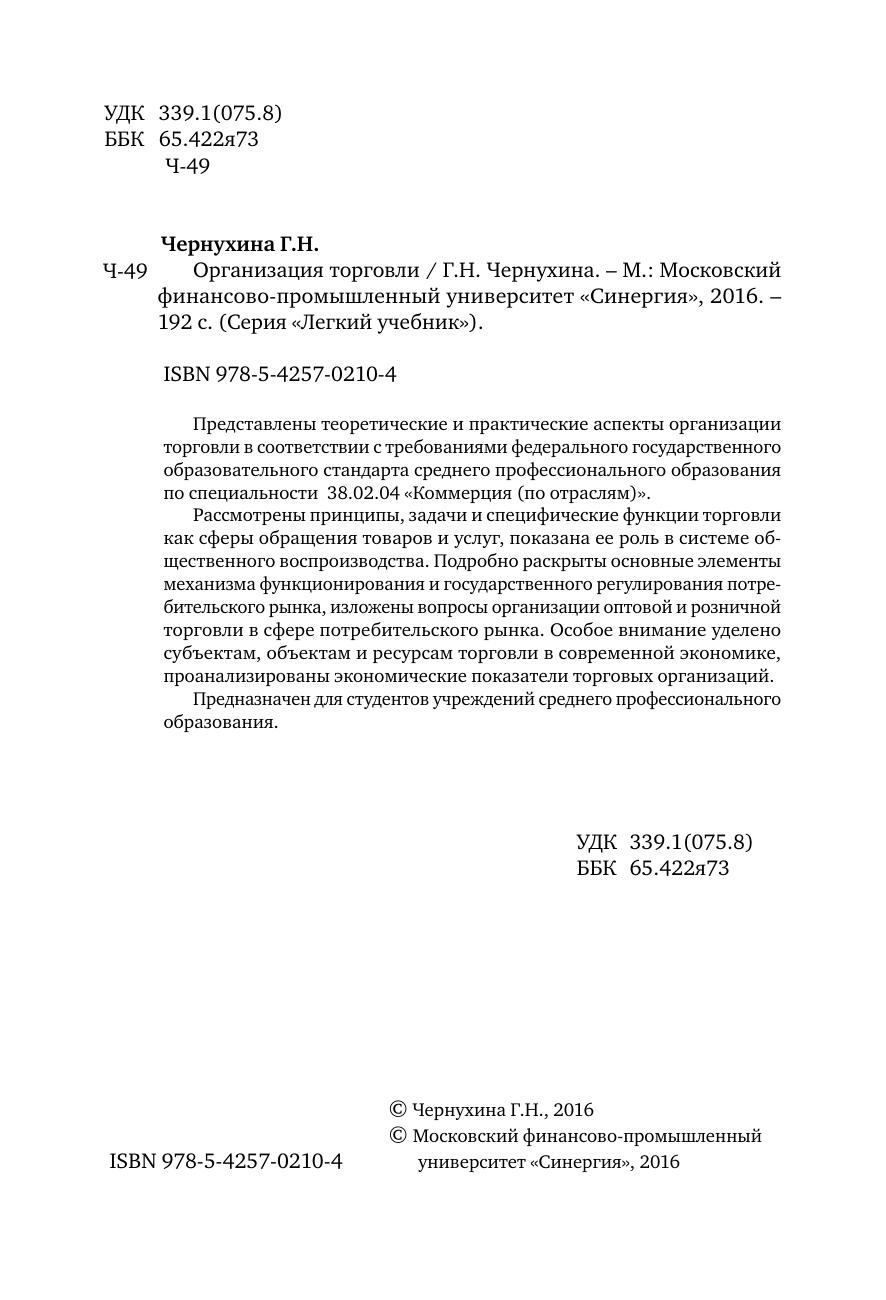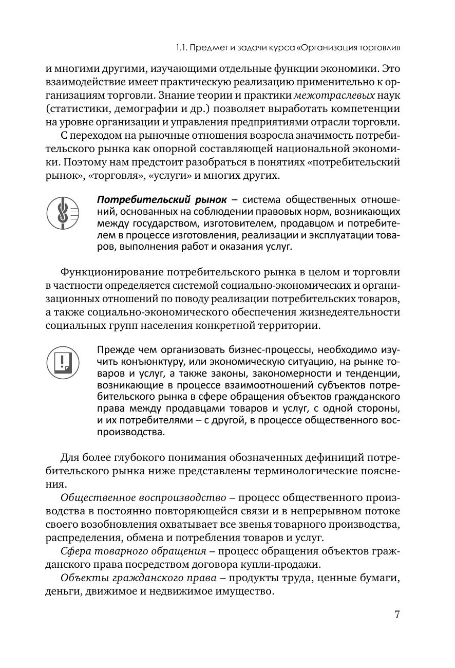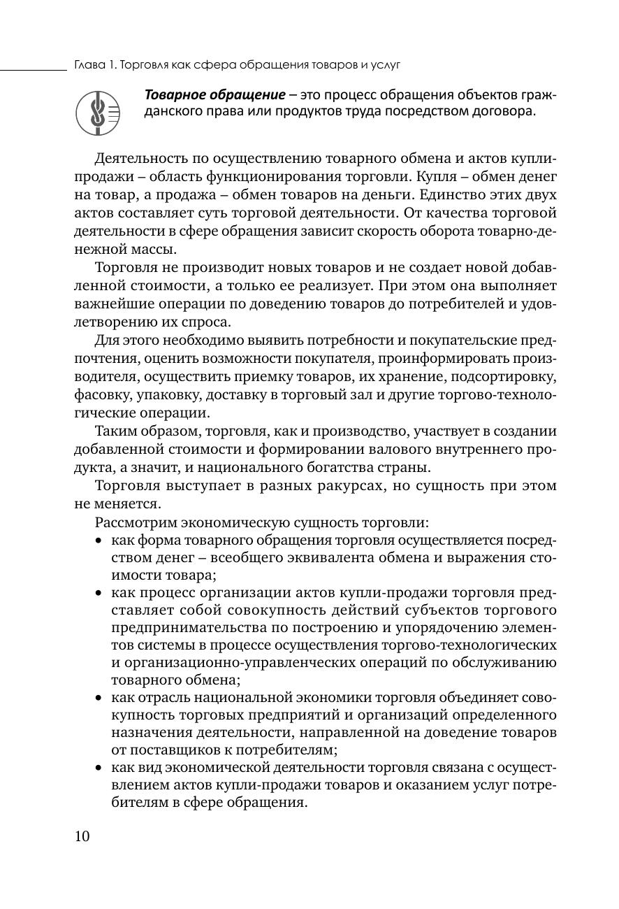 Рассмотрены принципы, задачи и специфические функции торговли как сферы обращения товаров и услуг, показана ее роль в системе общественного воспроизводства. Подробно раскрыты основные элементы механизма функционирования и государственного регулирования потребительского рынка, изложены вопросы организации оптовой и розничной торговли в сфере потребительского рынка. Особое внимание уделено субъектам, объектам и ресурсам торговли в современной экономике, проанализированы экономические показатели торговых организаций.