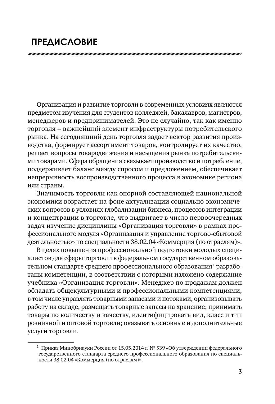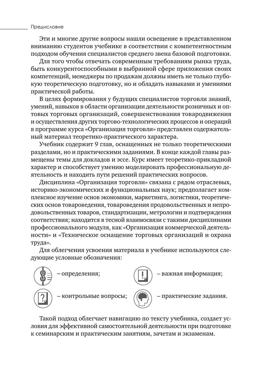 Представлены теоретические и практические аспекты организации торговли в соответствии с требованиями федерального государственного образовательного стандарта среднего профессионального образования по специальности 38.02.04 «Коммерция (по отраслям)».