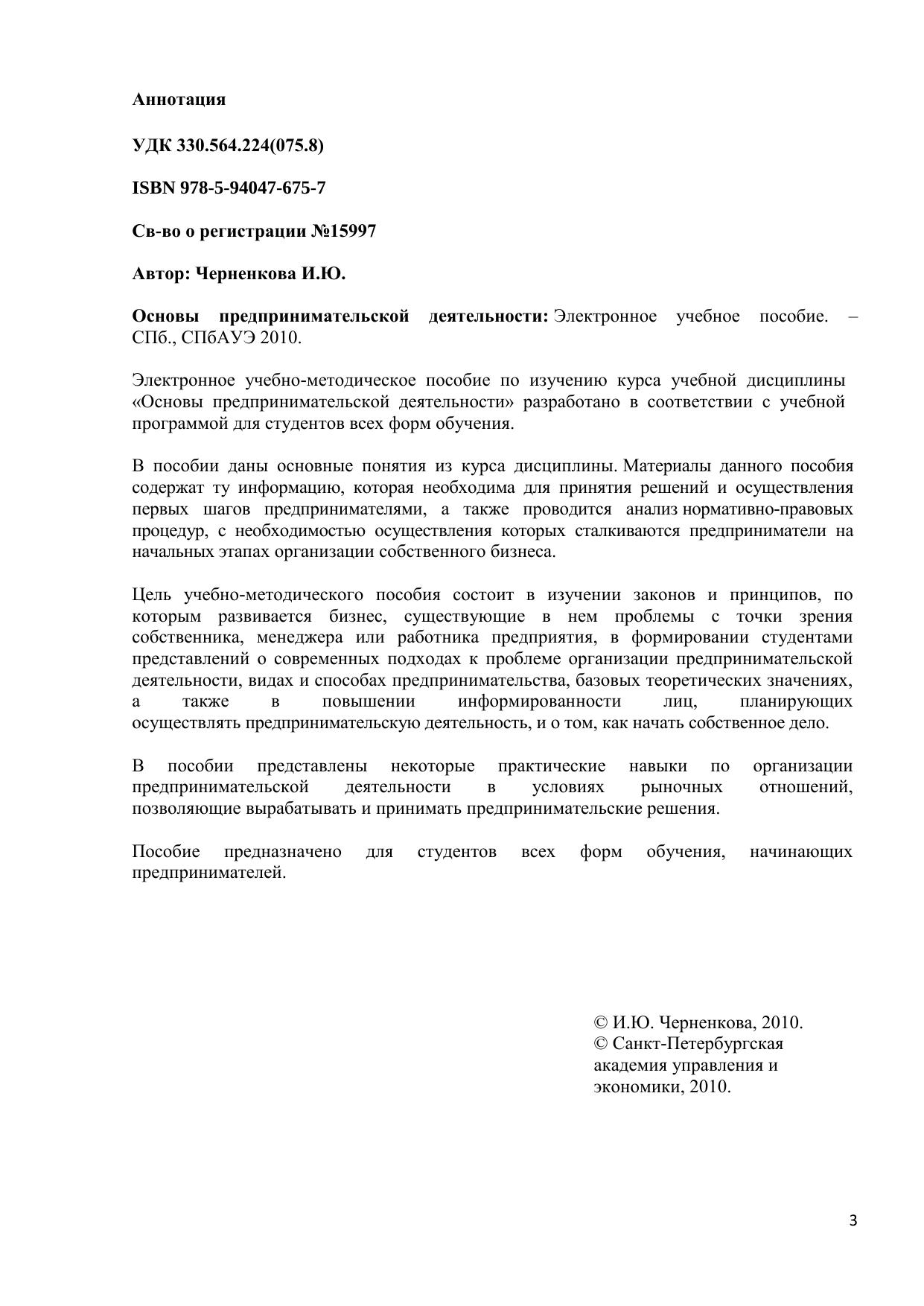 Электронное учебно-методическое пособие по изучению курса учебной дисциплины «Основы предпринимательской деятельности» разработано в соответствии с учебной программой для студентов всех форм обучения. В пособии даны основные понятия из курса дисциплины. Материалы данного пособия содержат ту информацию, которая необходима для принятия решений и осуществления первых шагов предпринимателями, а также проводится анализ нормативно-правовых процедур, с необходимостью осуществления которых сталкиваются предприниматели на начальных этапах организации собственного бизнеса. Цель учебно-методического пособия состоит в изучении законов и принципов, по которым развивается бизнес, существующие в нем проблемы с точки зрения собственника, менеджера или работника предприятия, в формировании студентами представлений о современных подходах к проблеме организации предпринимательской деятельности, видах и способах предпринимательства, базовых теоретических значениях, а также в повышении информированности лиц, планирующих осуществлять предпринимательскую деятельность, и о том, как начать собственное дело. Электронное учебное пособие для дистанционного обучения