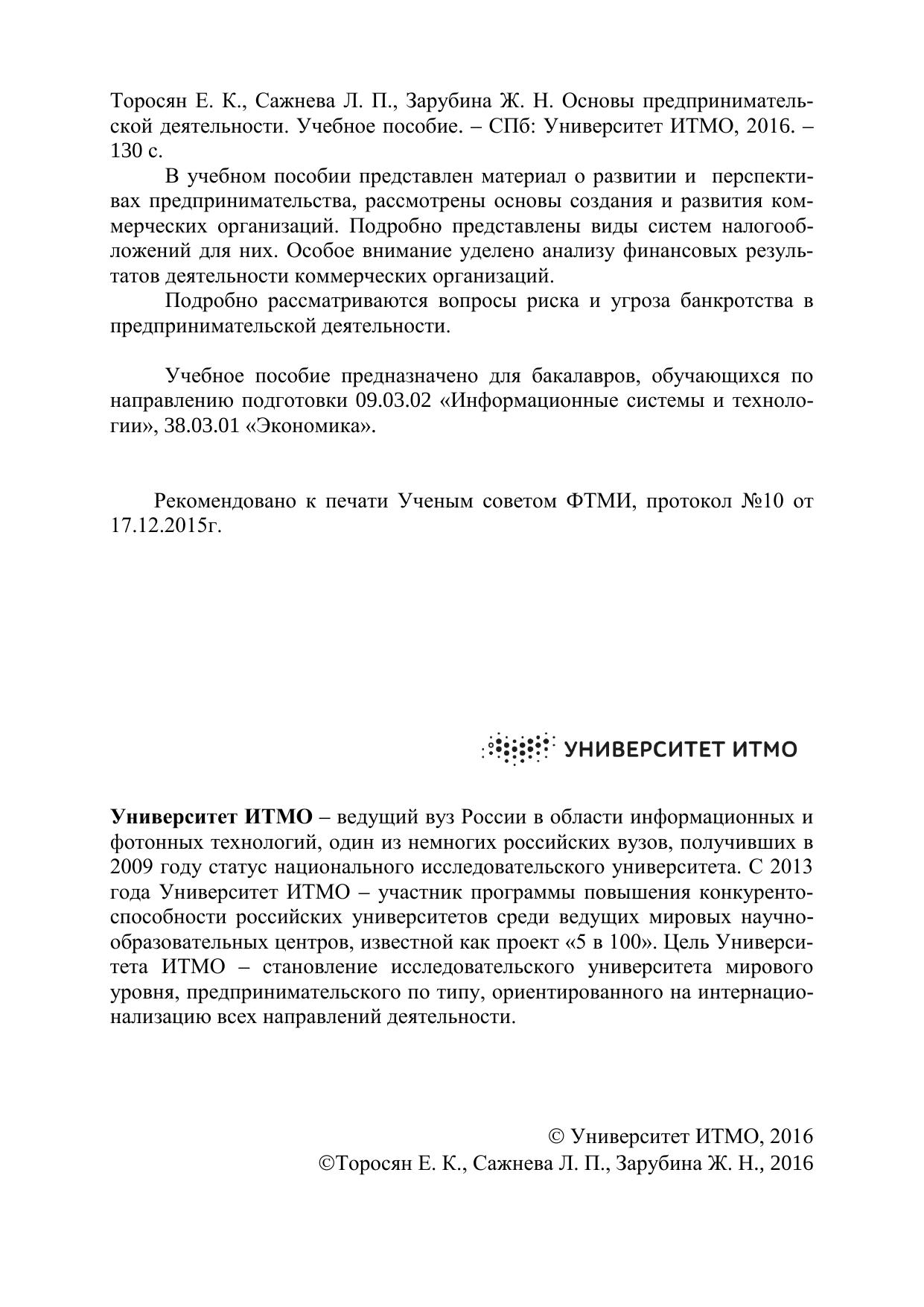 В учебном пособии представлен материал о развитии и перспективах предпринимательства, рассмотрены основы создания и развития коммерческих организаций. Подробно представлены виды систем налогообложений для них. Особое внимание уделено анализу финансовых результатов деятельности коммерческих организаций. Подробно рассматриваются вопросы риска и угроза банкротства в предпринимательской деятельности. Учебное пособие предназначено для бакалавров, обучающихся по направлению подготовки 09.03.02 «Информационные системы и технологии», 38.03.01 «Экономика».