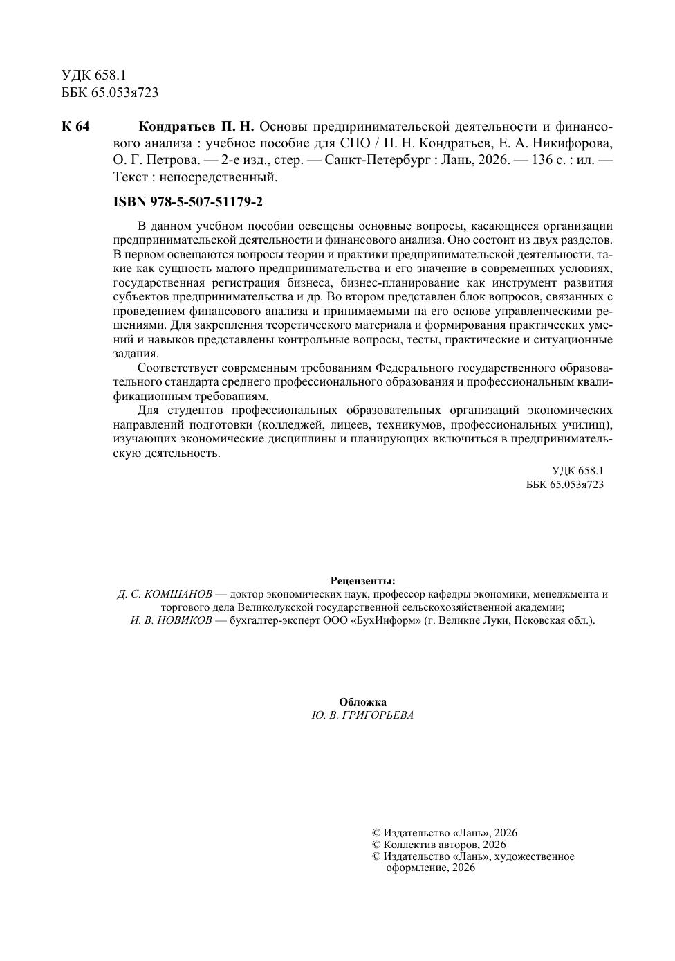 В данном учебном пособии освещены основные вопросы, касающиеся организации предпринимательской деятельности и финансового анализа. Оно состоит из двух разделов. В первом освещаются вопросы теории и практики предпринимательской деятельности, такие как сущность малого предпринимательства и его значение в современных условиях, государственная регистрация бизнеса, бизнес-планирование как инструмент развития субъектов предпринимательства и др. Во втором представлен блок вопросов, связанных с проведением финансового анализа и принимаемыми на его основе управленческими решениями. Для закрепления теоретического материала и формирования практических умений и навыков представлены контрольные вопросы, тесты, практические и ситуационные задания. Соответствует современным требованиям Федерального государственного образова-тельного стандарта среднего профессионального образования и профессиональным квалификационным требованиям. Для студентов профессиональных образовательных организаций экономических направлений подготовки (колледжей, лицеев, техникумов, профессиональных училищ), изучающих экономические дисциплины и планирующих включиться в предпринимательскую деятельность.