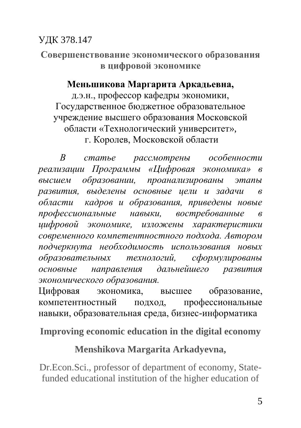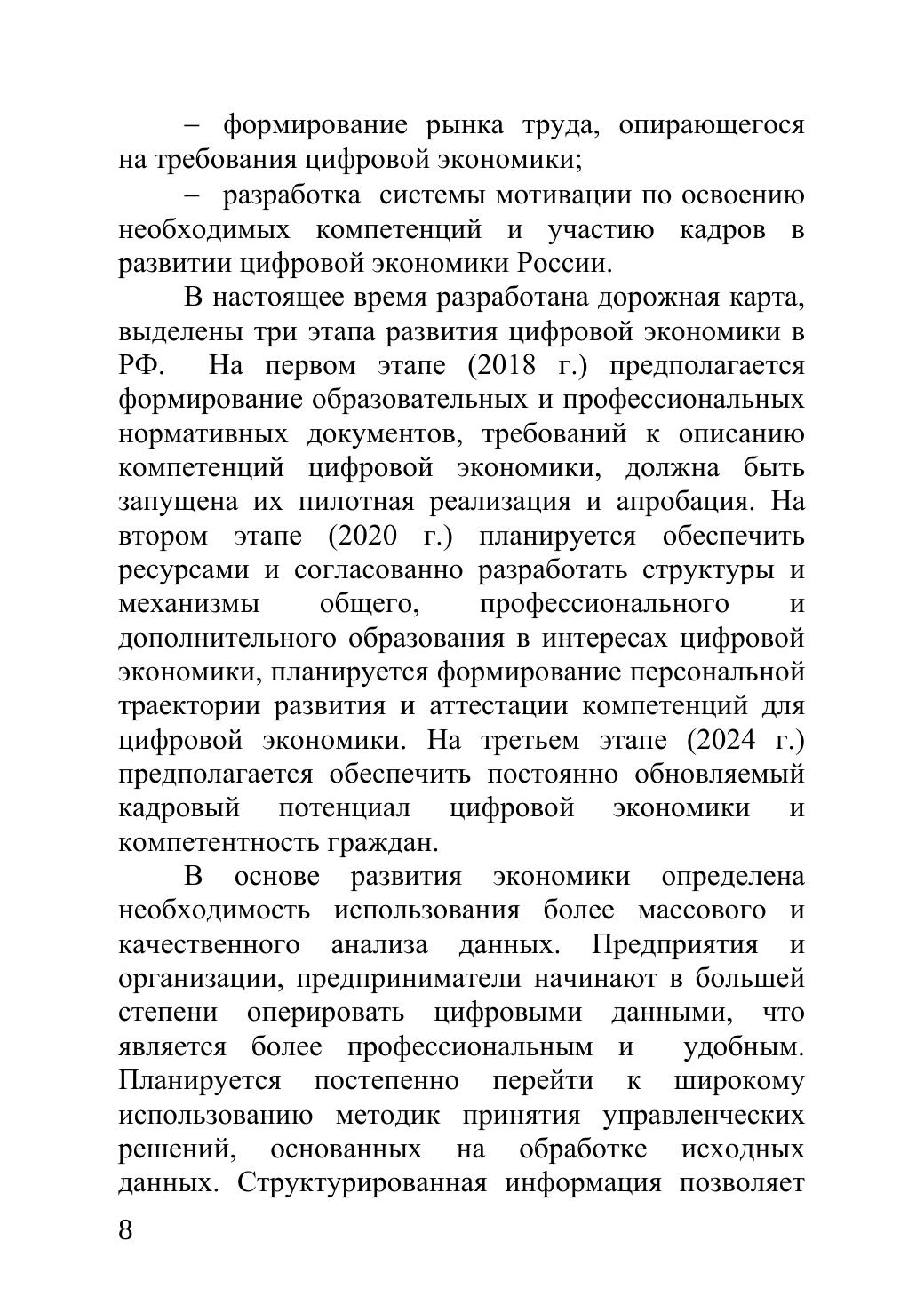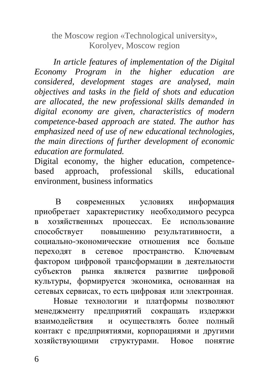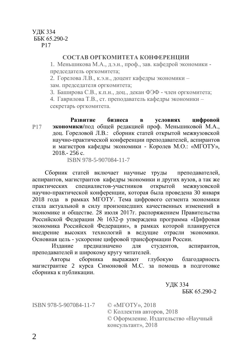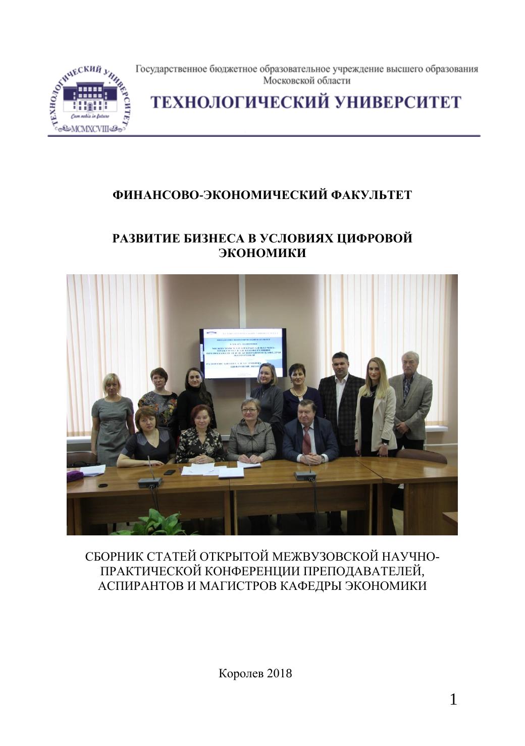 Сборник статей включает научные труды преподавателей, аспирантов, магистрантов кафедры экономики и других вузов, а так же практических специалистов-участников открытой межвузовской научно-практической конференции, которая была проведена 30 января 2018 года в рамках МГОТУ. Тема цифрового сегмента экономики стала актуальной в силу произошедших качественных изменений в экономике и обществе. 28 июля 2017г. распоряжением Правительства Российской Федерации № 1632-р утверждена программа «Цифровая экономика Российской Федерации», в рамках которой планируется внедрение высоких технологий в ведущие отрасли экономики. Основная цель - ускорение цифровой трансформации России. Издание предназначено для студентов, аспирантов, преподавателей и широкому кругу читателей. Авторы сборника выражают глубокую благодарность магистрантке 2 курса Симоновой М. С. за помощь в подготовке сборника к публикации