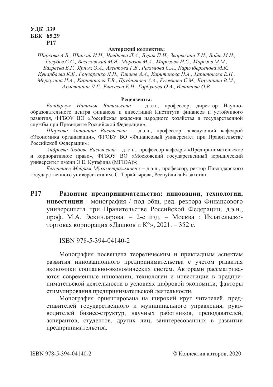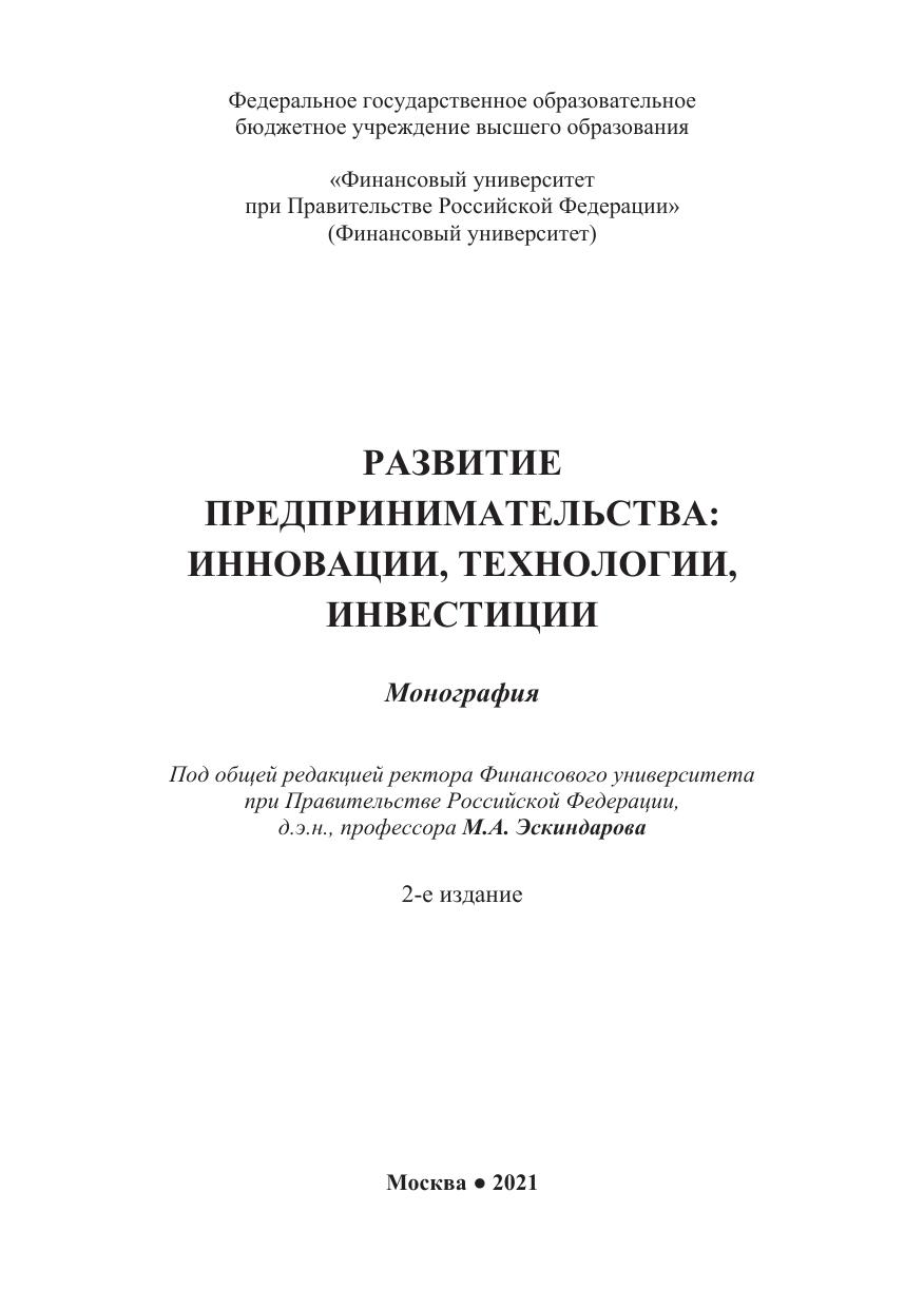 Монография посвящена теоретическим и прикладным аспектам развития инновационного предпринимательства с учетом развития экономики социально-экономических систем. Авторами рассматриваются современные инновации, технологии и инвестиции в предпринимательской деятельности в условиях цифровой экономики, факторы стимулирования предпринимательской деятельности.