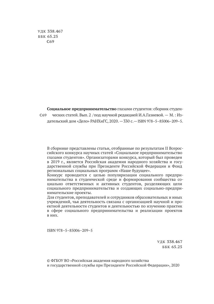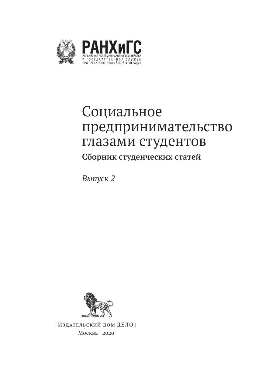 В сборнике представлены статьи, отобранные по результатам II Всероссийского конкурса научных статей «Социальное предпринимательство глазами студентов». Организаторами конкурса, который был проведен в 2019 г., является Российская академия народного хозяйства и государственной службы при Президенте Российской Федерации и Фонд региональных социальных программ «Наше будущее». Конкурс проводится с целью популяризации социального предпринимательства в студенческой среде и формирования сообщества социально ответственных и активных студентов, разделяющих цели социального предпринимательства и создающих социально-предпринимательские проекты. Для студентов, преподавателей и сотрудников образовательных и иных учреждений, чья деятельность связана с организацией научной и проектной деятельности студентов и деятельностью по изучению практик в сфере социального предпринимательства и реализации проектов в них.