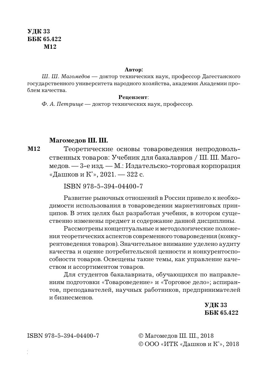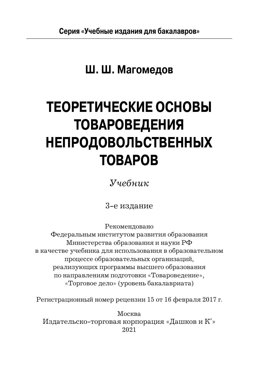 Развитие рыночных отношений в России привело к необходимости использования в товароведении маркетинговых принципов. В этих целях был разработан учебник, в котором существенно изменены предмет и содержание данной дисциплины. Рассмотрены концептуальные и методологические положения теоретических аспектов современного товароведения (конкурентоведения товаров). Значительное внимание уделено аудиту качества и оценке потребительской ценности и конкурентоспособности товаров. Освещены такие темы, как управление качеством и ассортиментом товаров. Для студентов бакалавриата, обучающихся по направлениям подготовки «Товароведение» и «Торговое дело», аспирантов, преподавателей, научных работников, предпринимателей и бизнесменов.