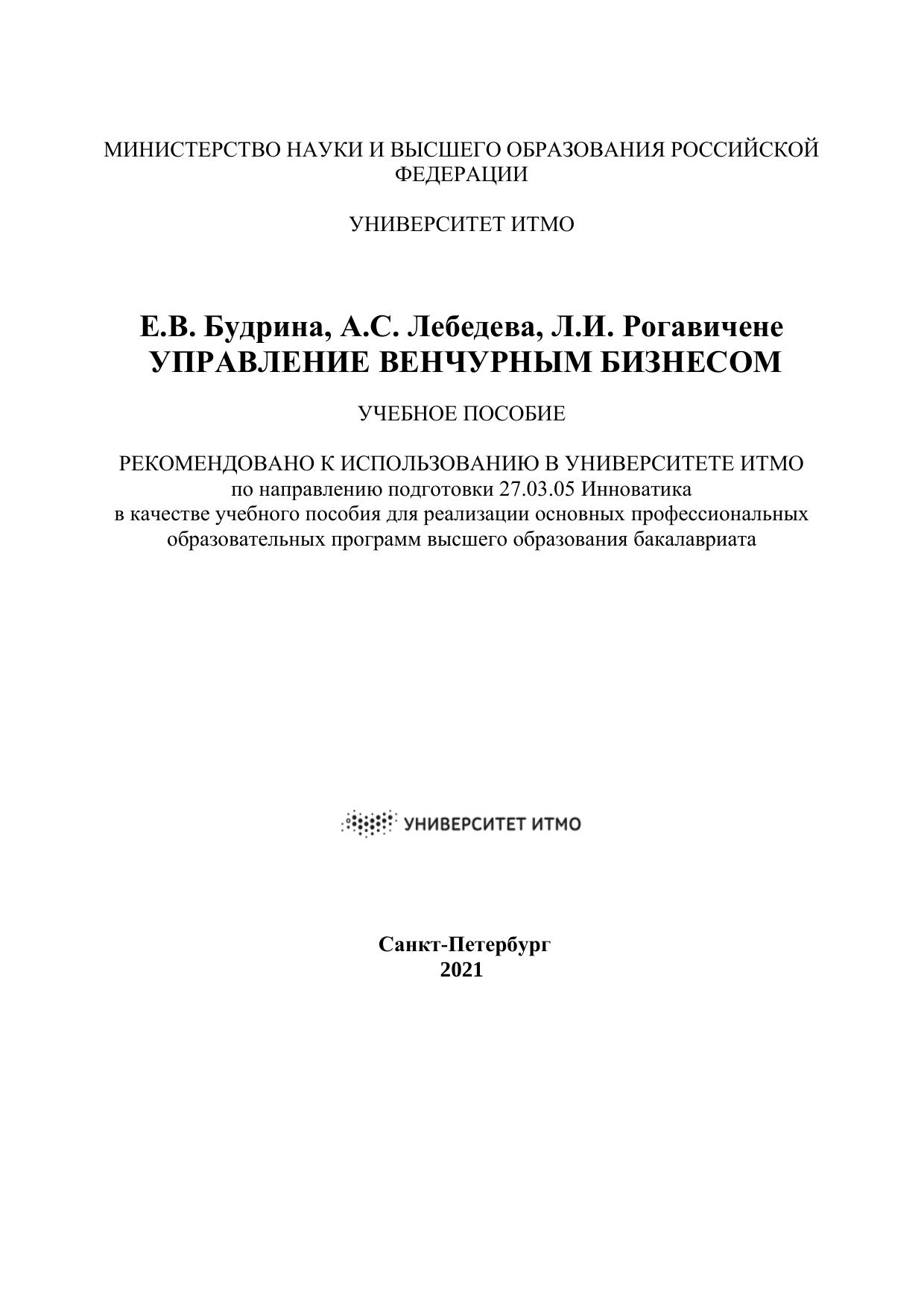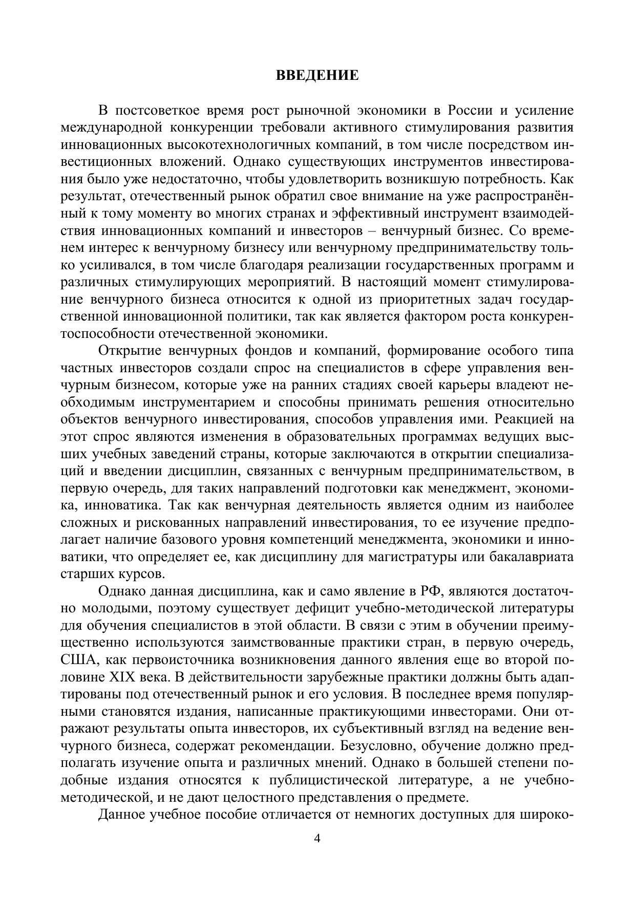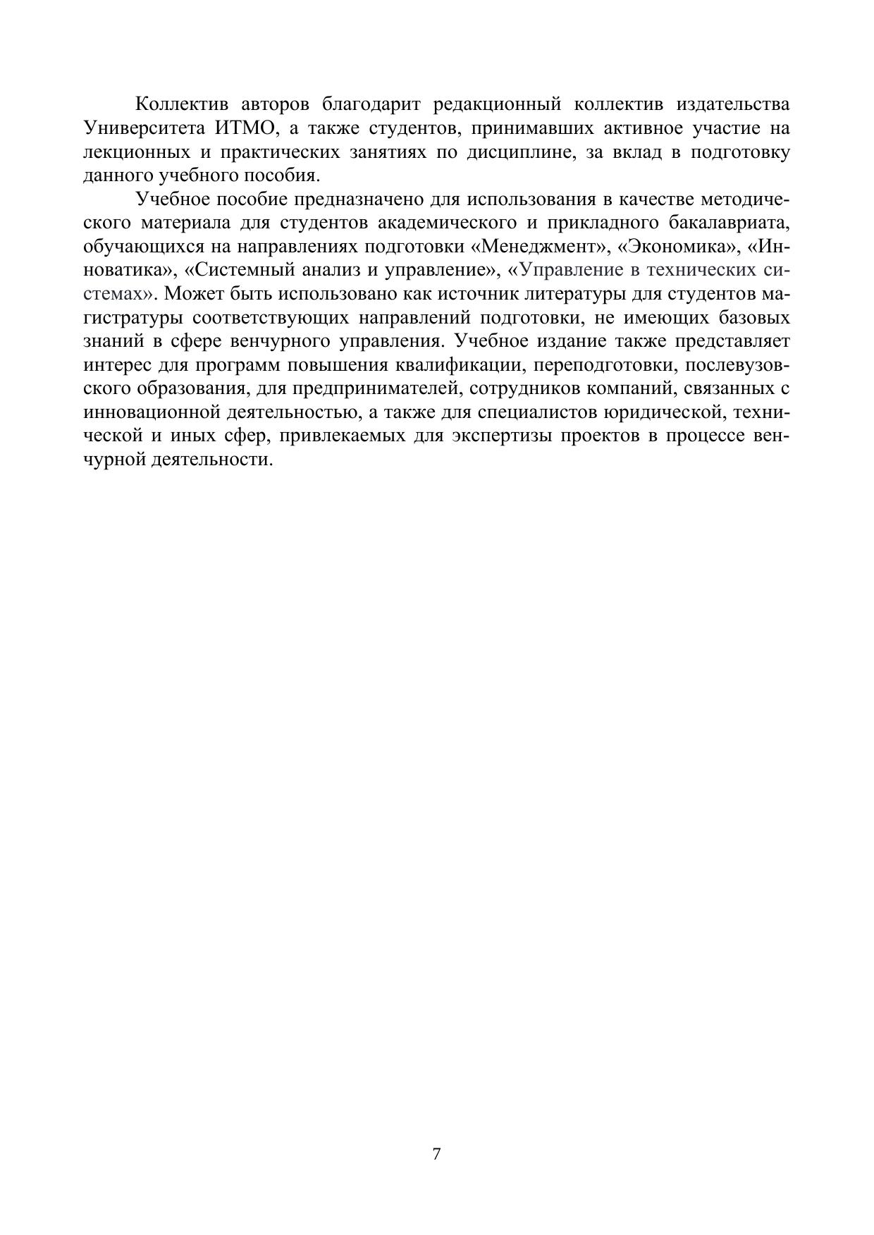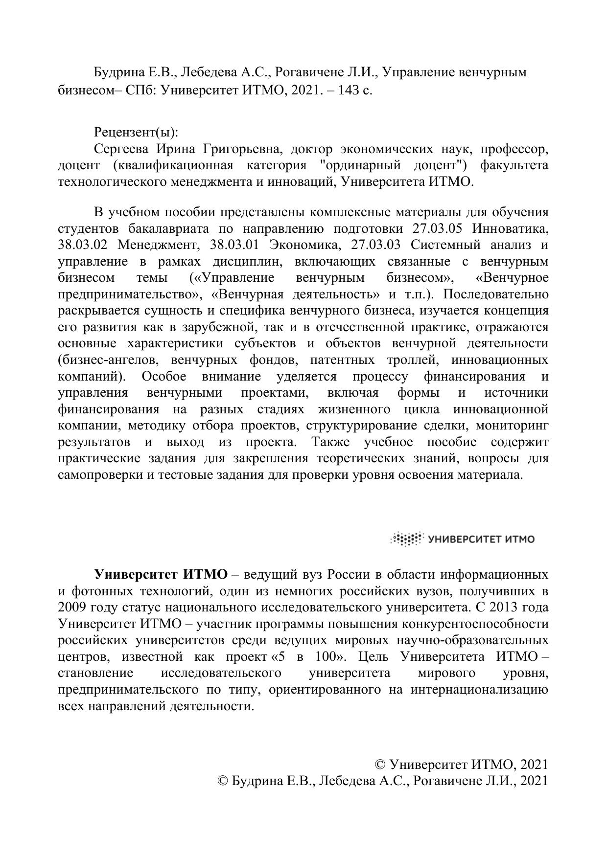 В учебном пособии представлены комплексные материалы для обучения студентов бакалавриата по направлению подготовки 27.03.05 Инноватика, 38.03.02 Менеджмент, 38.03.01 Экономика, 27.03.03 Системный анализ и управление в рамках дисциплин, включающих связанные с венчурным бизнесом темы («Управление венчурным бизнесом», «Венчурное предпринимательство», «Венчурная деятельность» и т.п.). Последовательно раскрывается сущность и специфика венчурного бизнеса, изучается концепция его развития как в зарубежной, так и в отечественной практике, отражаются основные характеристики субъектов и объектов венчурной деятельности (бизнес-ангелов, венчурных фондов, патентных троллей, инновационных компаний). Особое внимание уделяется процессу финансирования и управления венчурными проектами, включая формы и источники финансирования на разных стадиях жизненного цикла инновационной компании, методику отбора проектов, структурирование сделки, мониторинг результатов и выход из проекта. Также учебное пособие содержит практические задания для закрепления теоретических знаний, вопросы для самопроверки и тестовые задания для проверки уровня освоения материала.