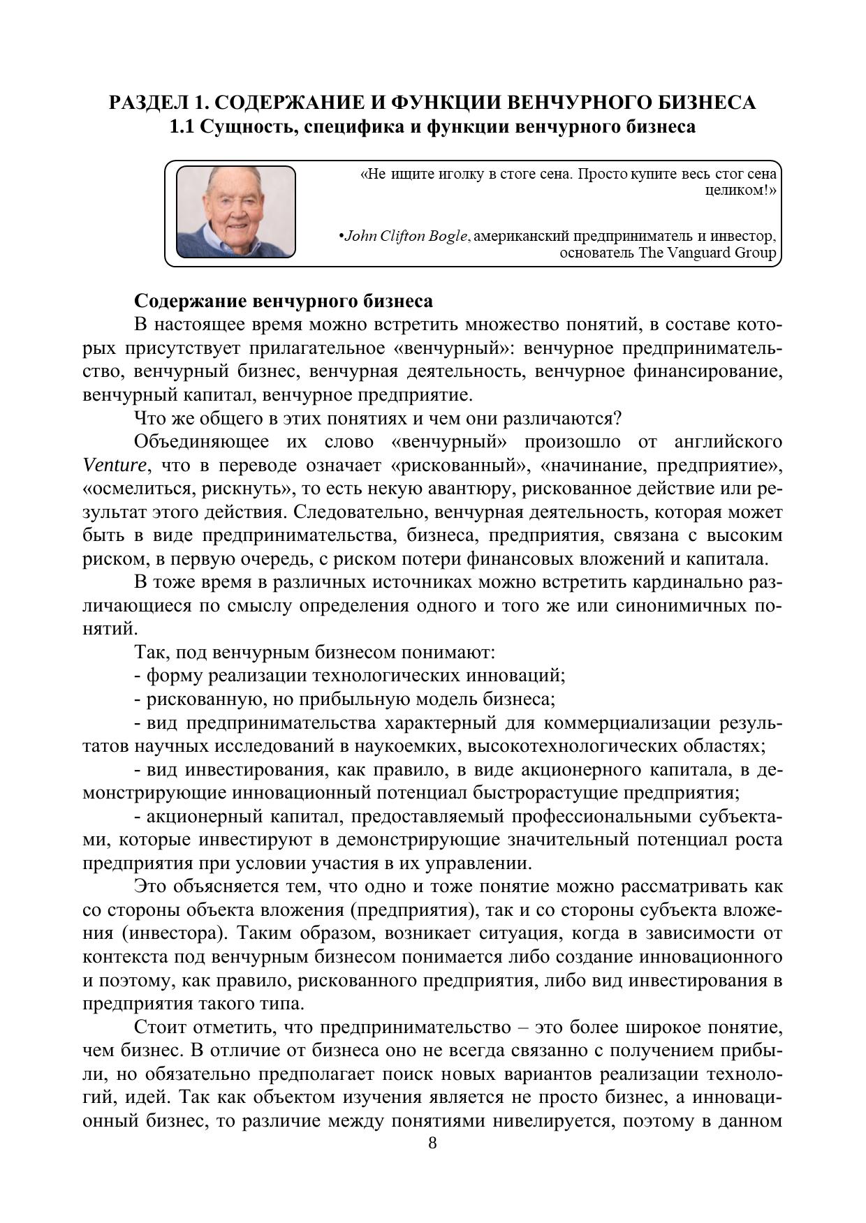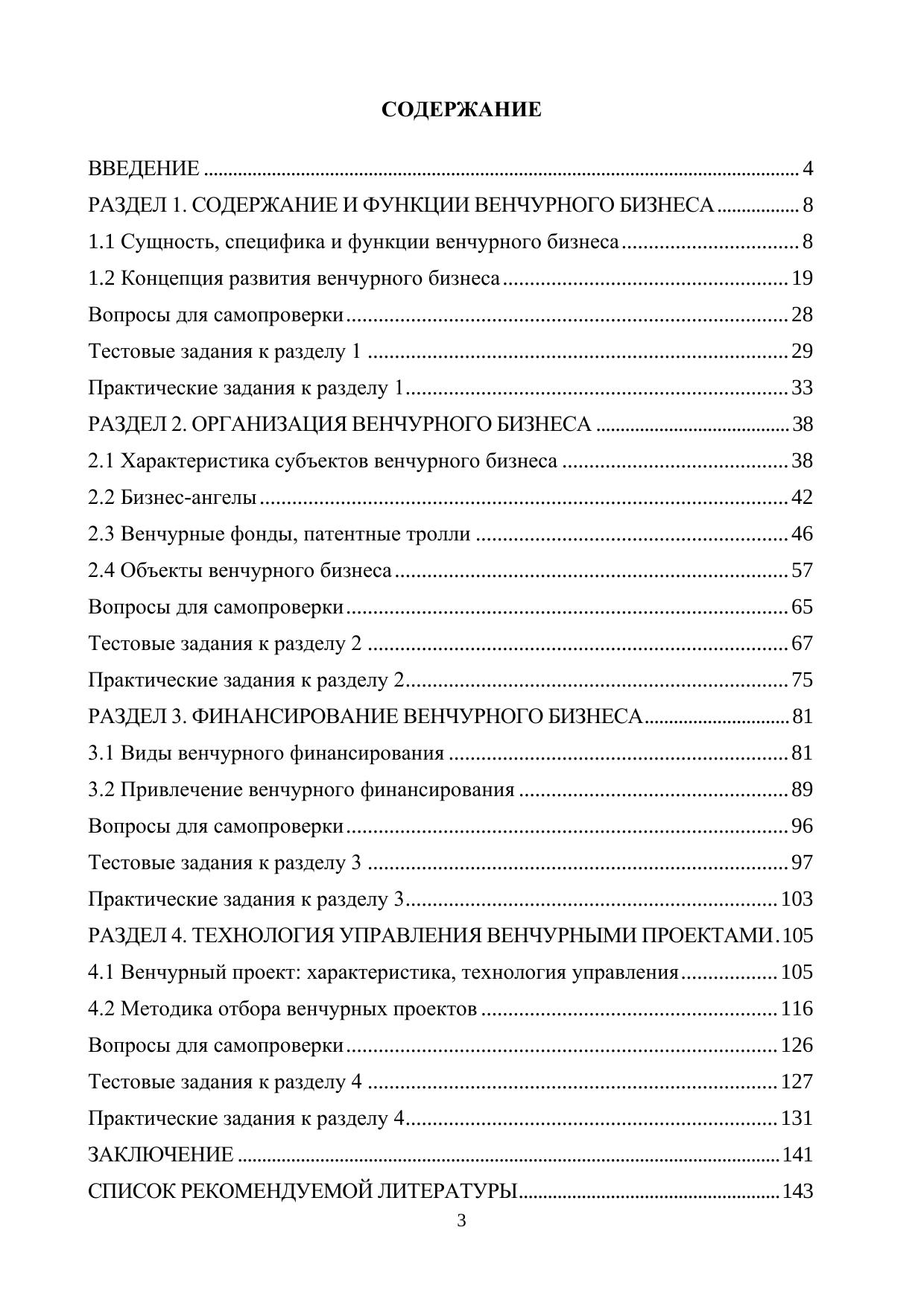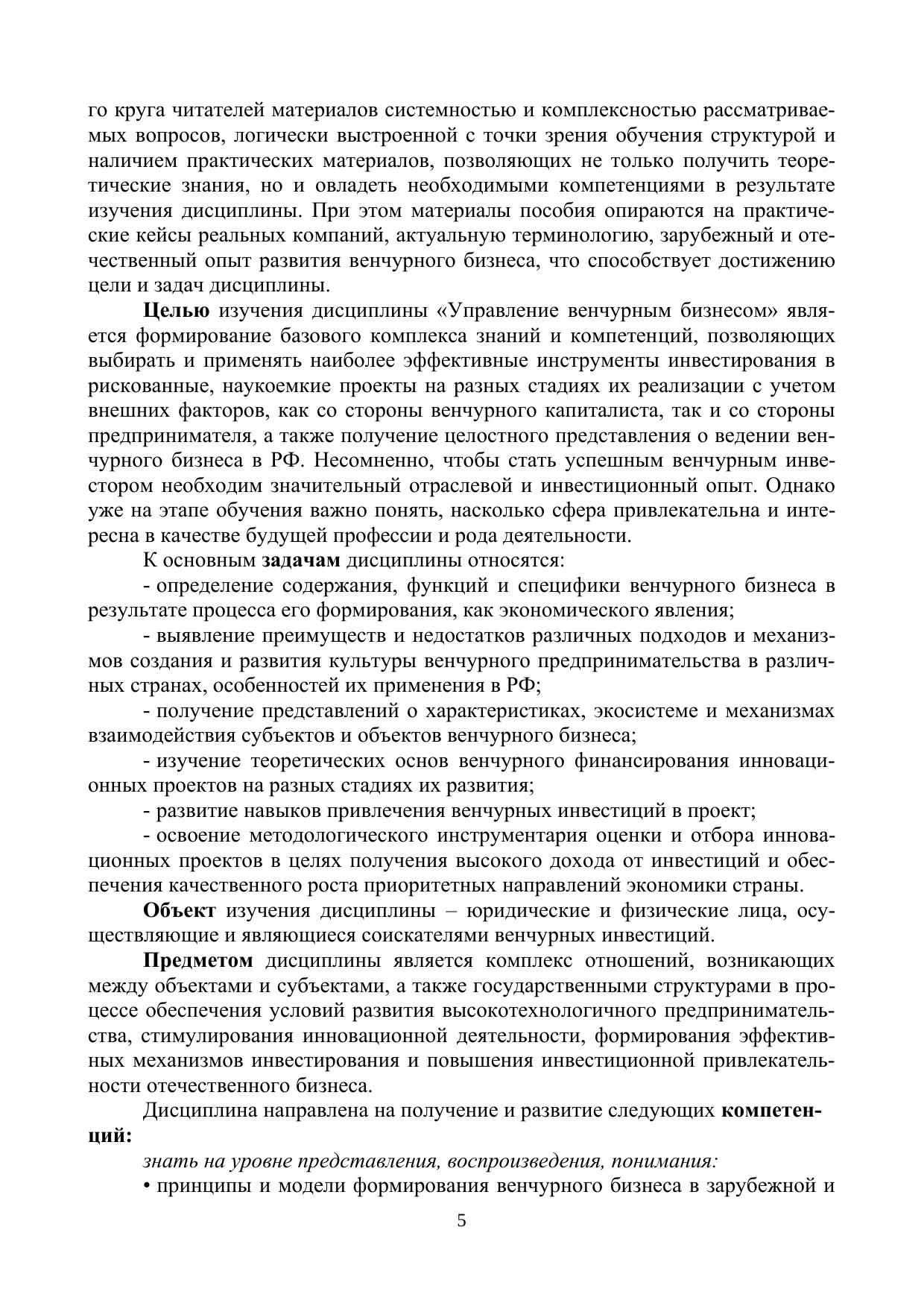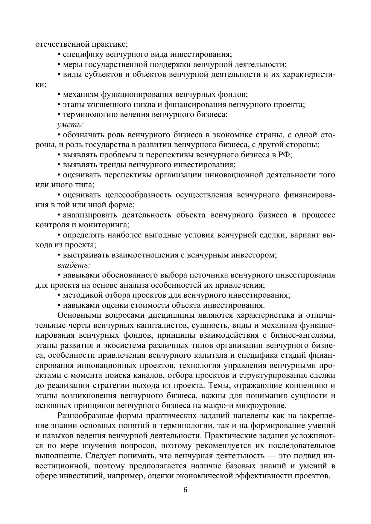 В учебном пособии представлены комплексные материалы для обучения студентов бакалавриата по направлению подготовки 27.03.05 Инноватика, 38.03.02 Менеджмент, 38.03.01 Экономика, 27.03.03 Системный анализ и управление в рамках дисциплин, включающих связанные с венчурным бизнесом темы («Управление венчурным бизнесом», «Венчурное предпринимательство», «Венчурная деятельность» и т.п.). Последовательно раскрывается сущность и специфика венчурного бизнеса, изучается концепция его развития как в зарубежной, так и в отечественной практике, отражаются основные характеристики субъектов и объектов венчурной деятельности (бизнес-ангелов, венчурных фондов, патентных троллей, инновационных компаний). Особое внимание уделяется процессу финансирования и управления венчурными проектами, включая формы и источники финансирования на разных стадиях жизненного цикла инновационной компании, методику отбора проектов, структурирование сделки, мониторинг результатов и выход из проекта. Также учебное пособие содержит практические задания для закрепления теоретических знаний, вопросы для самопроверки и тестовые задания для проверки уровня освоения материала.