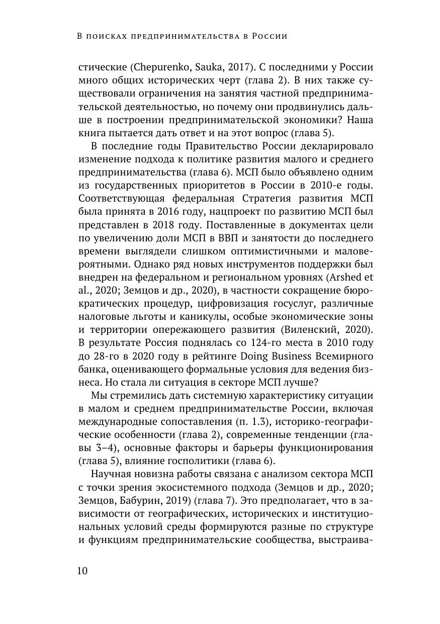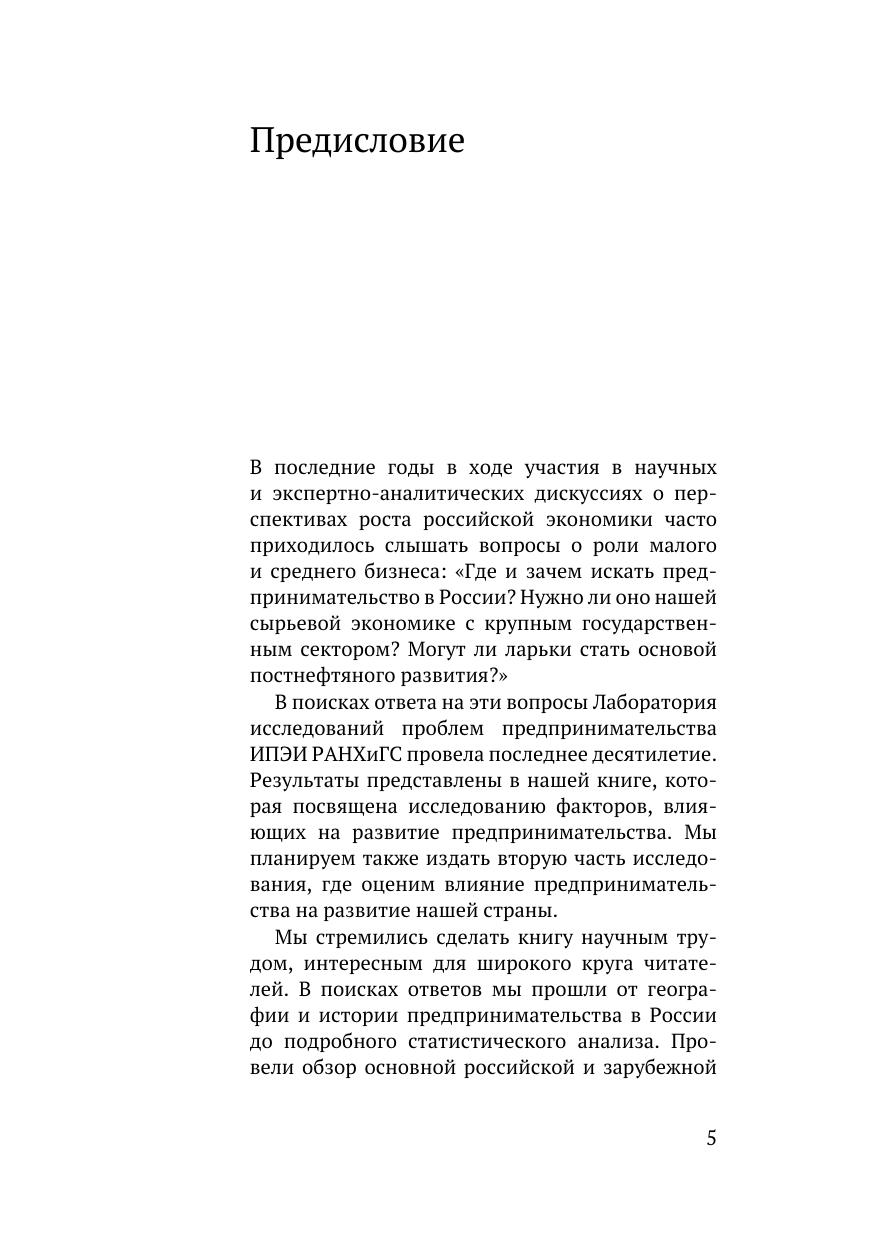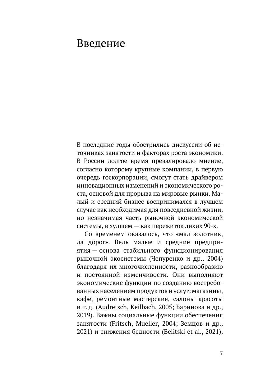 Книга посвящена закономерностям развития малого и среднего предпринимательства в России. Кто такие предприниматели и зачем они нужны? Что мешает процветанию отечественного малого и среднего бизнеса? Что может и должно сделать государство для развития частной инициативы? Эти вопросы в книге рассматриваются с точки зрения экосистемного подхода, то есть с учетом взаимодействия предпринимателей, представителей государства и различных общественных группы в деловой среде региона. Показана значимая, но недостаточная роль МСП в развитии России даже в сравнении с другими постсоциалистическими странами. Поясняется, почему на малый и средний бизнес сегодня влияют события даже столетней давности. Авторы указывают регионы и отрасли, в которых лучше развито МСП. Объясняются современные тренды, негативные последствия пандемии, роль цифровых технологий и технологических стартапов в адаптации бизнес-сектора к кризисам. На основе обзора литературы и опросов предпринимателей авторы моделируют факторы и выявляют барьеры развития МСП в регионах России, в том числе роль федеральной и региональной государственной политики. В некоторой степени монографию можно считать введением в географию предпринимательства.