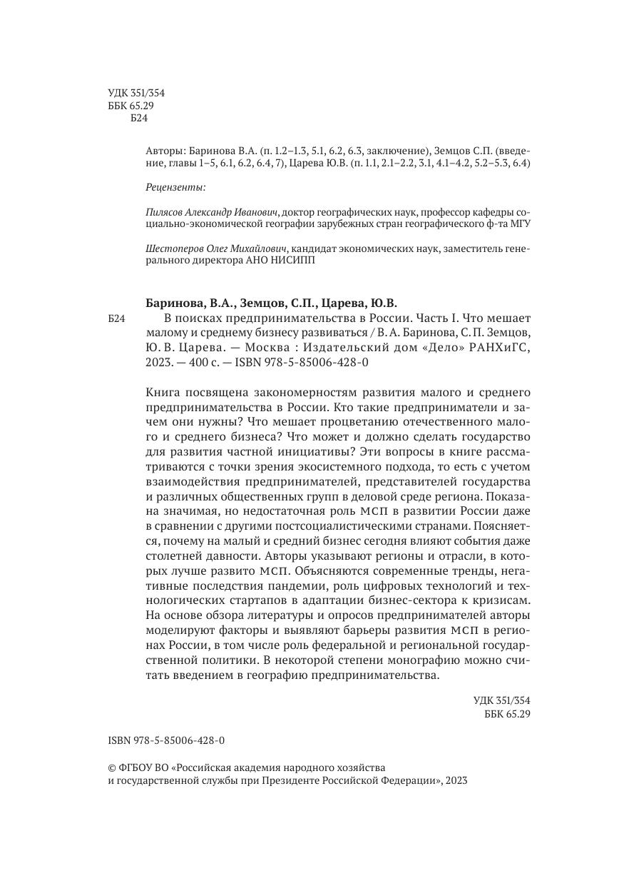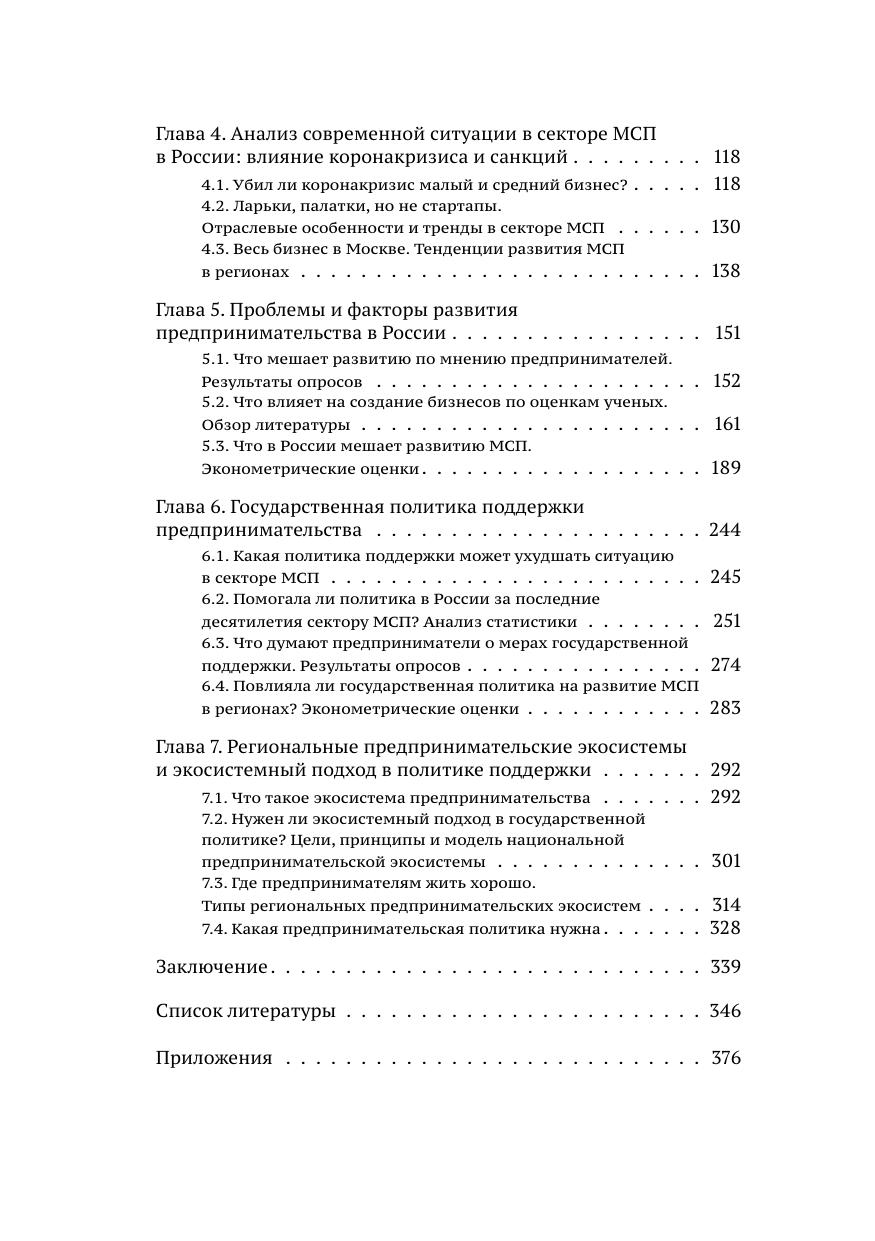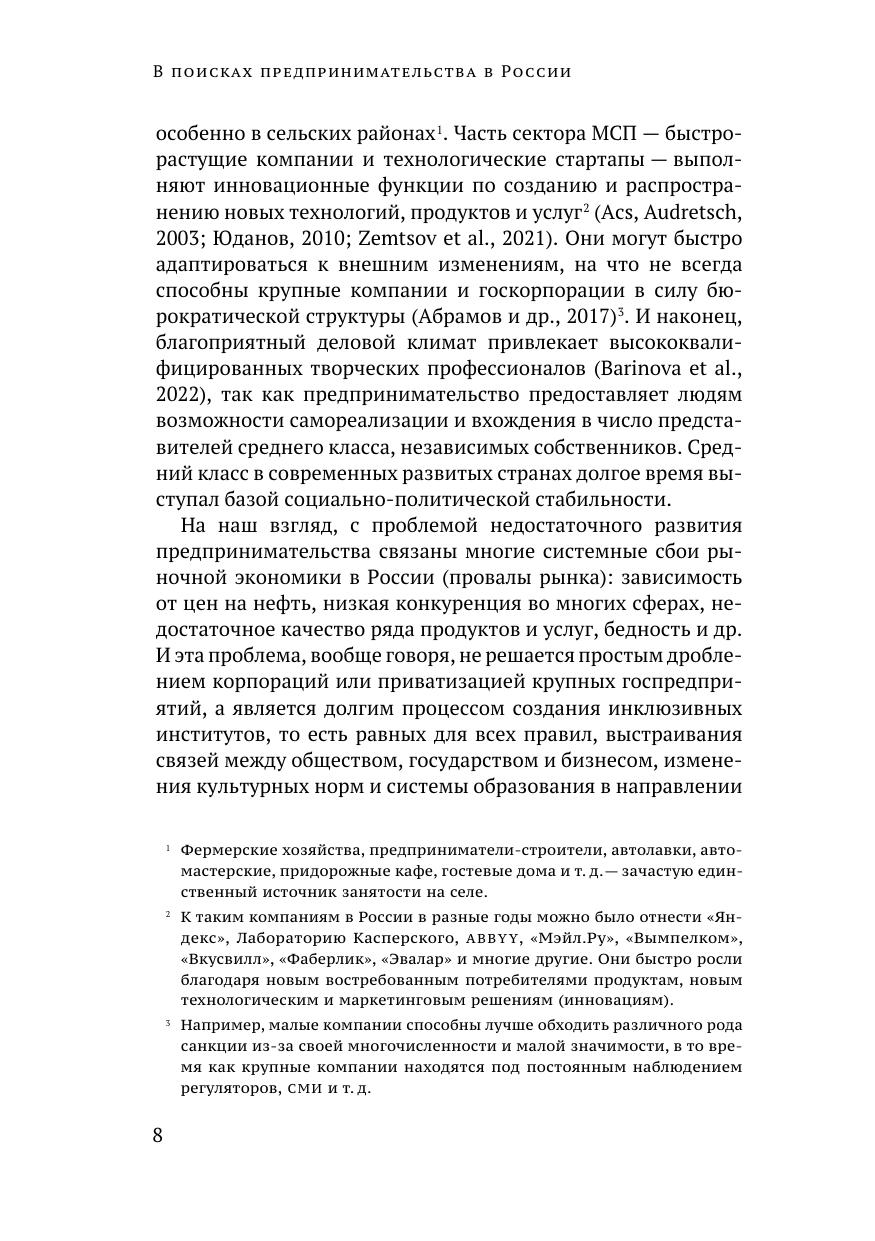 Книга посвящена закономерностям развития малого и среднего предпринимательства в России. Кто такие предприниматели и зачем они нужны? Что мешает процветанию отечественного малого и среднего бизнеса? Что может и должно сделать государство для развития частной инициативы? Эти вопросы в книге рассматриваются с точки зрения экосистемного подхода, то есть с учетом взаимодействия предпринимателей, представителей государства и различных общественных группы в деловой среде региона. Показана значимая, но недостаточная роль МСП в развитии России даже в сравнении с другими постсоциалистическими странами. Поясняется, почему на малый и средний бизнес сегодня влияют события даже столетней давности. Авторы указывают регионы и отрасли, в которых лучше развито МСП. Объясняются современные тренды, негативные последствия пандемии, роль цифровых технологий и технологических стартапов в адаптации бизнес-сектора к кризисам. На основе обзора литературы и опросов предпринимателей авторы моделируют факторы и выявляют барьеры развития МСП в регионах России, в том числе роль федеральной и региональной государственной политики. В некоторой степени монографию можно считать введением в географию предпринимательства.