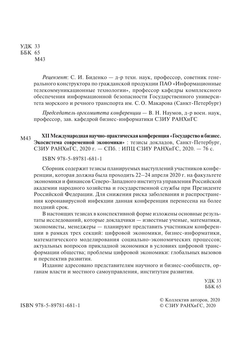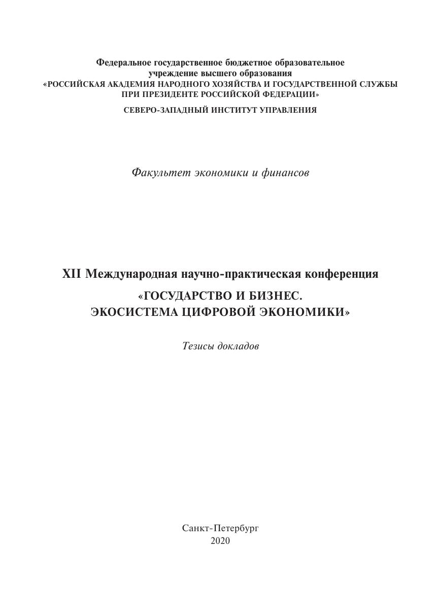 XII Международная научно-практическая конференция «Государство и бизнес. Экосистема современной экономики»: тезисы докладов, Санкт-Петербург, СЗИУ РАНХиГС, 2020 г.