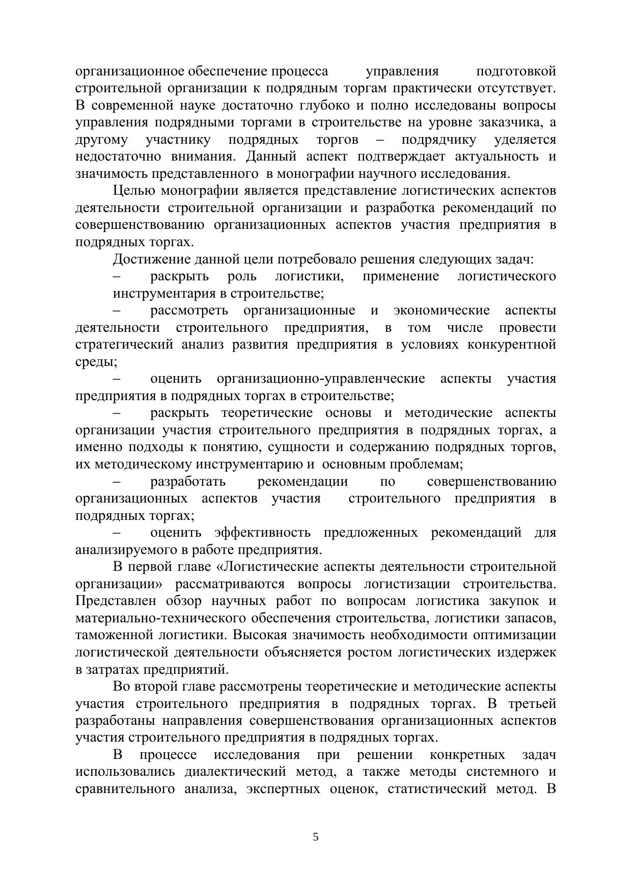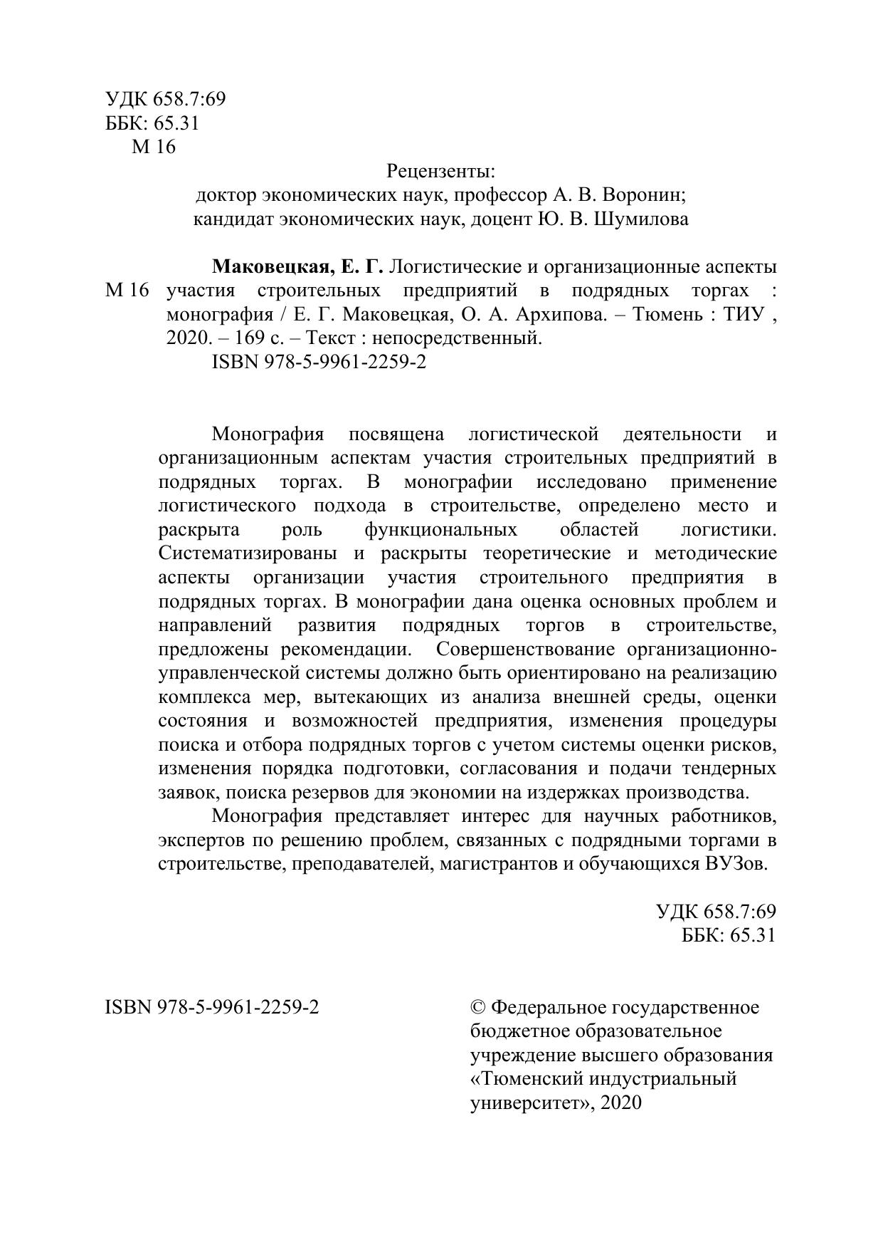 Монография посвящена логистической деятельности и организационным аспектам участия строительных предприятий в подрядных торгах. В монографии исследовано применение логистического подхода в строительстве, определено место и раскрыта роль функциональных областей логистики. Систематизированы и раскрыты теоретические и методические аспекты организации участия строительного предприятия в подрядных торгах. В монографии дана оценка основных проблем и направлений развития подрядных торгов в строительстве, предложены рекомендации. Совершенствование организационноуправленческой системы должно быть ориентировано на реализацию комплекса мер, вытекающих из анализа внешней среды, оценки состояния и возможностей предприятия, изменения процедуры поиска и отбора подрядных торгов с учетом системы оценки рисков, изменения порядка подготовки, согласования и подачи тендерных заявок, поиска резервов для экономии на издержках производства. Монография представляет интерес для научных работников, экспертов по решению проблем, связанных с подрядными торгами в строительстве, преподавателей, магистрантов и обучающихся ВУЗов