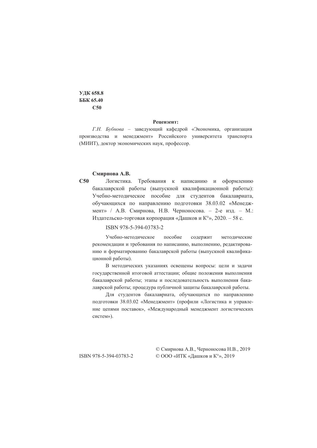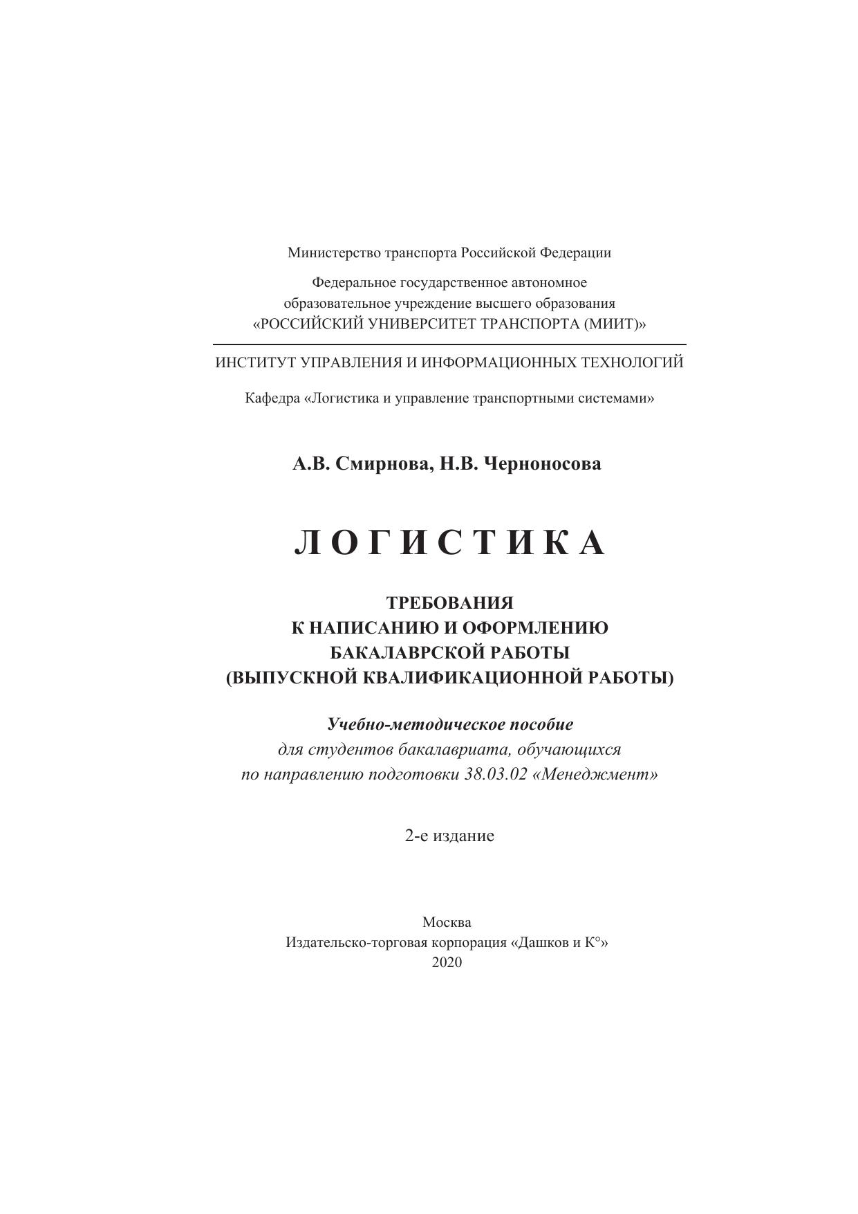 Учебно-методическое пособие содержит методические рекомендации и требования по написанию, выполнению, редактированию и форматированию бакалаврской работы (выпускной квалификационной работы). В методических указаниях освещены вопросы: цели и задачи государственной итоговой аттестации; общие положения выполнения бакалаврской работы; этапы и последовательность выполнения бакалаврской работы; процедура публичной защиты бакалаврской работы. Для студентов бакалавриата, обучающихся по направлению подготовки 38.03.02 «Менеджмент» (профили «Логистика и управление цепями поставок», «Международный менеджмент логистических систем»).