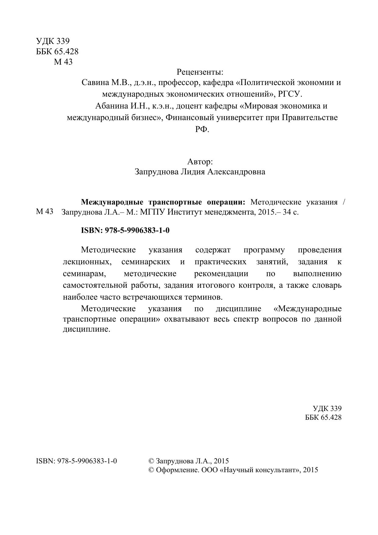 Методические указания содержат программу проведения лекционных, семинарских и практических занятий, задания к семинарам, методические рекомендации по выполнению самостоятельной работы, задания итогового контроля, а также словарь наиболее часто встречающихся терминов. Методические указания по дисциплине «Международные транспортные операции» охватывают весь спектр вопросов по данной дисциплине.