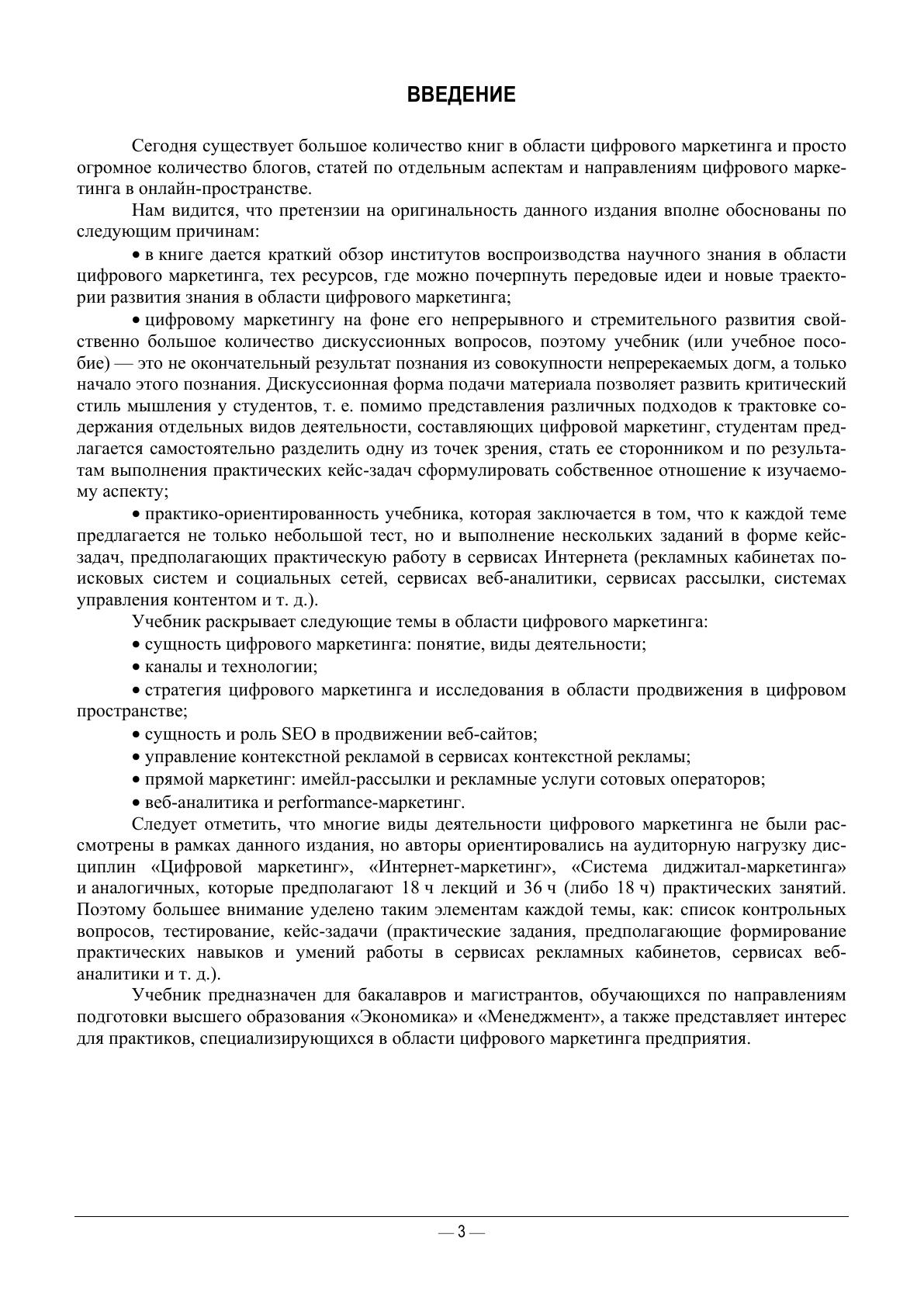 Цифровому маркетингу как стремительно развивающейся практике свойственно большое количество дискуссионных вопросов. Данный учебник — это не окончательный результат познания, состоящий из непреклонных догм, а лишь начало процесса познания цифрового маркетинга. Дискуссионная форма подачи материала позволяет развить критический стиль мышления у студентов, так как учебник предлагает самостоятельно разделить одну из представленных точек зрения, стать ее сторонником и по результатам выполнения предложенных задач сформулировать собственное отношение к изучаемому предмету. В помощь самостоятельному мышлению студентов дается краткий обзор тех ресурсов, где можно почерпнуть передовые идеи в области цифрового маркетинга. Практико-ориентированность учебника состоит в том, что к каждой теме предлагается не только проверочный тест, но несколько кейс-задач, выполнение которых стимулирует практическую работу в сервисах Интернета (рекламных кабинетах поисковых систем и социальных сетей, сервисах веб-аналитики, сервисах рассылки, системах управления контентом и т. д.). Учебник предназначен для бакалавров и магистрантов, обучающихся по направлениям подготовки «Экономика», «Менеджмент», а также представляет интерес для практиков, специализирующихся на цифровом маркетинге предприятия.