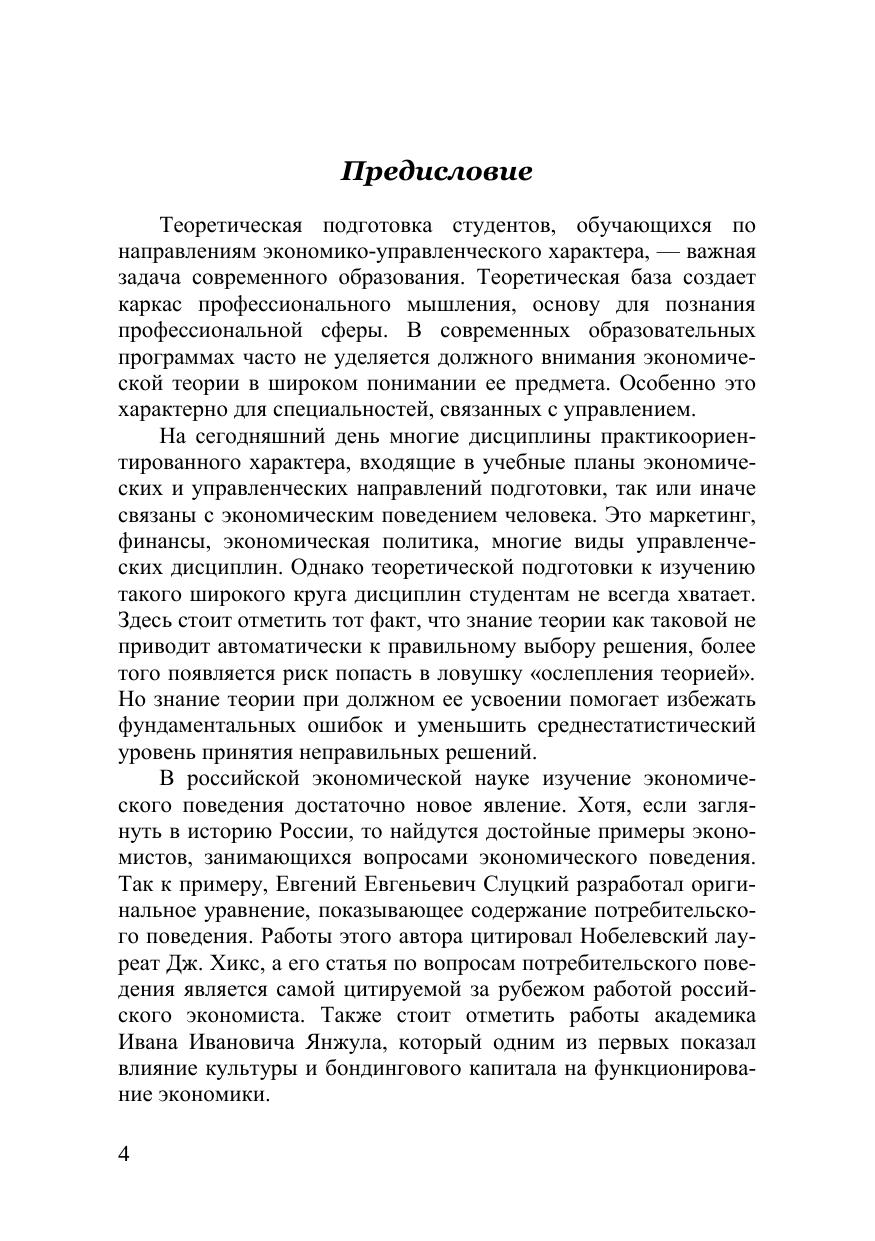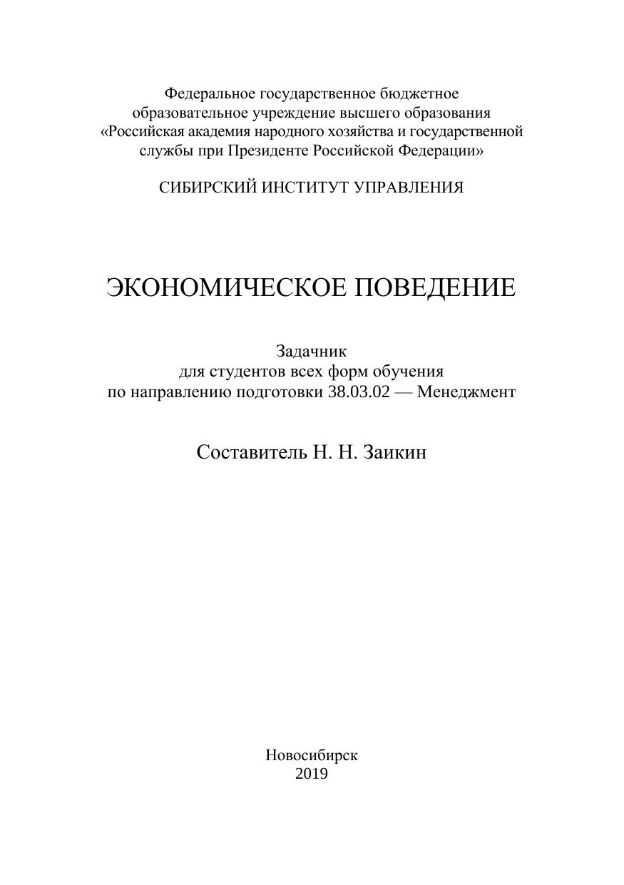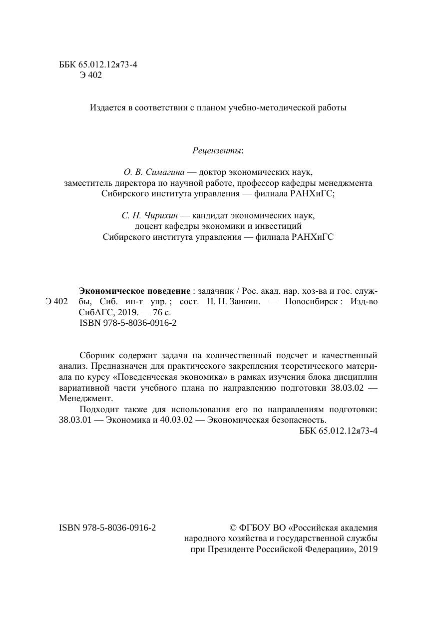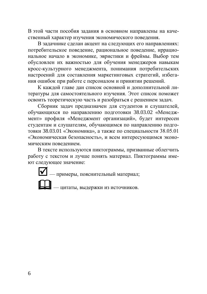 Сборник содержит задачи на количественный подсчет и качественный анализ. Предназначен для практического закрепления теоретического матери-ала по курсу «Поведенческая экономика» в рамках изучения блока дисциплин вариативной части учебного плана по направлению подготовки 38.03.02 — Менеджмент. Подходит также для использования его по направлениям подготовки: 38.03.01 — Экономика и 40.03.02 — Экономическая безопасность.