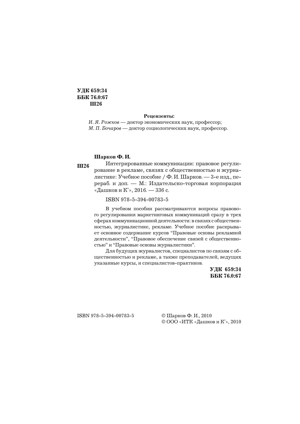 В учебном пособии рассматриваются вопросы правового регулирования маркетинговых коммуникаций сразу в трех сферах коммуникационной деятельности: в связях с общественностью, журналистике, рекламе. Учебное пособие раскрывает основное содержание курсов “Правовые основы рекламной деятельности”, “Правовое обеспечение связей с общественностью” и “Правовые основы журналистики”. Для будущих журналистов, специалистов по связям с общественностью и рекламе, а также преподавателей, ведущих указанные курсы, и специалистов+практиков.