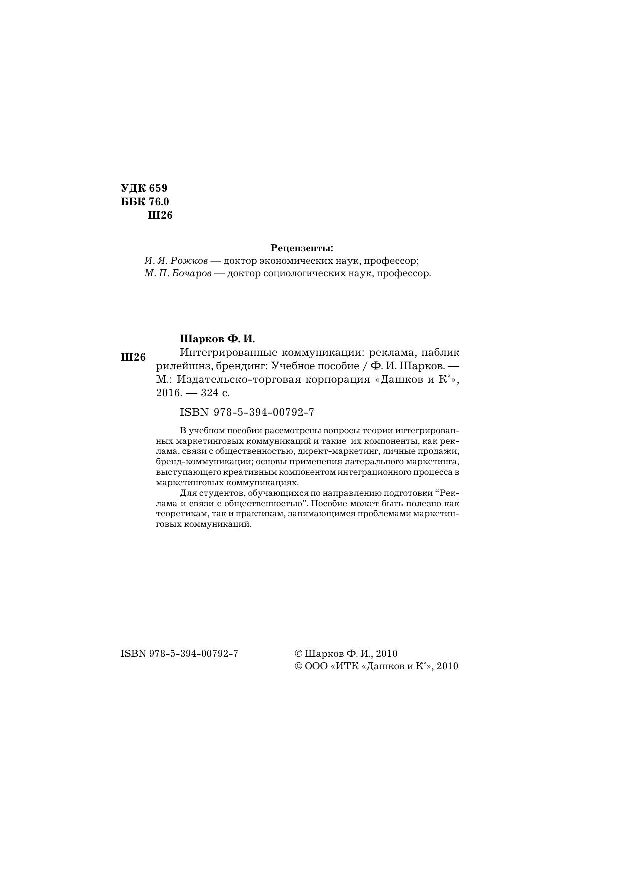 В учебном пособии рассмотрены вопросы теории интегрированных маркетинговых коммуникаций и такие их компоненты, как реклама, связи с общественностью, директ-маркетинг, личные продажи, бренд-коммуникации; основы применения латерального маркетинга, выступающего креативным компонентом интеграционного процесса в маркетинговых коммуникациях. Для студентов, обучающихся по направлению подготовки “Реклама и связи с общественностью”. Пособие может быть полезно как теоретикам, так и практикам, занимающимся проблемами маркетинговых коммуникаций.