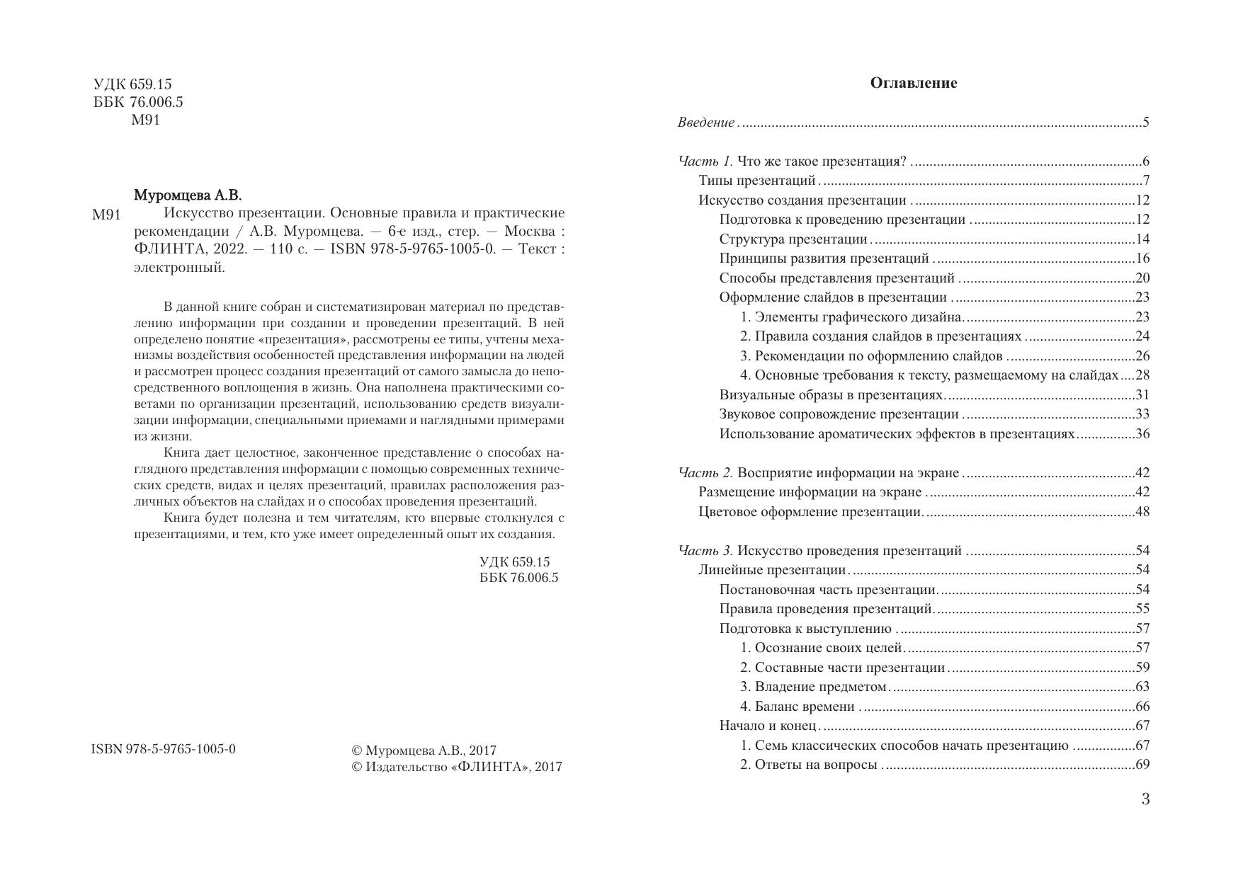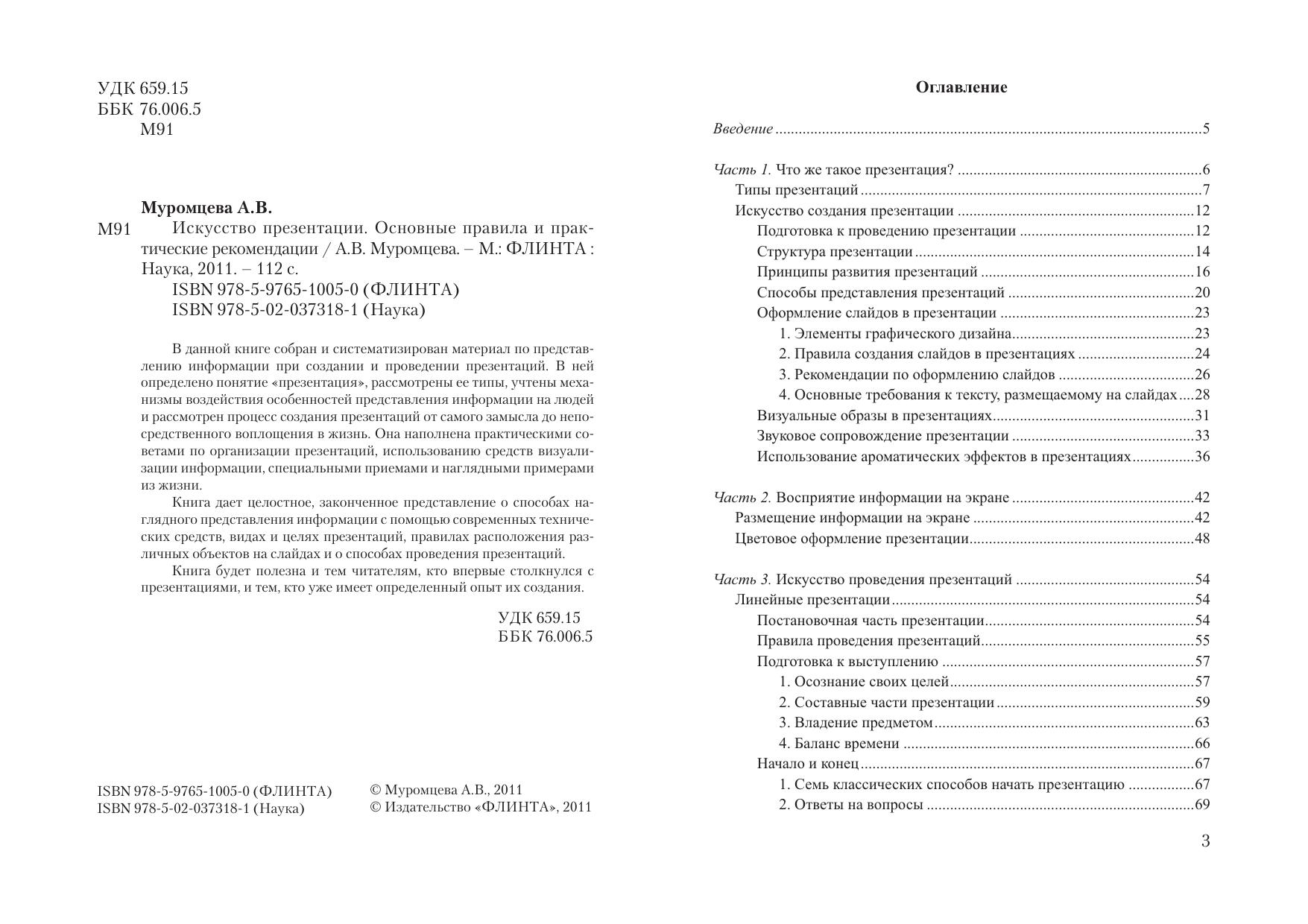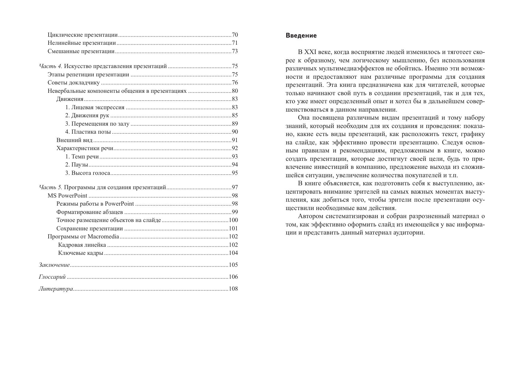 Книга дает целостное, законченное представление о способах наглядного представления информации с помощью современных технических средств, видах и целях презентаций, правилах расположения различных объектов на слайдах и о способах проведения презентаций.