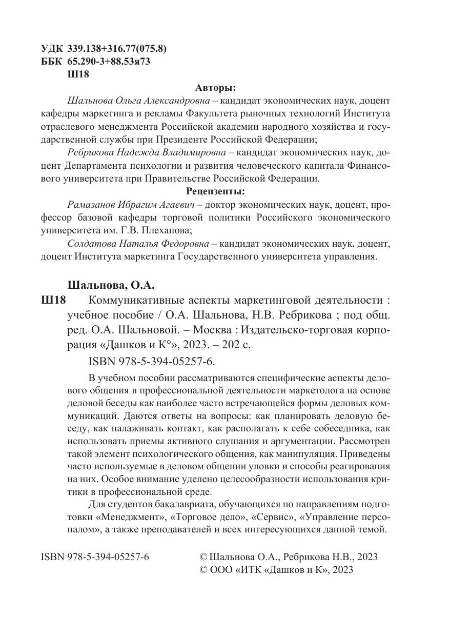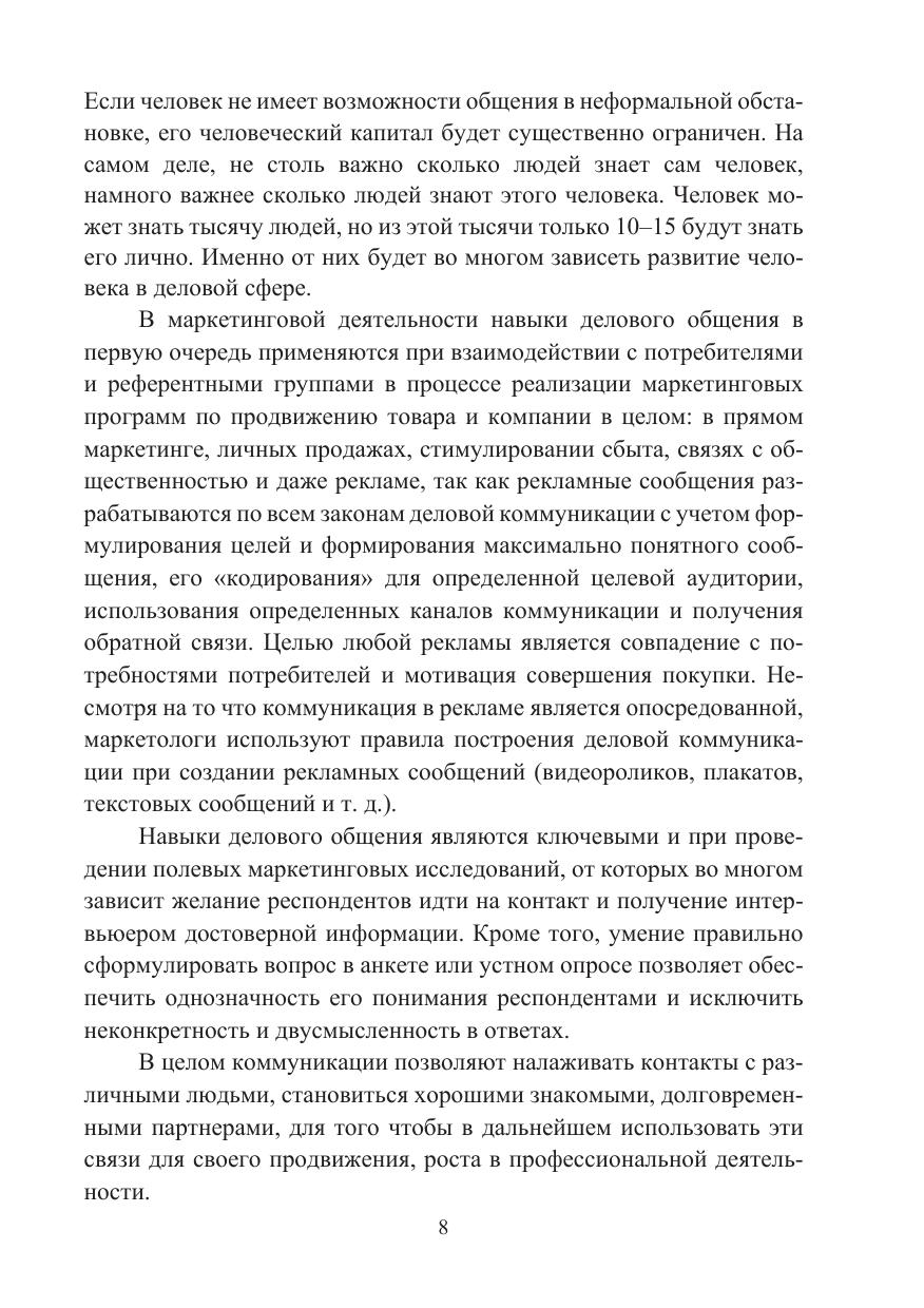 В учебном пособии рассматриваются специфические аспекты делового общения в профессиональной деятельности маркетолога на основе деловой беседы как наиболее часто встречающейся формы деловых коммуникаций. Даются ответы на вопросы: как планировать деловую беседу, как налаживать контакт, как располагать к себе собеседника, как использовать приемы активного слушания и аргументации. Рассмотрен такой элемент психологического общения, как манипуляция. Приведены часто используемые в деловом общении уловки и способы реагирования на них. Особое внимание уделено целесообразности использования критики в профессиональной среде.