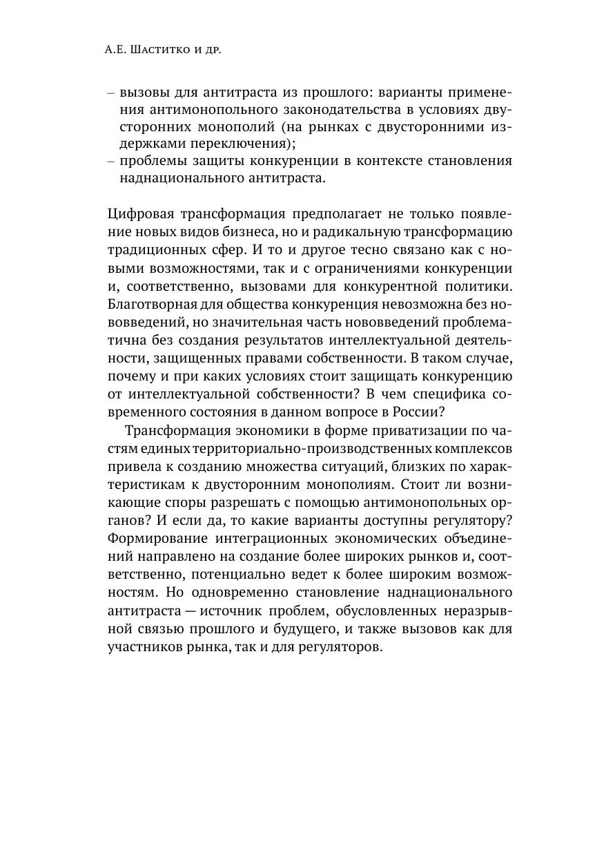 В докладе рассмотрены четыре актуальных направления конкурентной политики, связанных как с новыми явлениями, так и с традиционными сюжетами антитраста.) Цифровая трансформация ведет к возникновению новых стратегий бизнеса, однако возникают новые источники рисков ограничения конкуренции: алгоритмическое ценообразование, большие данные, многосторонние рынки, платформы.) Импорт технологий и политические санкции могут снизить эффективность применения антимонопольного иммунитета для обладателей исключительных прав на результаты интеллектуальной деятельности (РИД). Необходим поэтапный переход к новому режиму антимонопольной политики в сфере обращения РИД.) Развитие наднационального антитраста способствует использованию взаимодополняющих возможностей антимонопольных органов разных стран. Барьерами для наднационального антитраста выступают разнородность государств-участников и недостаточная устойчивость наднациональных антимонопольных органов.) Проблема двусторонней монополии не теряет актуальности. Высокие трансакционные издержки и отрицательные внешние эффекты от недостижения сторонами договоренности — основание для государственного вмешательства с использованием сравнительных преимуществ антимонопольного органа.