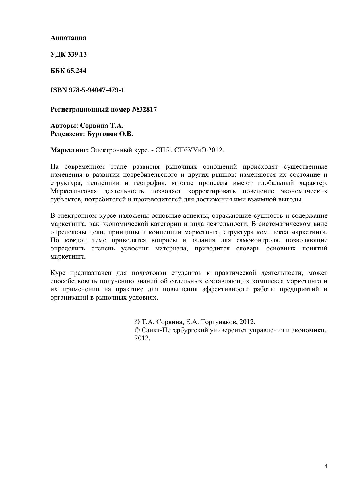 На современном этапе развития рыночных отношений происходят существенные изменения в развитии потребительского и других рынков: изменяются их состояние и структура, тенденции и география, многие процессы имеют глобальный характер. Маркетинговая деятельность позволяет корректировать поведение экономических субъектов, потребителей и производителей для достижения ими взаимной выгоды. В электронном курсе изложены основные аспекты, отражающие сущность и содержание маркетинга, как экономической категории и вида деятельности. В систематическом виде определены цели, принципы и концепции маркетинга, структура комплекса маркетинга. По каждой теме приводятся вопросы и задания для самоконтроля, позволяющие определить степень усвоения материала, приводится словарь основных понятий маркетинга. Курс предназначен для подготовки студентов к практической деятельности, может способствовать получению знаний об отдельных составляющих комплекса маркетинга и их применении на практике для повышения эффективности работы предприятий и организаций в рыночных условиях.