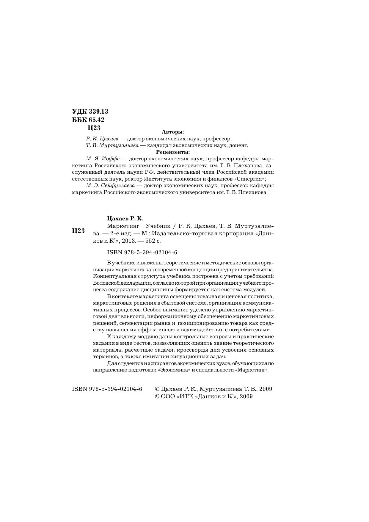 В учебнике изложены теоретические и методологические основы организации маркетинга как современной концепции предпринимательства. Концептуальная структура учебника построена с учетом требований Болонской декларации, согласно которой при организации учебного процесса содержание дисциплины формируется как система модулей.В контексте маркетинга освещены товарная и ценовая политика, маркетинговые решения в сбытовой системе, организация коммуникативных процессов. Особое внимание уделено управлению маркетинговой деятельности, информационному обеспечению маркетинговых решений, сегментации рынка и позиционированию товара как средству повышения эффективности взаимодействия с потребителями.К каждому модулю даны контрольные вопросы и практические задания в виде тестов, позволяющих оценить знания теоретического материала, расчетные задачи, кроссворды для усвоения основных терминов, а также имитации ситуационных задач. Для студентов и аспирантов экономических вузов, обучающихся по направлению подготовки ""Экономика"" и специальности ""Маркетинг"". Гриф
