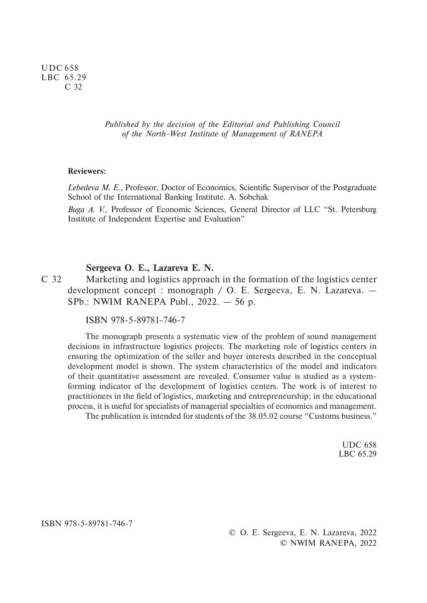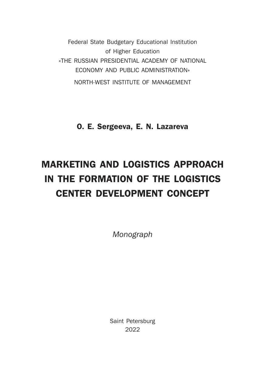 The monograph presents a systematic view of the problem of sound management decisions in infrastructure logistics projects. The marketing role of logistics centers in ensuring the optimization of the seller and buyer interests described in the conceptual development model is shown. The system characteristics of the model and indicators of their quantitative assessment are revealed. Consumer value is studied as a systemforming indicator of the development of logistics centers. The work is of interest to practitioners in the field of logistics, marketing and entrepreneurship; in the educational process, it is useful for specialists of managerial specialties of economics and management. The publication is intended for students of the 38.05.02 course “Customs business.”