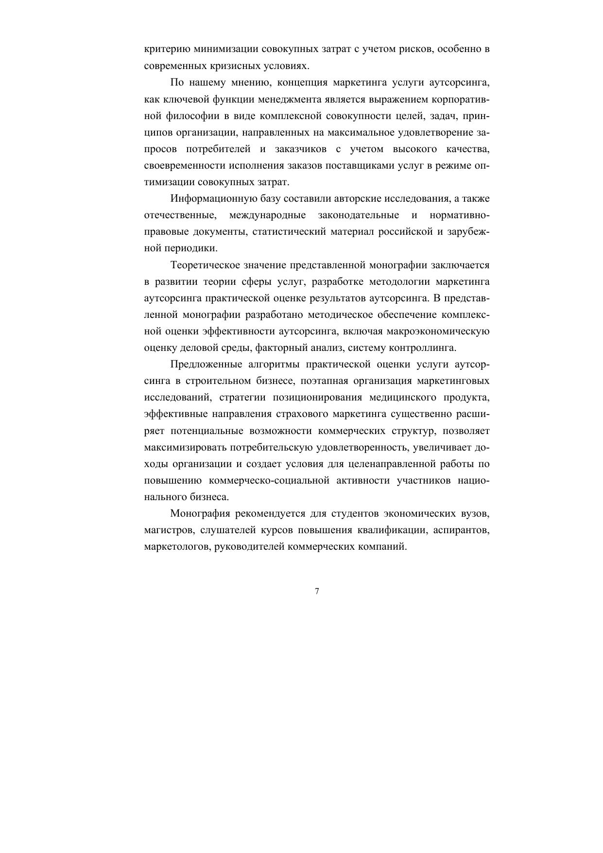 Рассматривается широкий круг вопросов, посвященных теоретическим аспектам формирования маркетинга аутсорсинга на различных строительных, образовательных и страховых рынках с учетом современных тенденций и закономерностей. В логической последовательности исследуется маркетинг аутсорсинга с обоснованием места в системе менеджмента и выделением содержания концепции маркетинга услуг аутсорсинга и специфики логистических услуг аутсорсинга. С использованием оригинальных моделей и алгоритмов расчета монография знакомит с новыми методологическими подходами к позиционированию, обоснованию экономической целесообразности аутсорсинга и комплексной оценке результатов в целях получения синергетического эффекта в отечественном бизнесе. Для научных работников, студентов бакалавриата и магистратуры экономических вузов, аспирантов, маркетологов, руководителей коммерческих компаний строительного, образовательного и страхового сектора национальной экономики.
