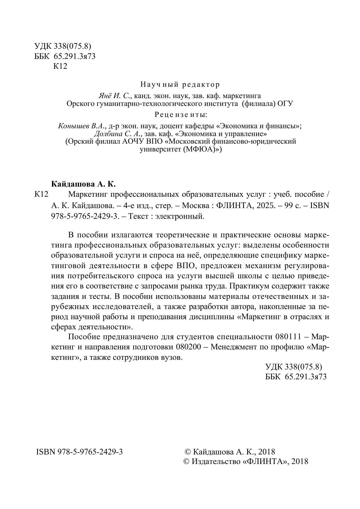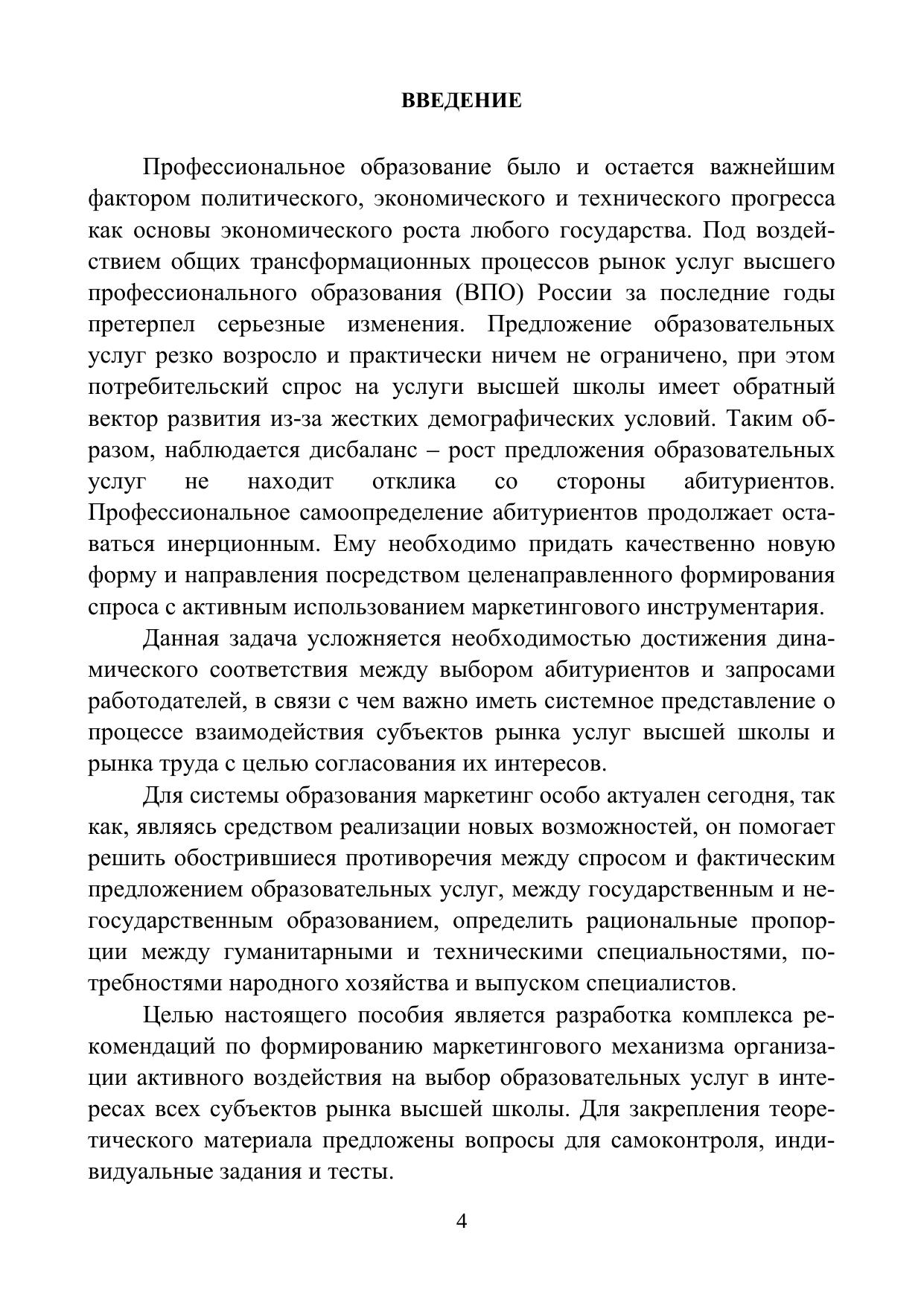В пособии излагаются теоретические и практические основы маркетинга профессиональных образовательных услуг: выделены особенности образовательной услуги и спроса на неё, определяющие специфику маркетинговой деятельности в сфере ВПО, предложен механизм регулирования потребительского спроса на услуги высшей школы с целью приведения его в соответствие с запросами рынка труда. Практикум содержит также задания и тесты. В пособии использованы материалы отечественных и зарубежных исследователей, а также разработки автора, накопленные за период научной работы и преподавания дисциплины «Маркетинг в отраслях и сферах деятельности». Пособие предназначено для студентов специальности 080111 – Маркетинг и направления подготовки 080200 – Менеджмент по профилю «Маркетинг», а также сотрудников вузов.