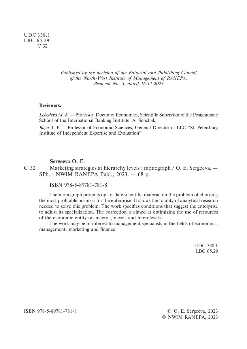 Тhe monograph presents up-to-date scientific material on the problem of choosing the most profitable business for the enterprise. It shows the totality of analytical research needed to solve this problem. The work specifies conditions that suggest the enterprise to adjust its specialization. The correction is aimed at optimizing the use of resources of the economic entity on macro-, meso- and microlevels. The work may be of interest to management specialists in the fields of economics, management, marketing and finance.